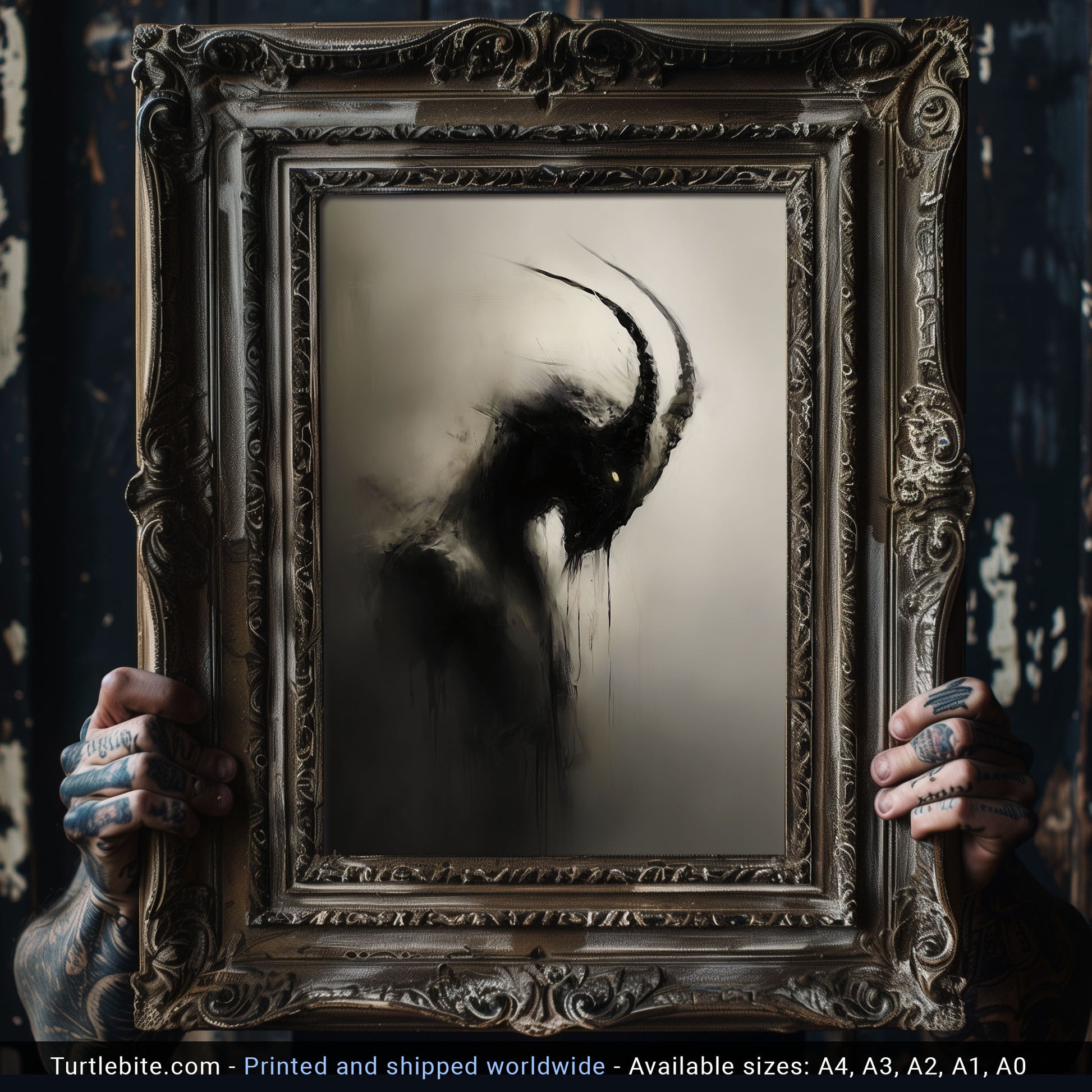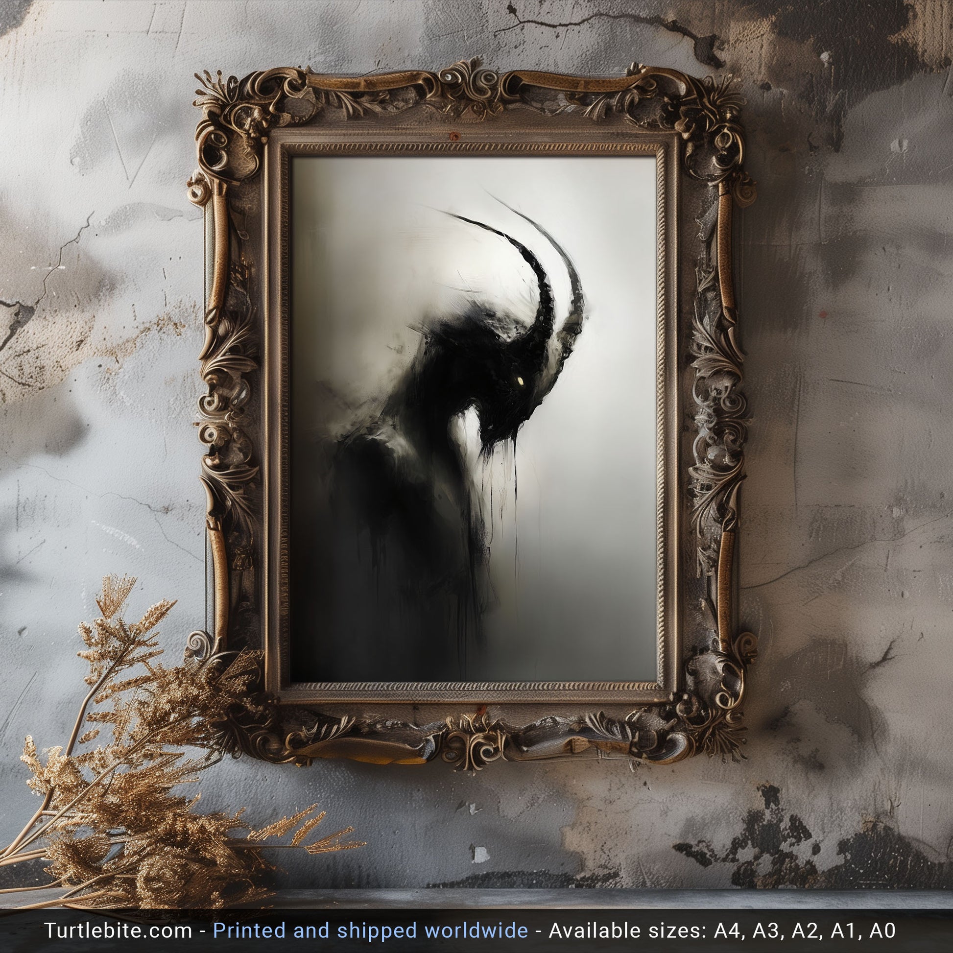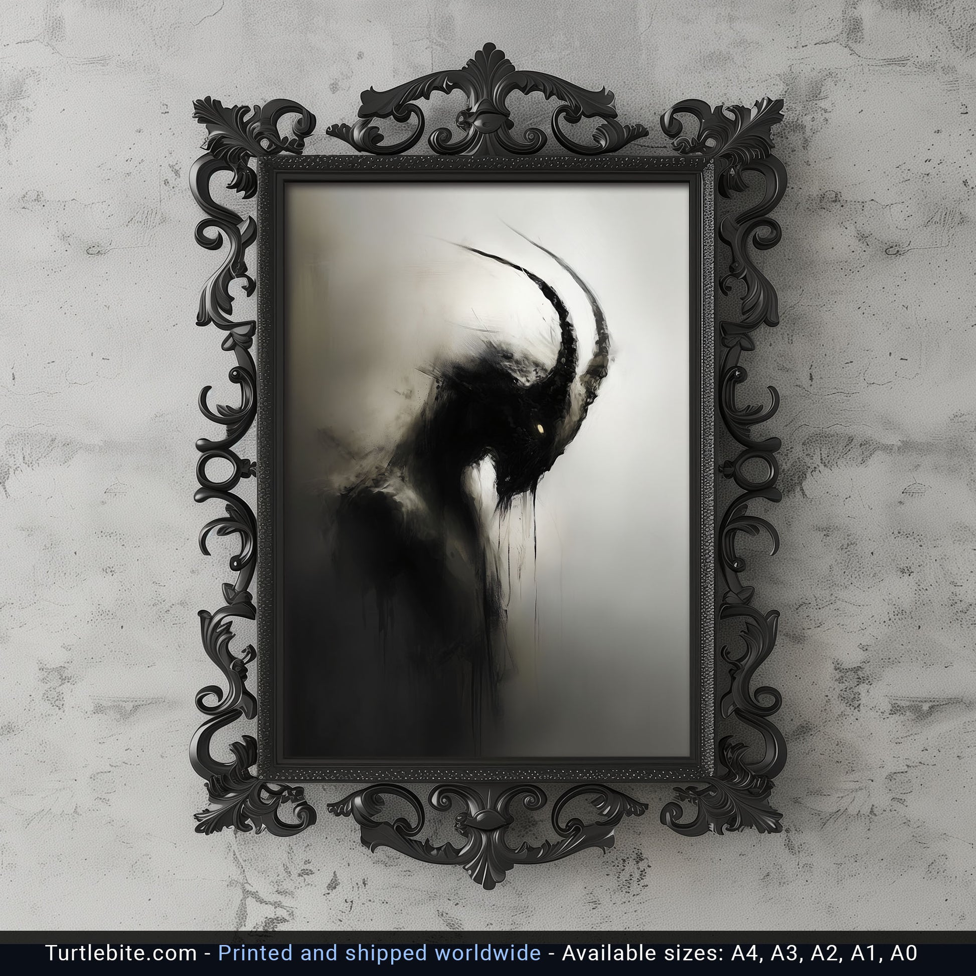 Enhance your space with this haunting dark capricorn creature painting poster. This creepy mysterious wall art is perfect for lovers of all things spooky and gothic. Add a touch of whimsigoth charm to your decor with this unique eerie print. Elevate your walls with this gothic wall art painting today!