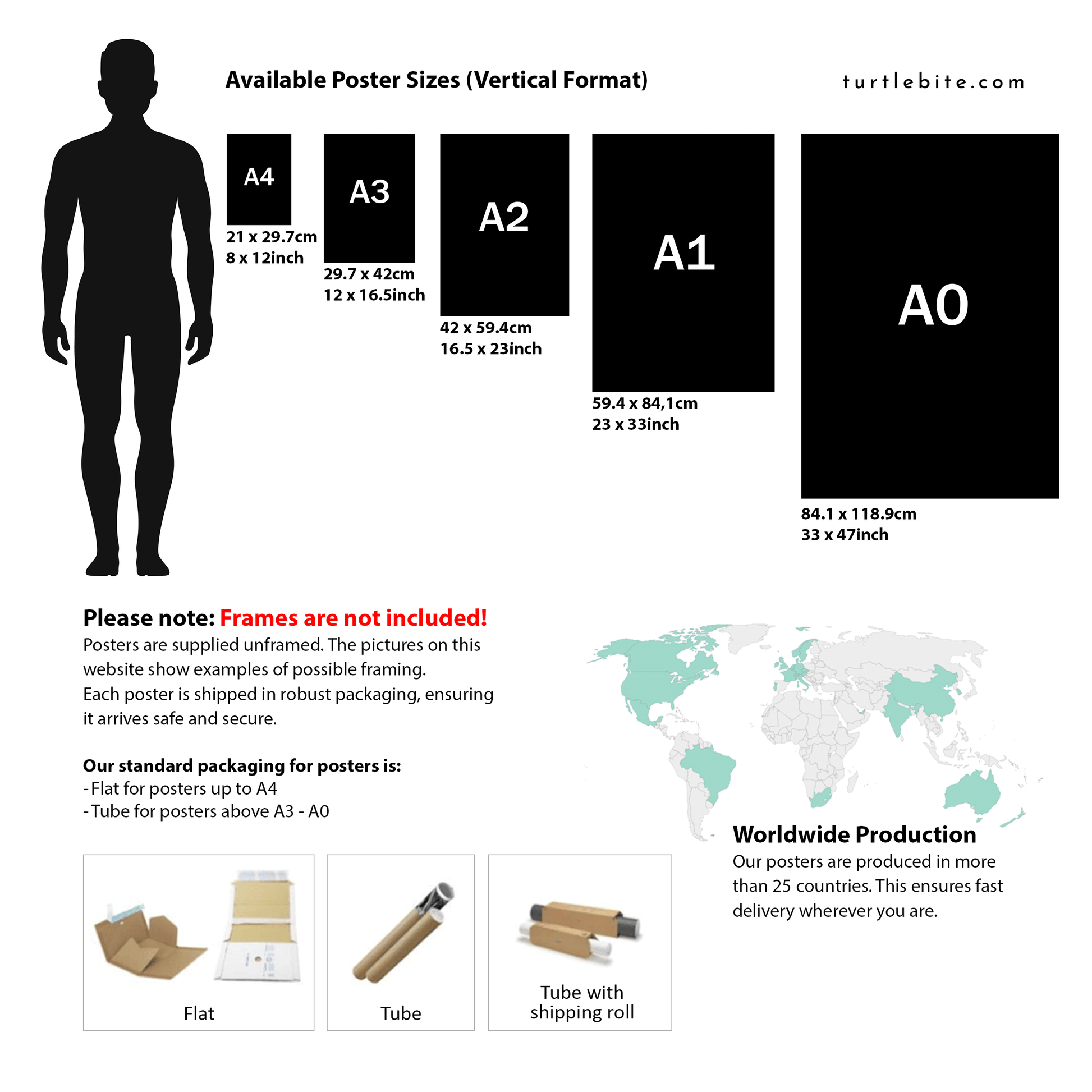 Different packaging depending on the size of the poster as well as the country where the item is produced and shipped to. Larger prints are carefully rolled and shipped in a tube, without framing included. Each of these products is crafted specifically for you upon ordering, so please allow a bit more time for delivery.