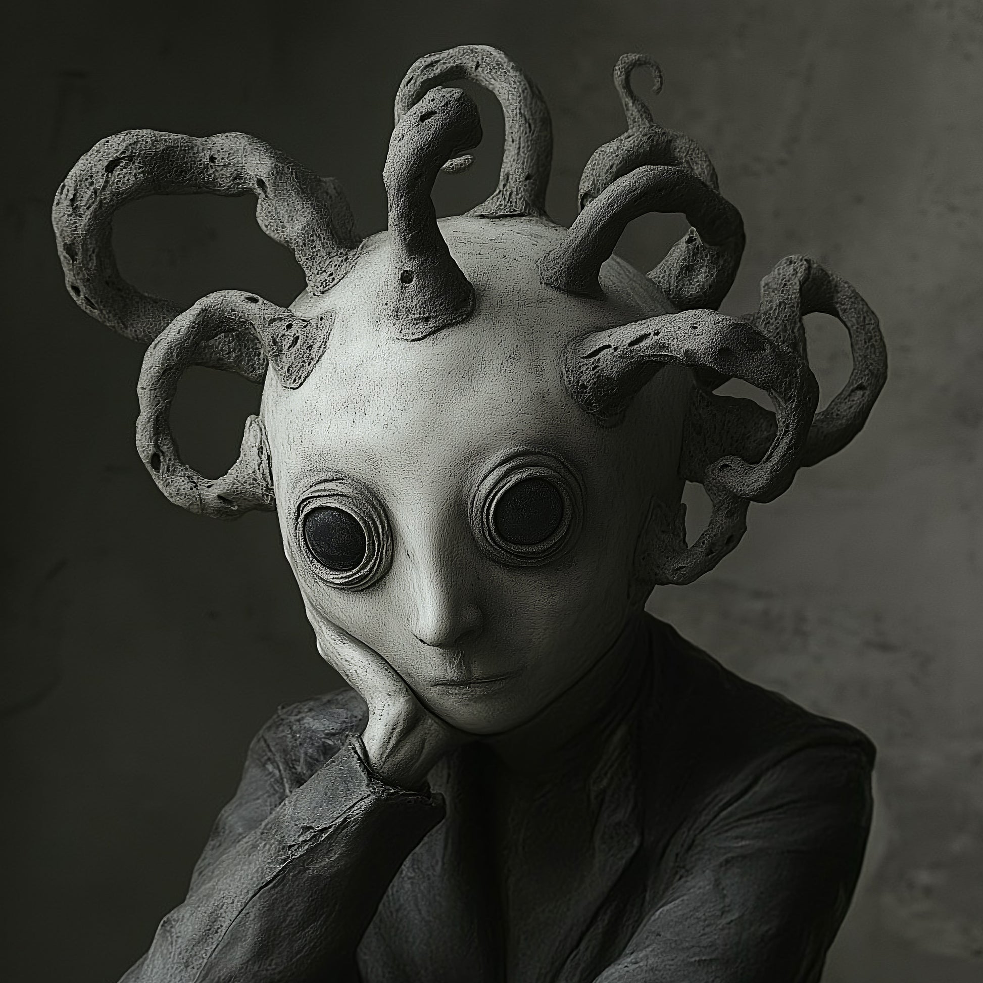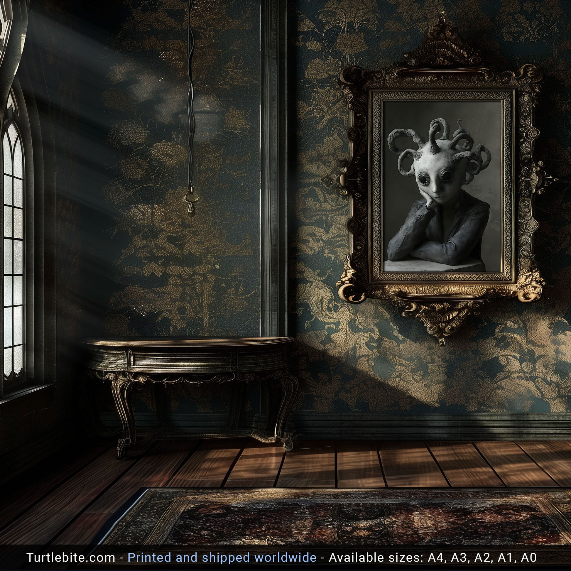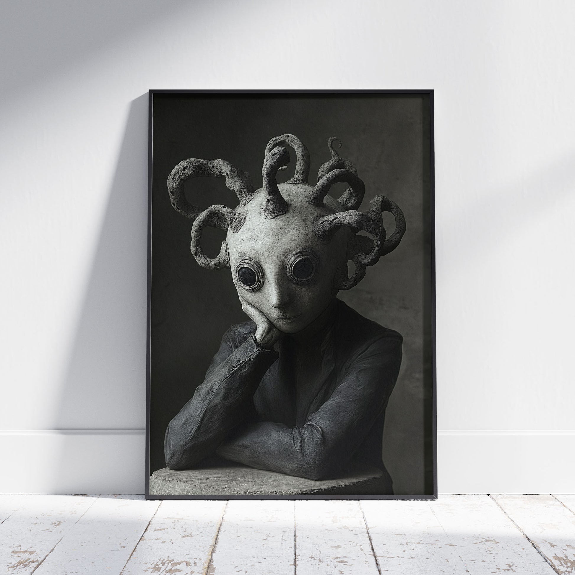 Add a touch of surreal darkness to your space with our Concrete Thinker Poster. This dark wall art is perfect for minimalists seeking a unique piece to spark conversation. Elevate your decor with this striking and thought-provoking print today.
