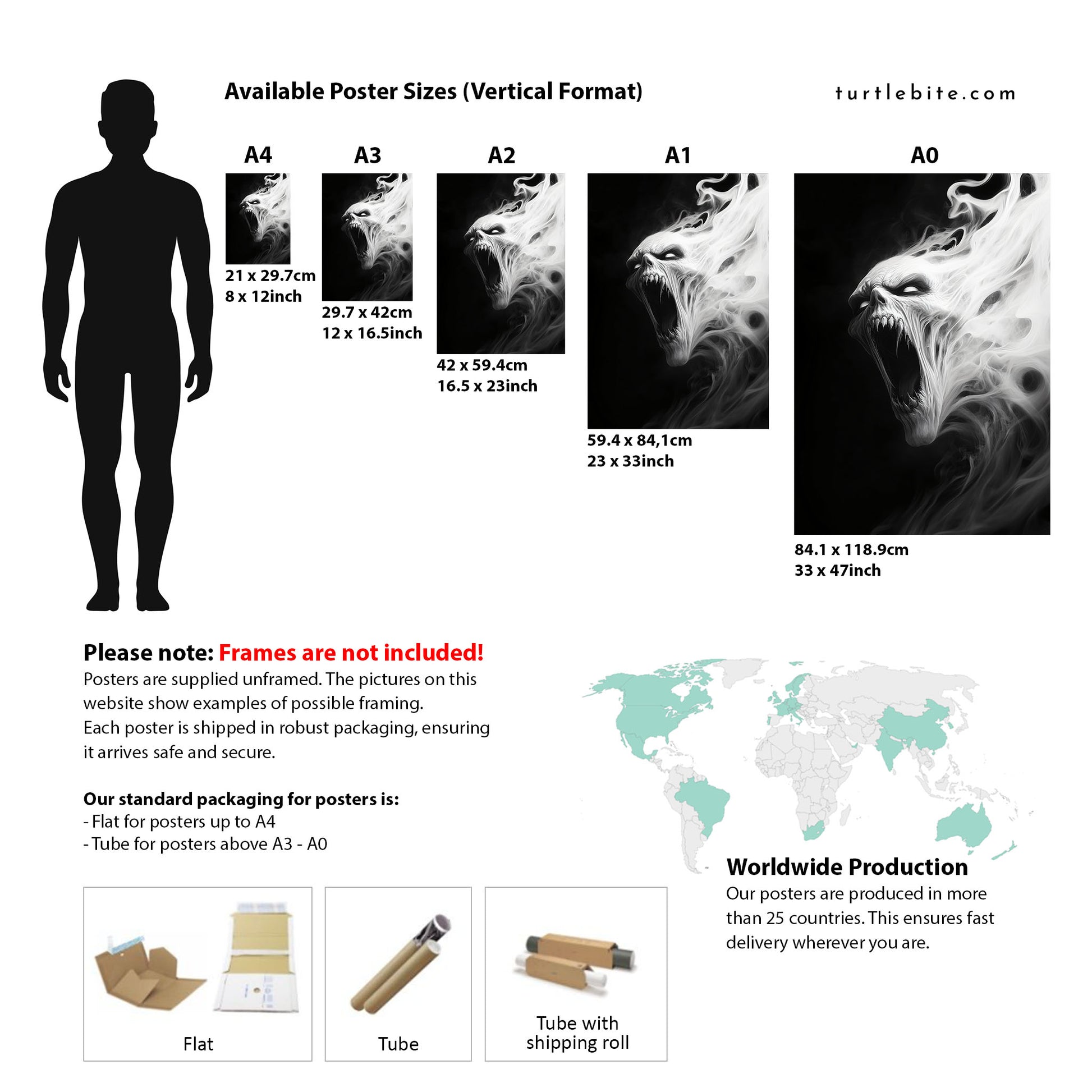 Different packaging depending on the size of the poster as well as the country where the item is produced and shipped to. Larger prints are carefully rolled and shipped in a tube, without framing included. Each of these products is crafted specifically for you upon ordering, so please allow a bit more time for delivery.