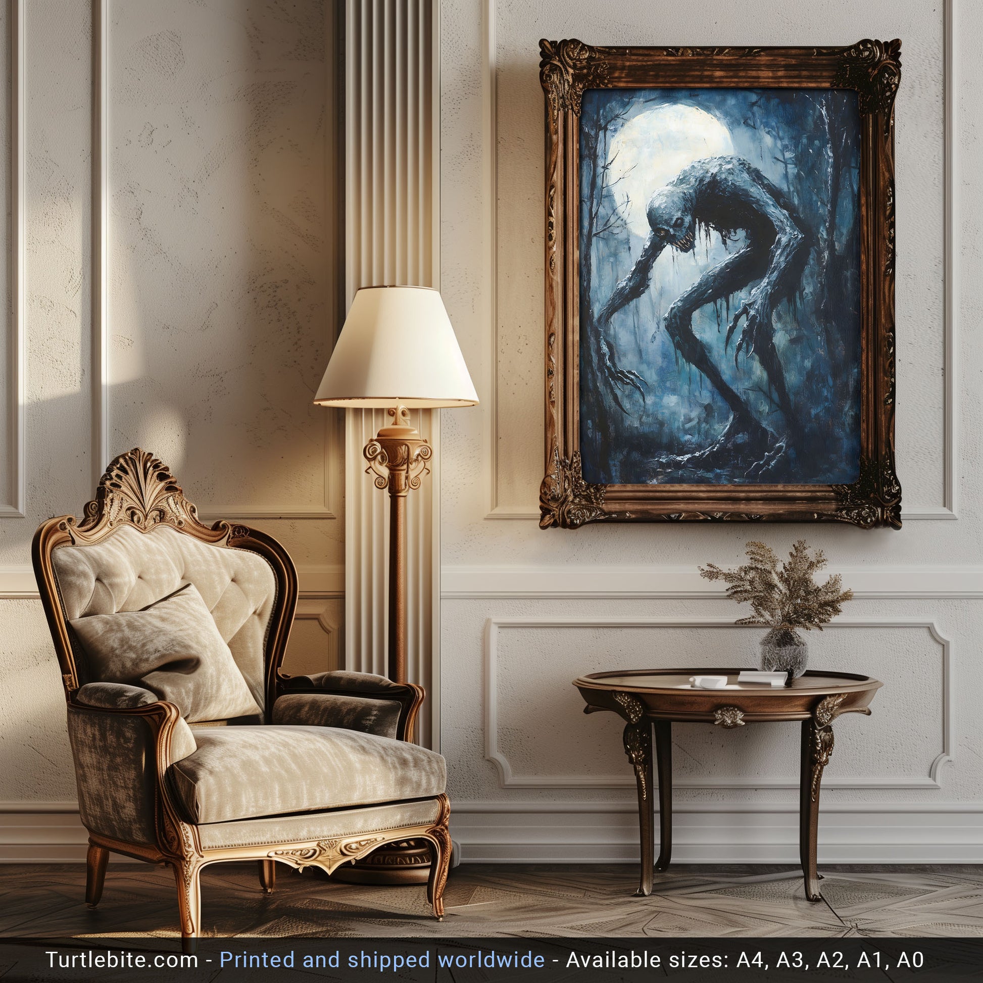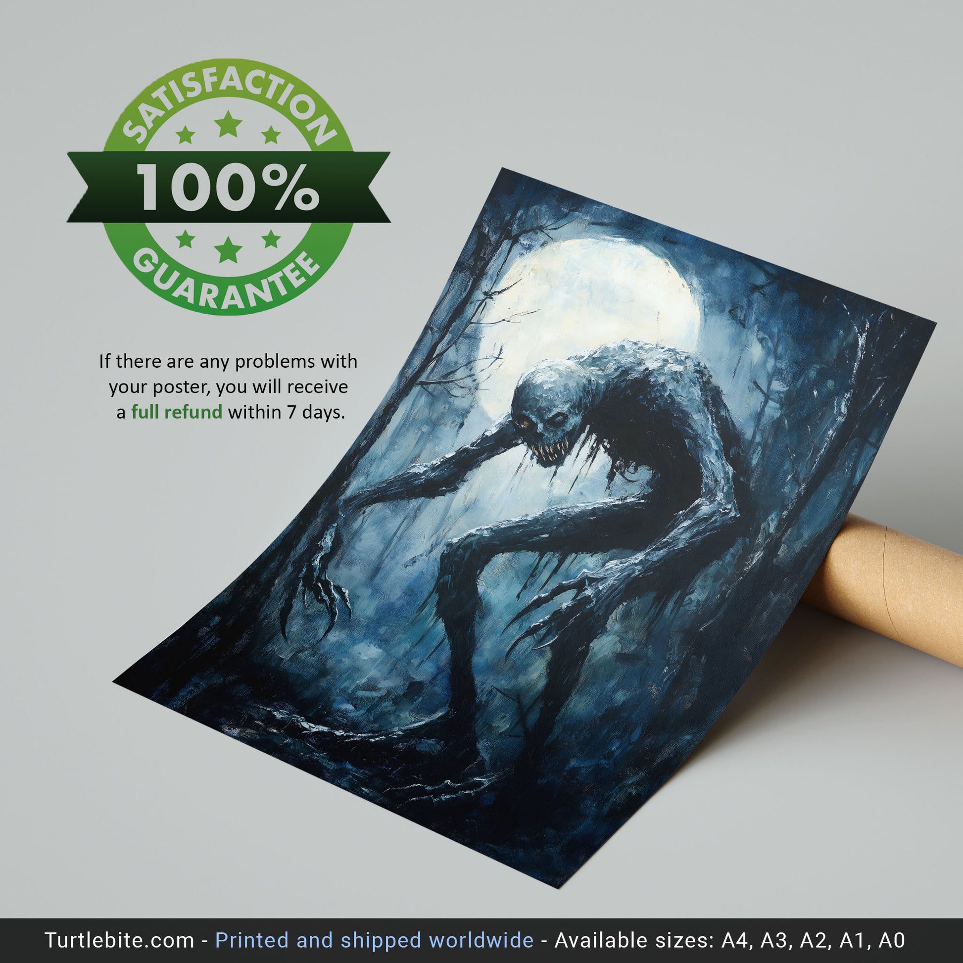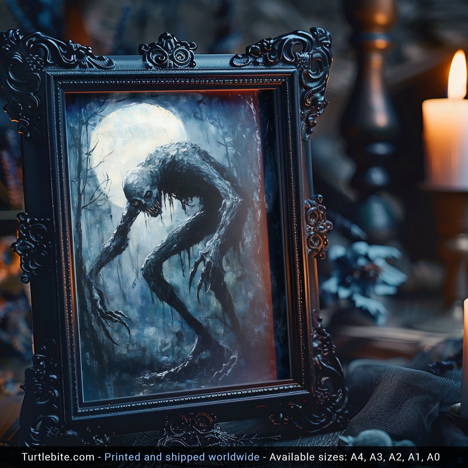Bring an element of the mystical and mysterious into your space with our "Creepy Hunched Over Monster in the Moonlight" poster print. This captivating artwork features a haunting creature lurking in the shadows, bathed in eerie moonlight. The whimsical yet unsettling design adds a unique touch of fantasy and intrigue to any room. Perfect for those who love the mystical and otherworldly, this art print is an ideal piece for adding depth and atmosphere to your decor. Whether displayed in a living room, bedroom, or office, it serves as a conversation starter and a window into a world of mystery.