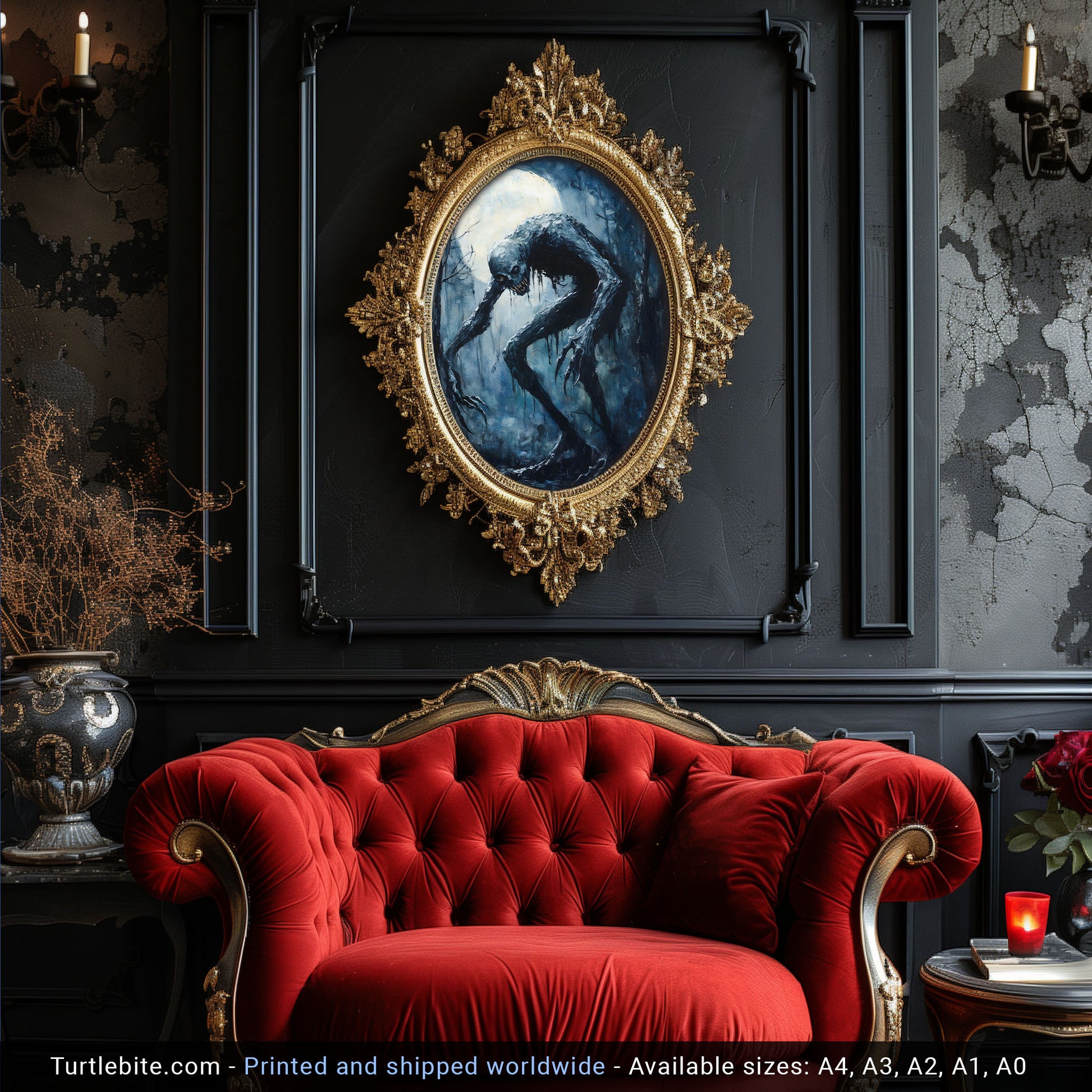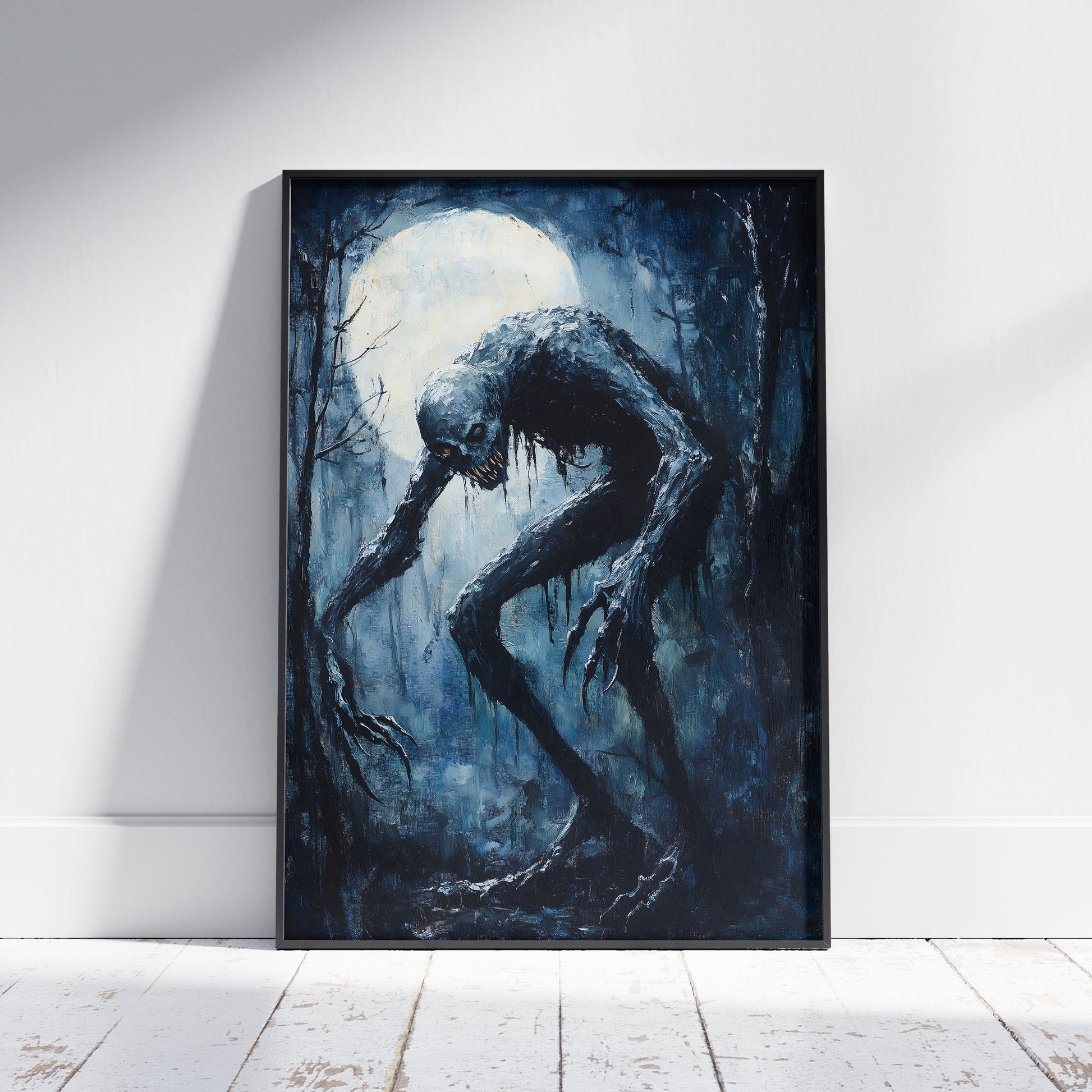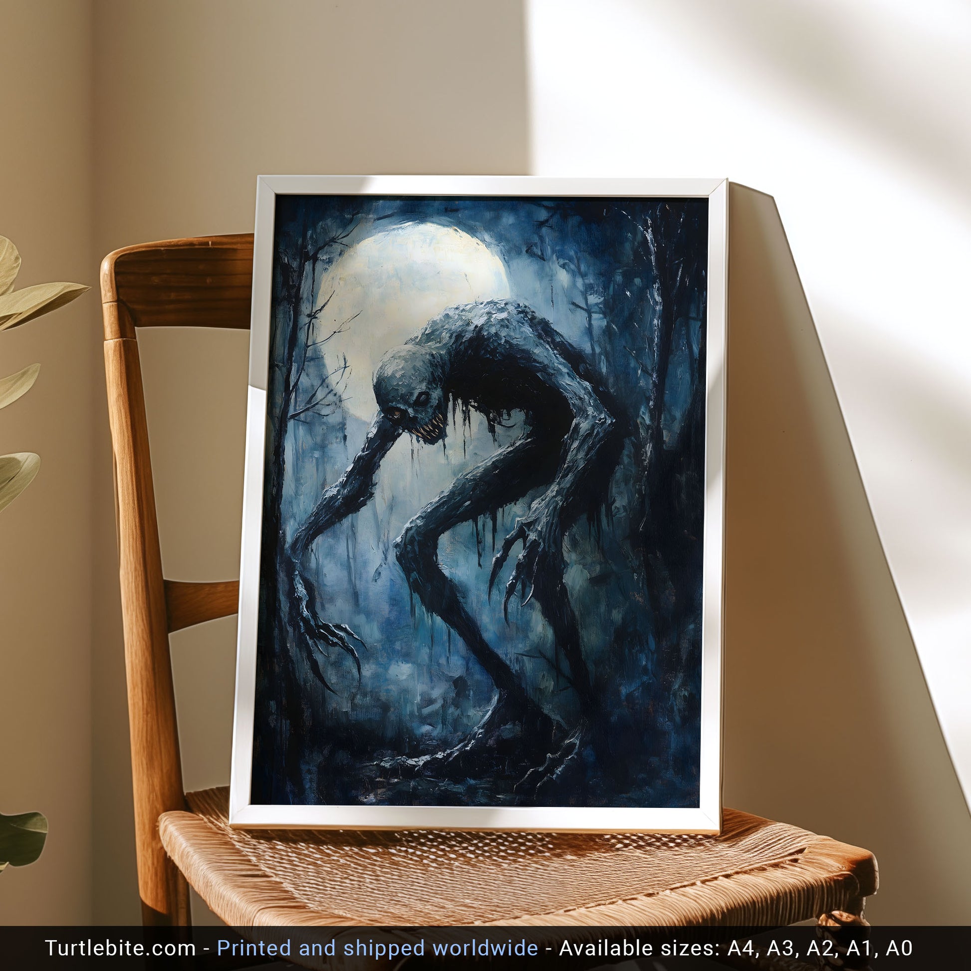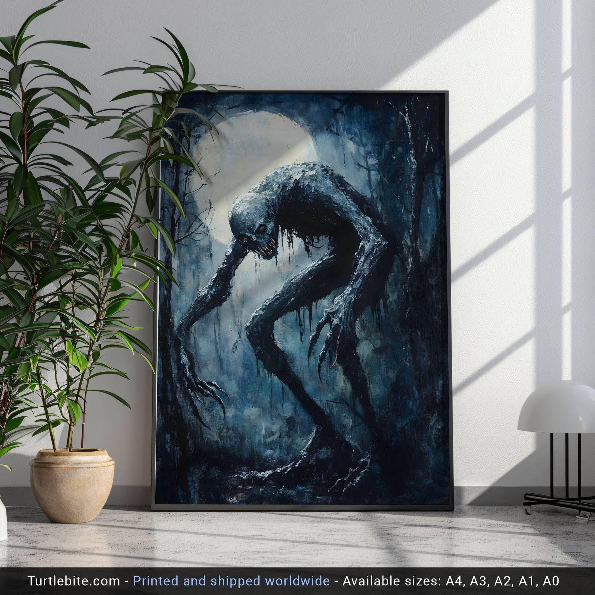 Bring an element of the mystical and mysterious into your space with our "Creepy Hunched Over Monster in the Moonlight" poster print. This captivating artwork features a haunting creature lurking in the shadows, bathed in eerie moonlight. The whimsical yet unsettling design adds a unique touch of fantasy and intrigue to any room. Perfect for those who love the mystical and otherworldly, this art print is an ideal piece for adding depth and atmosphere to your decor. Whether displayed in a living room, bedroom, or office, it serves as a conversation starter and a window into a world of mystery.