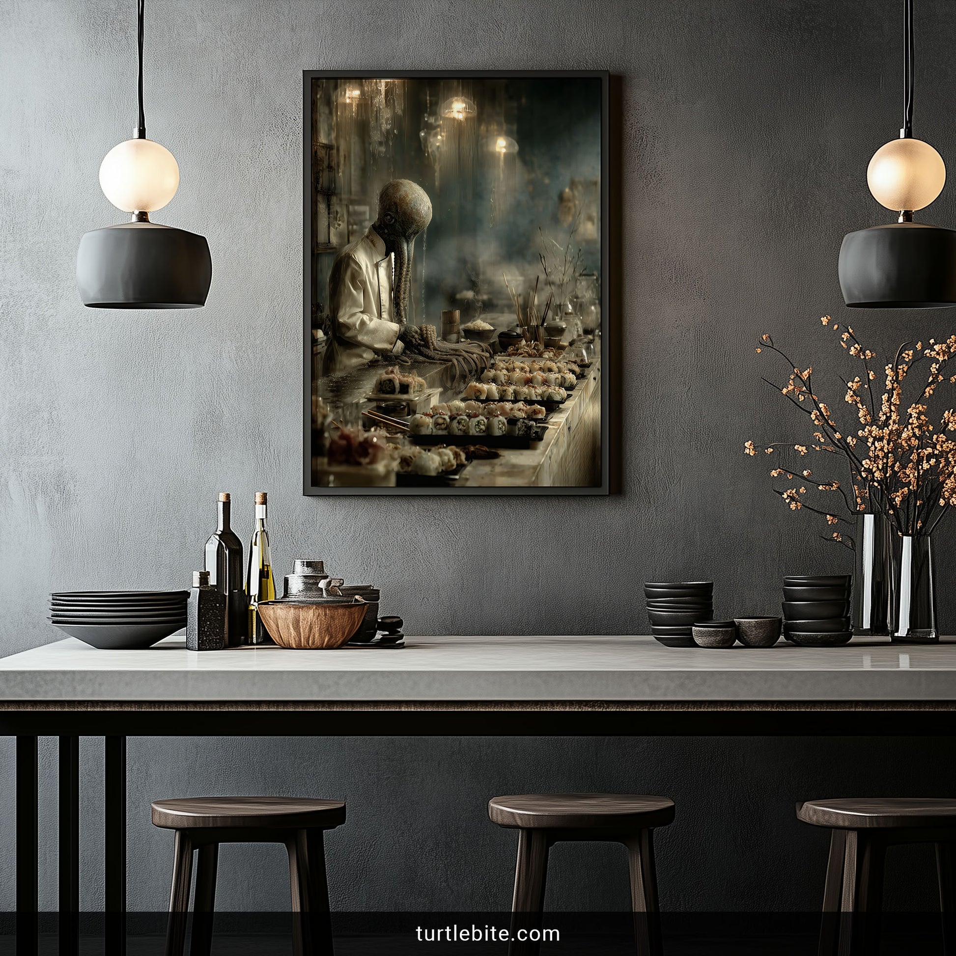 This cthulhu art print captures the beautiful madness of cosmic horror meeting culinary excellence. Our tentacled maestro stands behind an elaborate sushi bar, surrounded by atmospheric decay and Victorian elegance – because even eldritch beings appreciate good ambiance while they work.