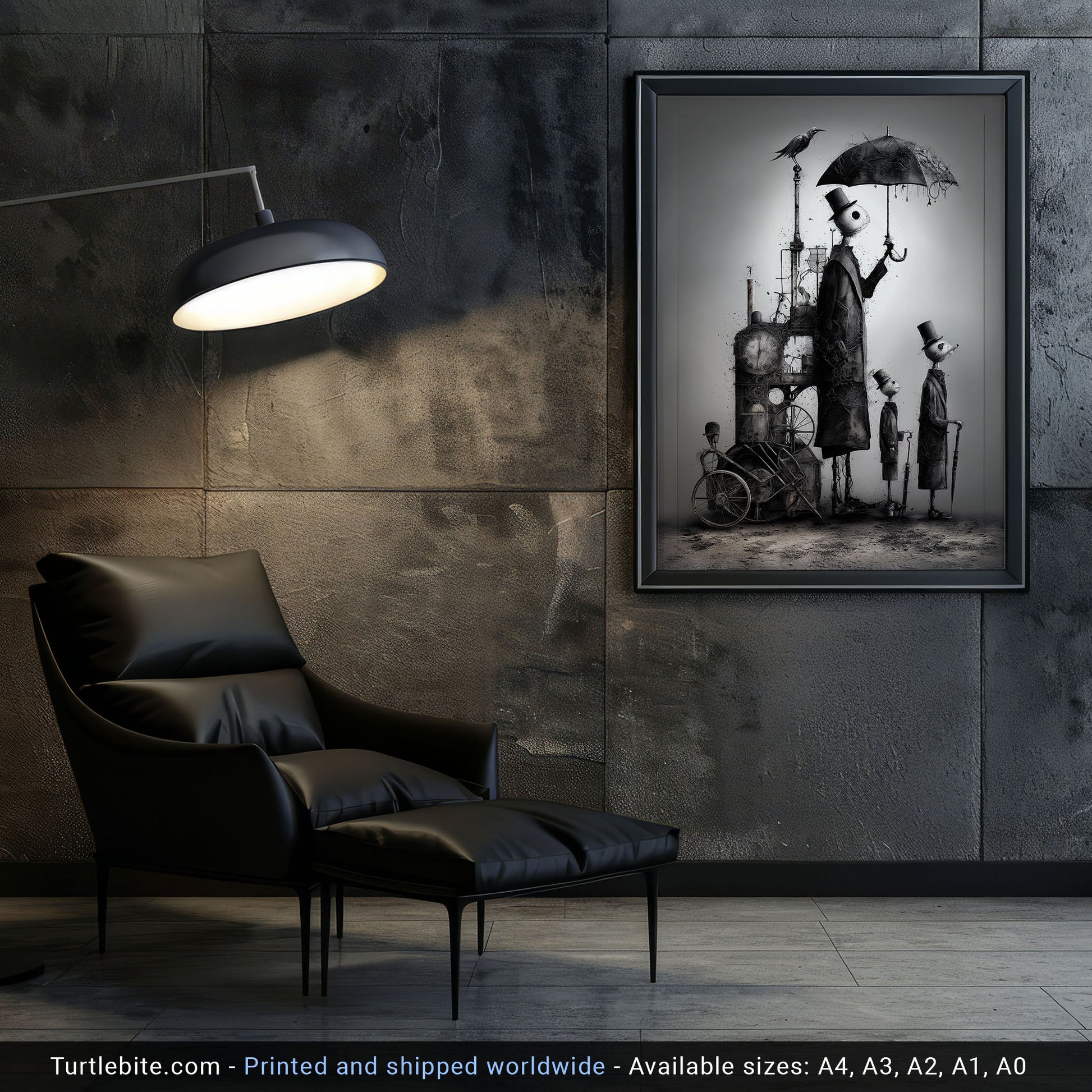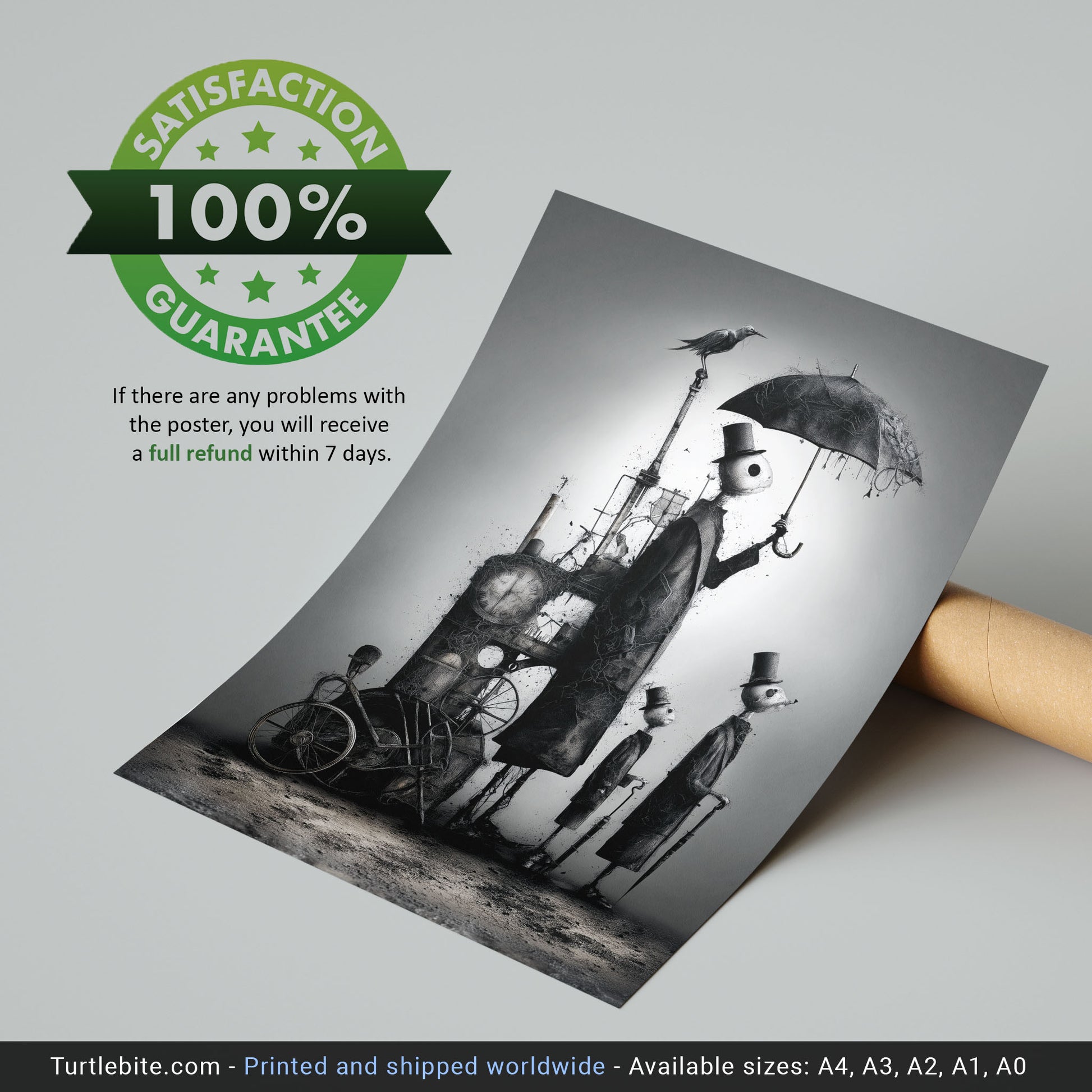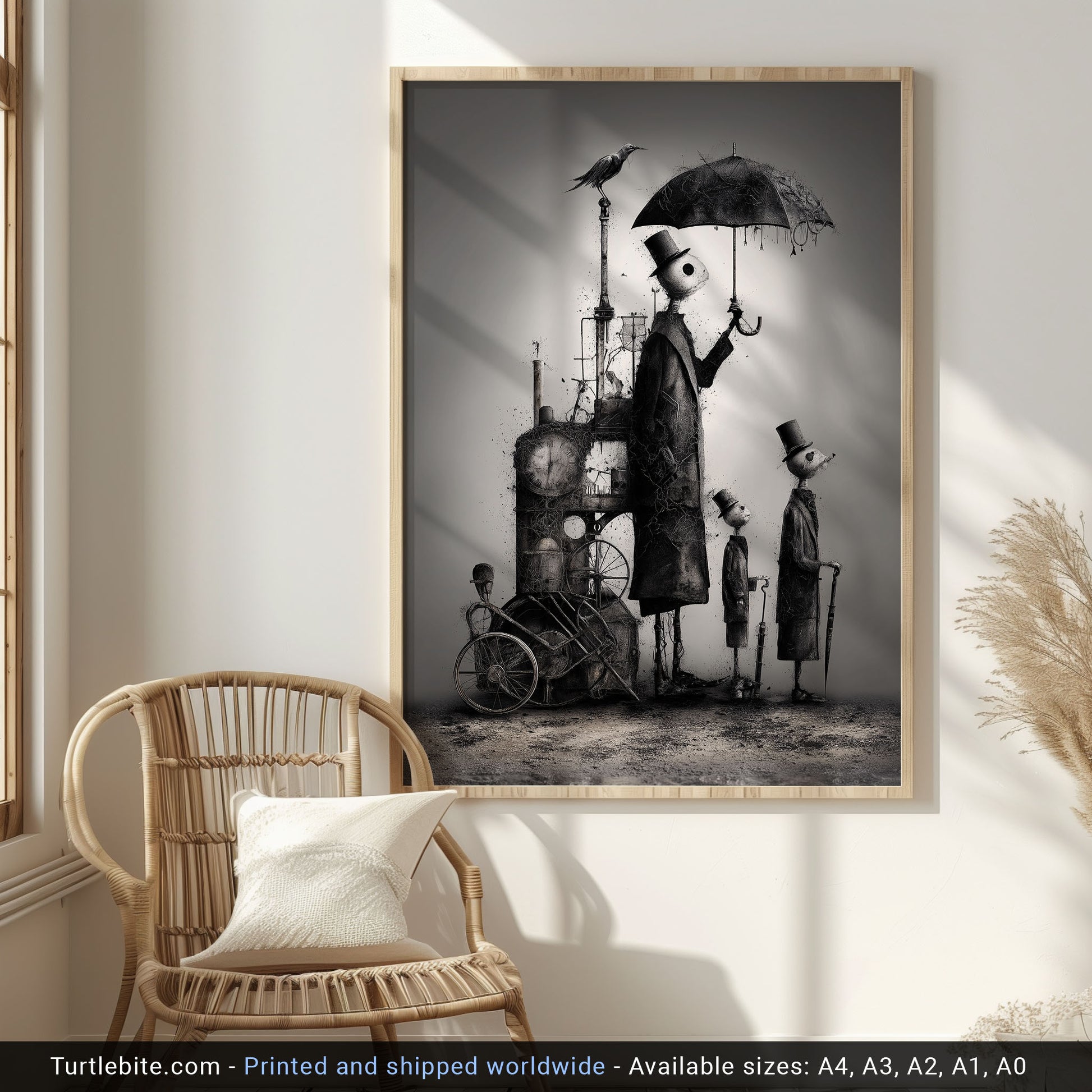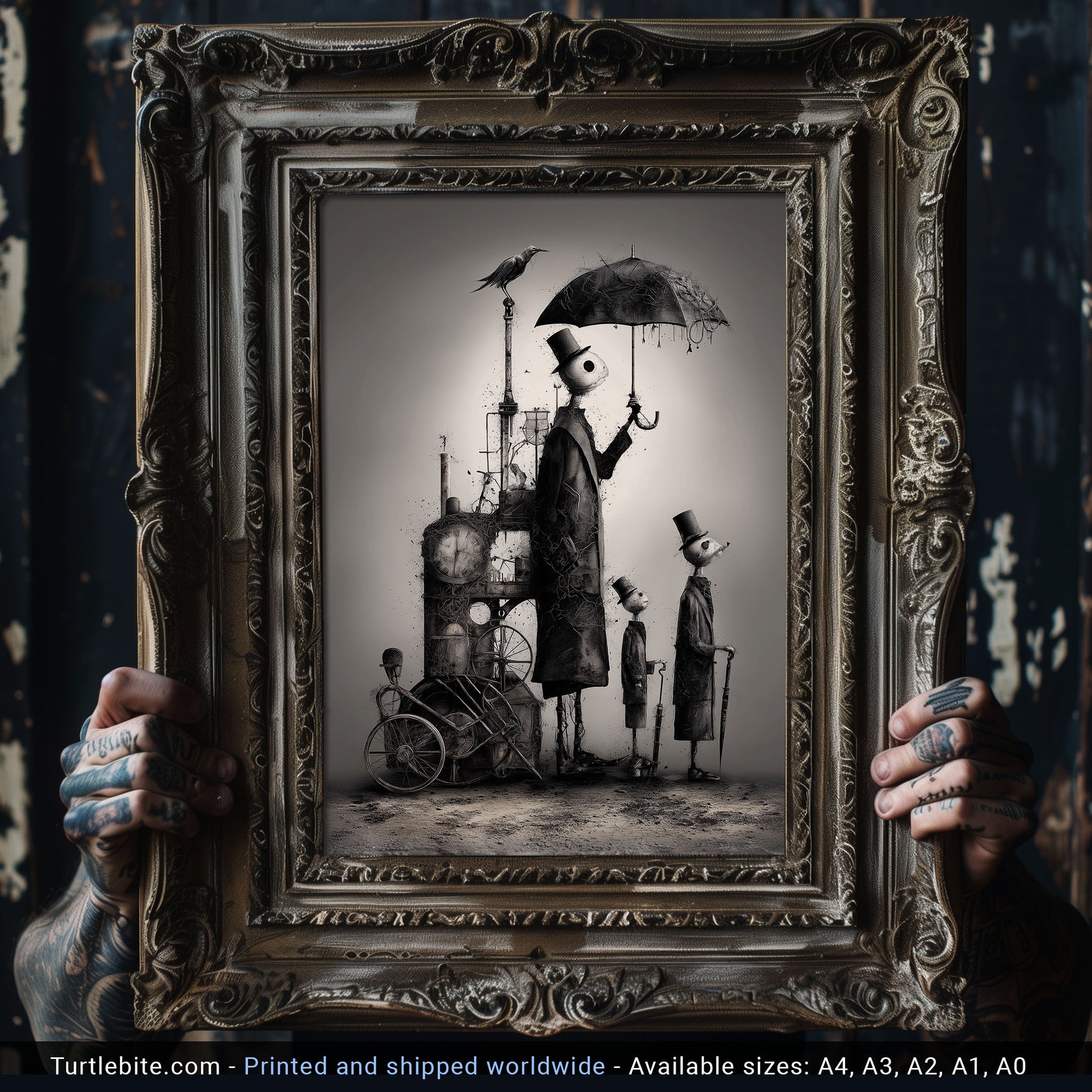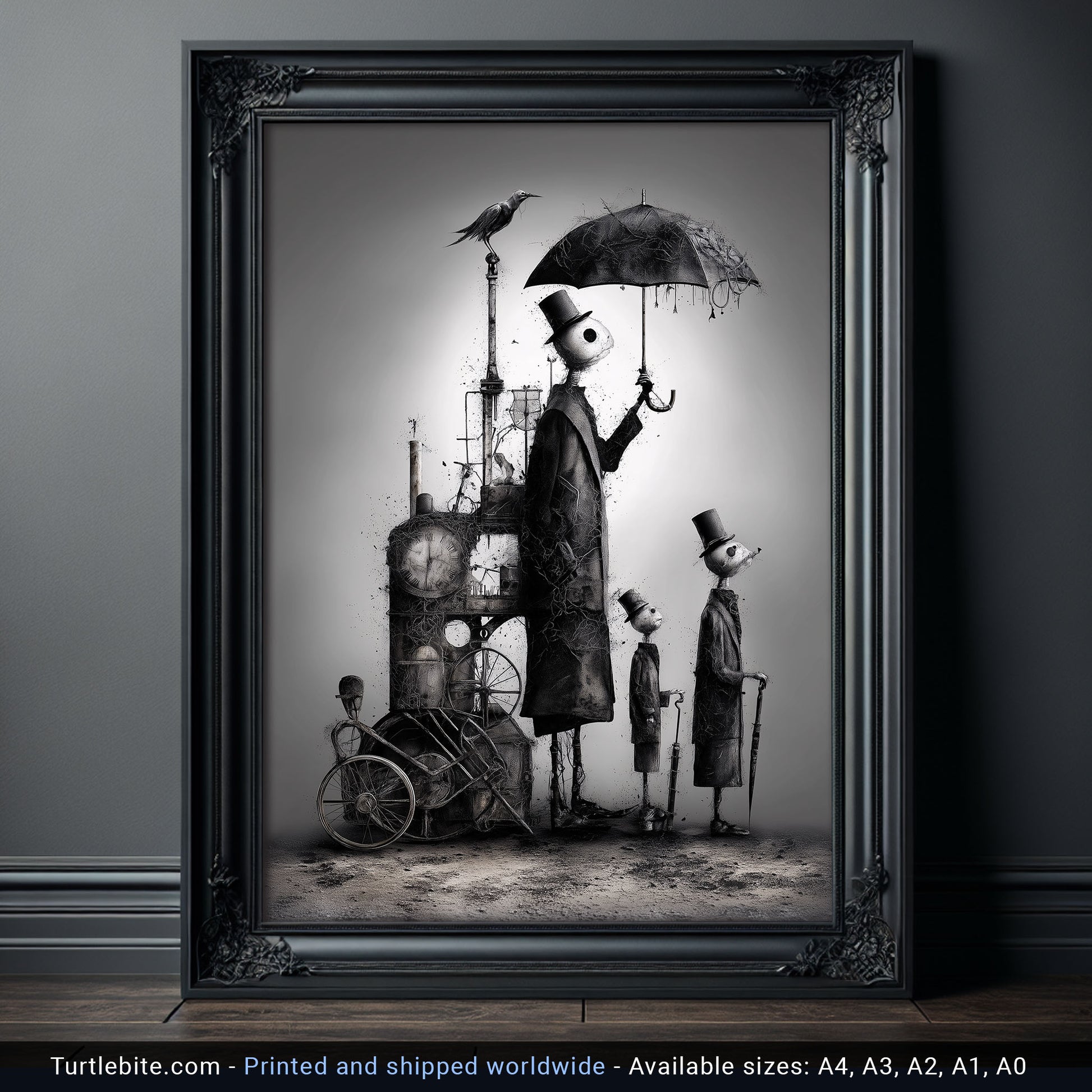 This isn't just any Dark Art Print; it's like stepping into a whole other world where gothic charm meets surreal steampunk wonder. Imagine these dapper, slightly unsettling figures bringing their quiet, thoughtful vibe to your space. The incredible details, from the delicately tattered umbrella held by our main character to the mysterious, time-worn machine chugging along beside them (clock and all!), make this monochrome art a real conversation starter. It's the kind of eerie illustration that pulls you in, letting you discover something new every time you look.