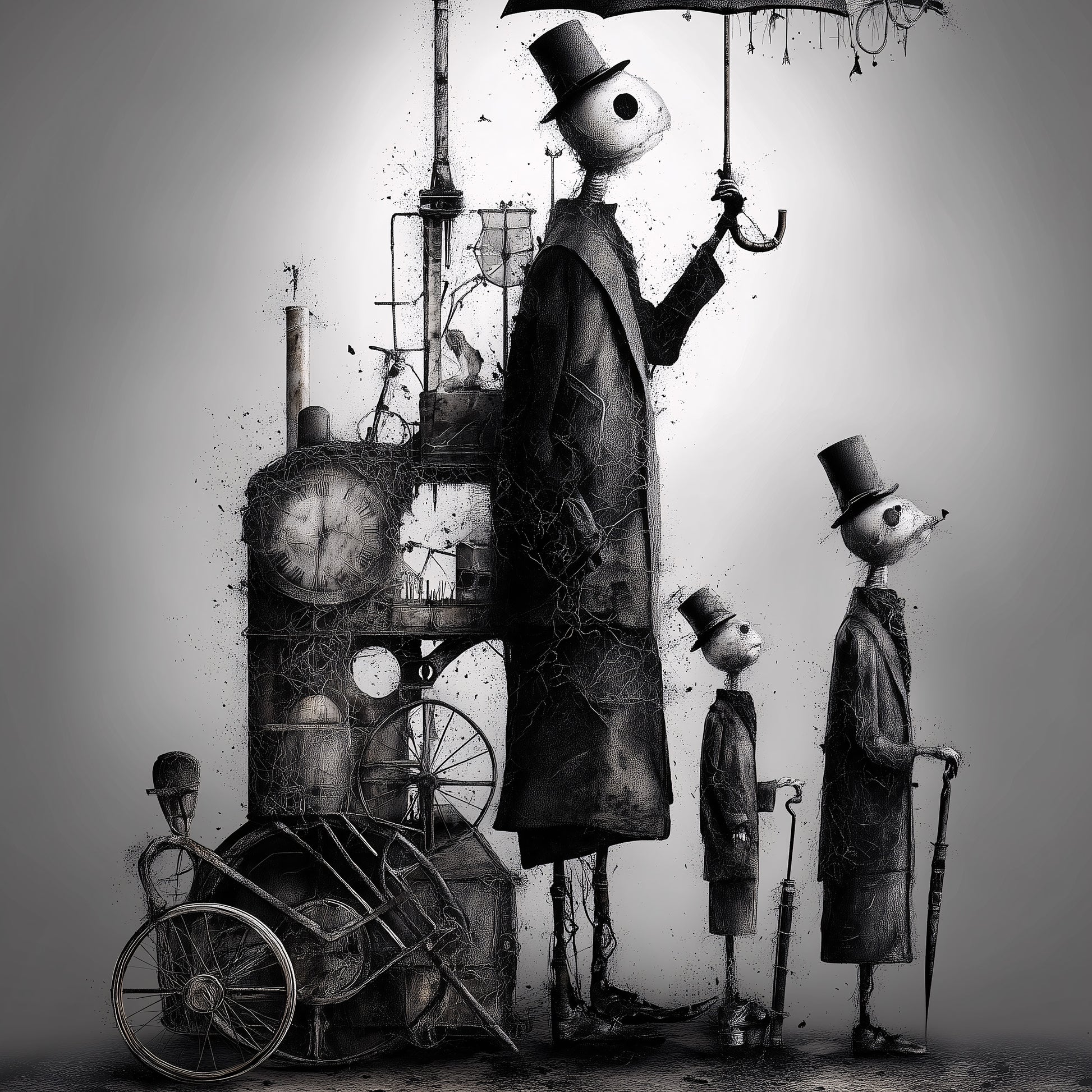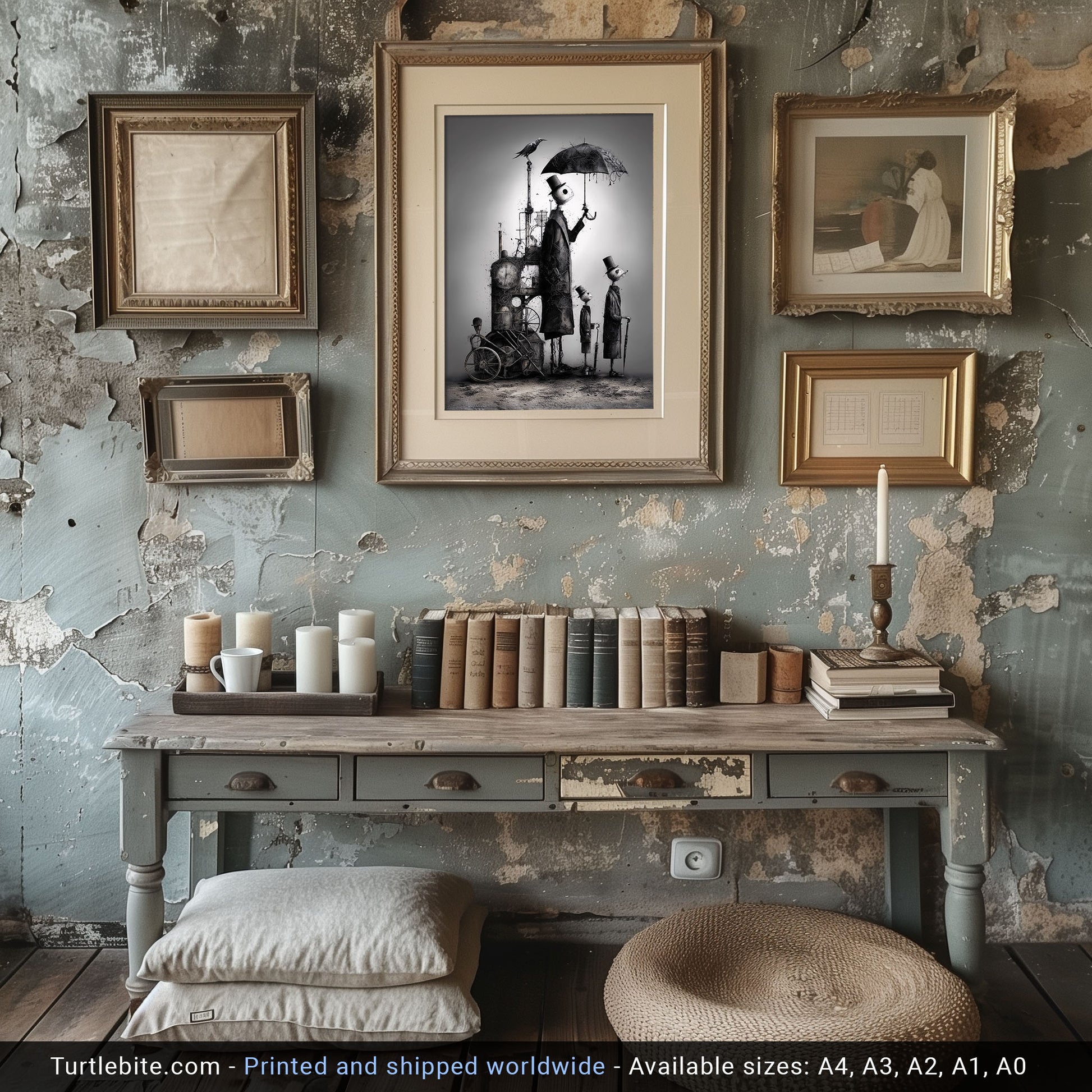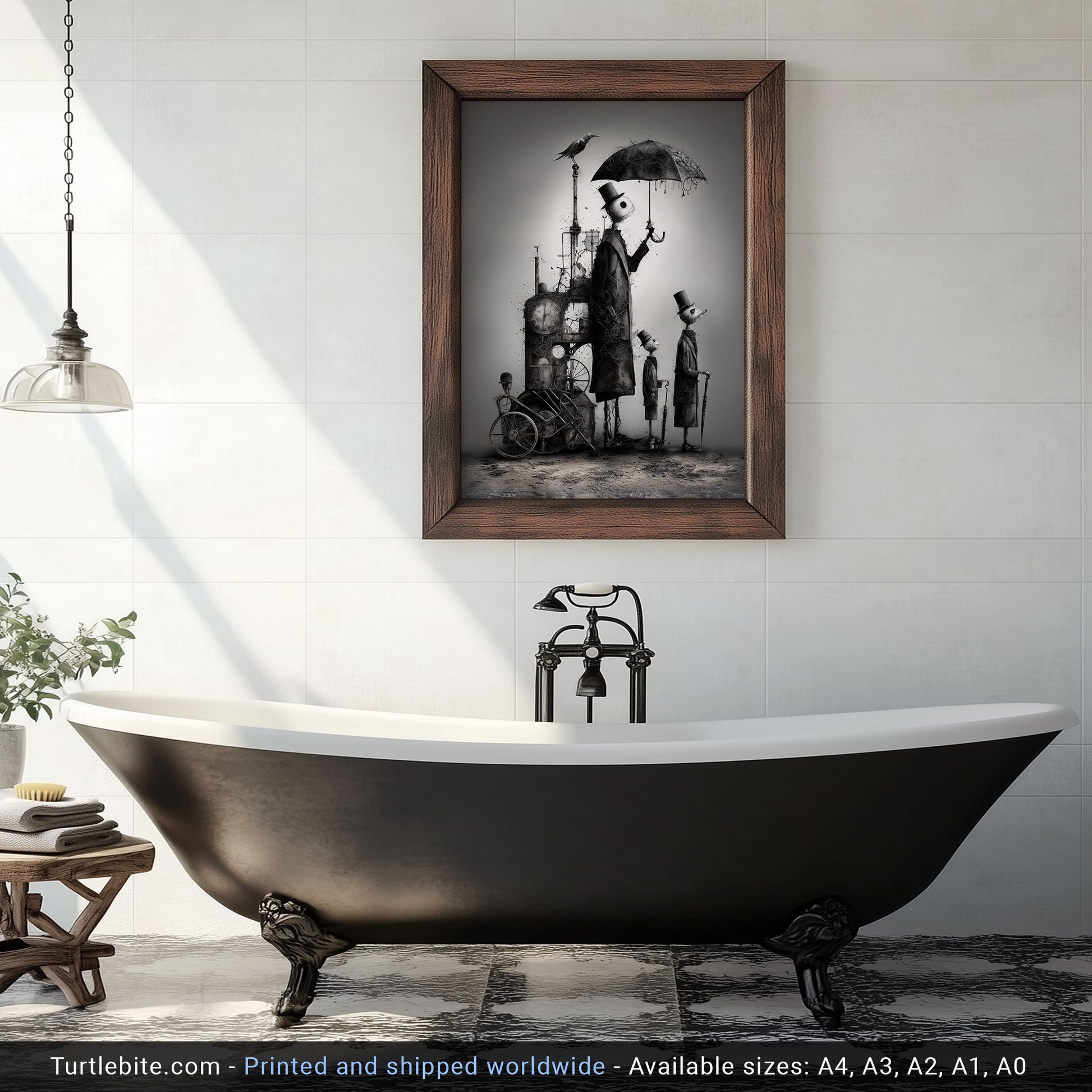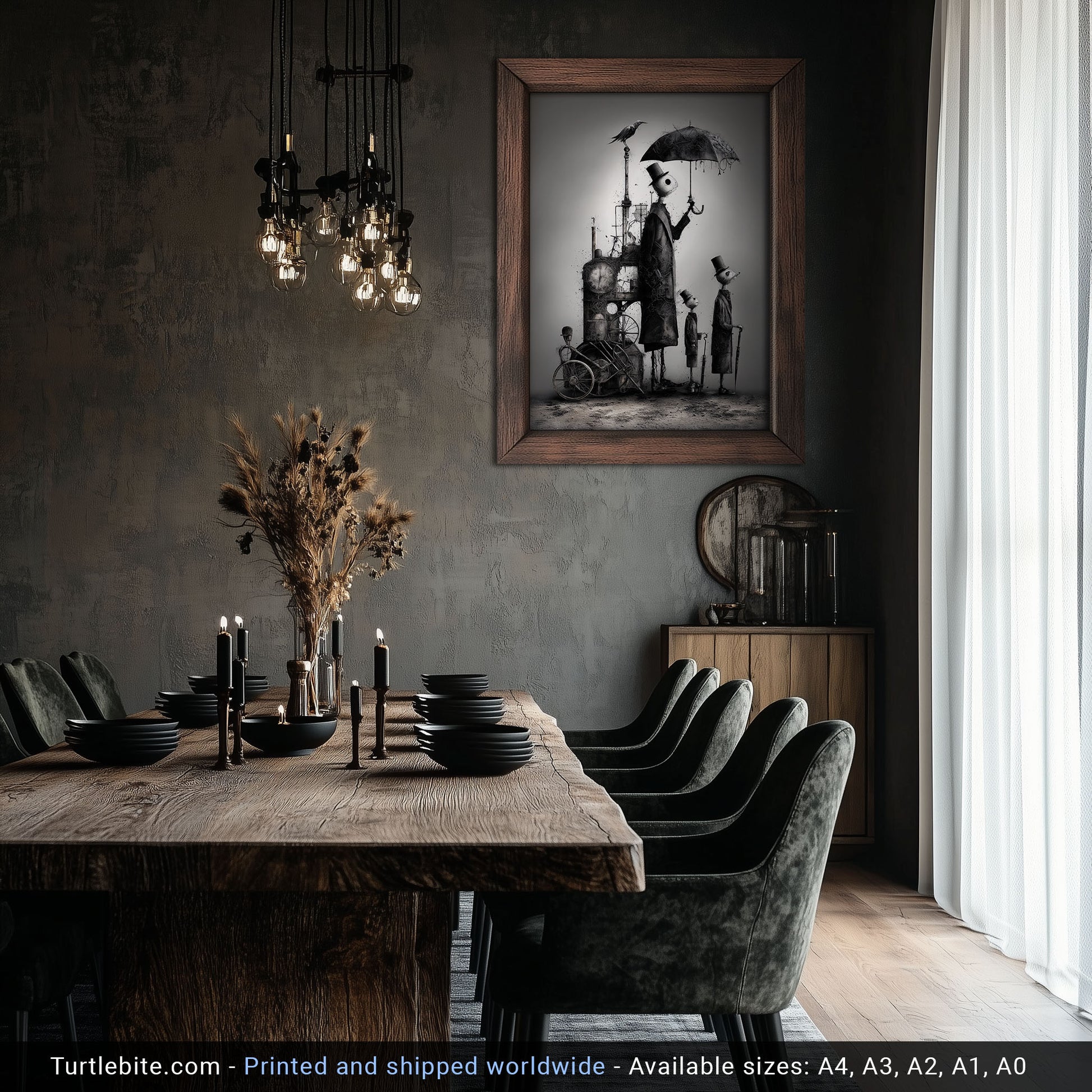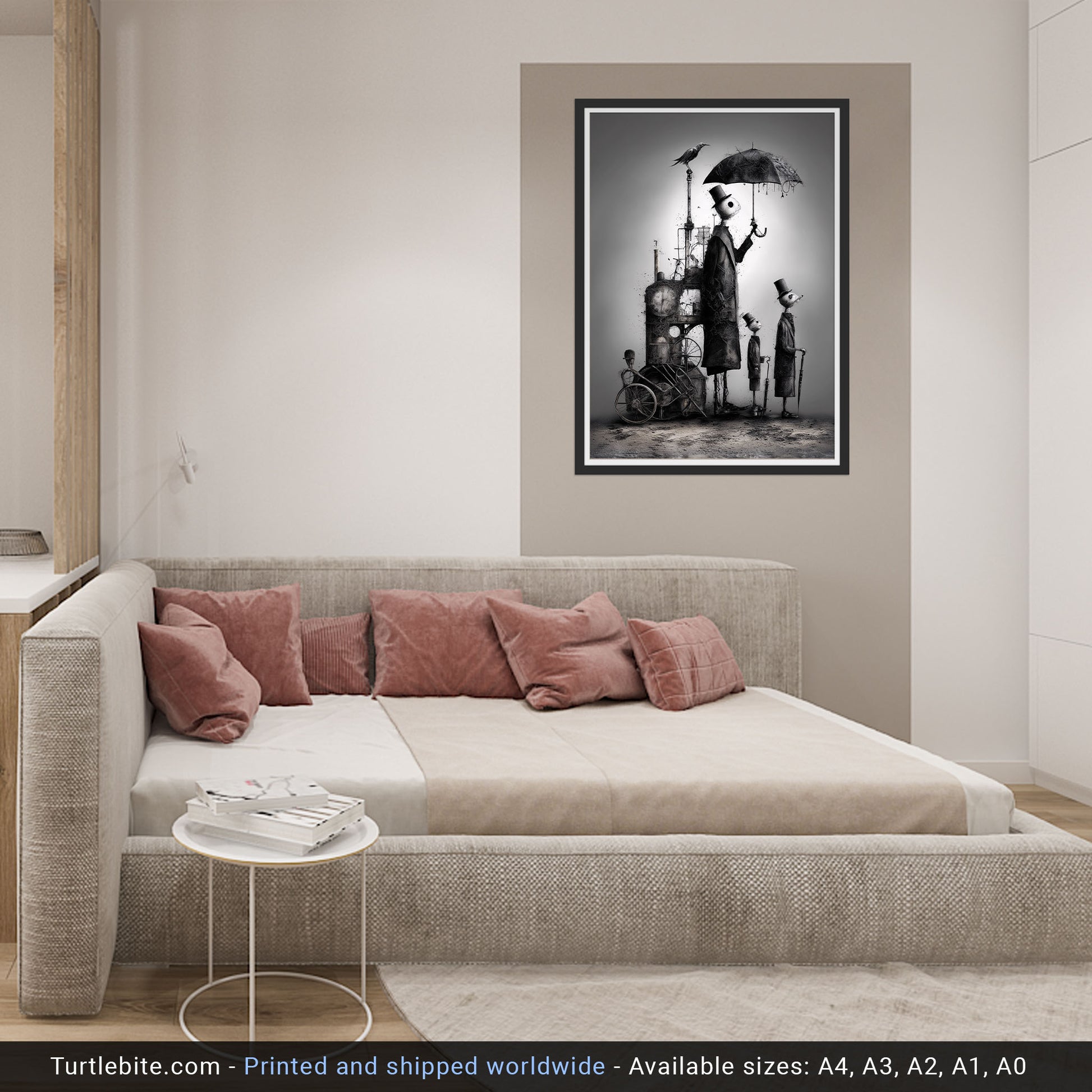 This isn't just any Dark Art Print; it's like stepping into a whole other world where gothic charm meets surreal steampunk wonder. Imagine these dapper, slightly unsettling figures bringing their quiet, thoughtful vibe to your space. The incredible details, from the delicately tattered umbrella held by our main character to the mysterious, time-worn machine chugging along beside them (clock and all!), make this monochrome art a real conversation starter. It's the kind of eerie illustration that pulls you in, letting you discover something new every time you look.
