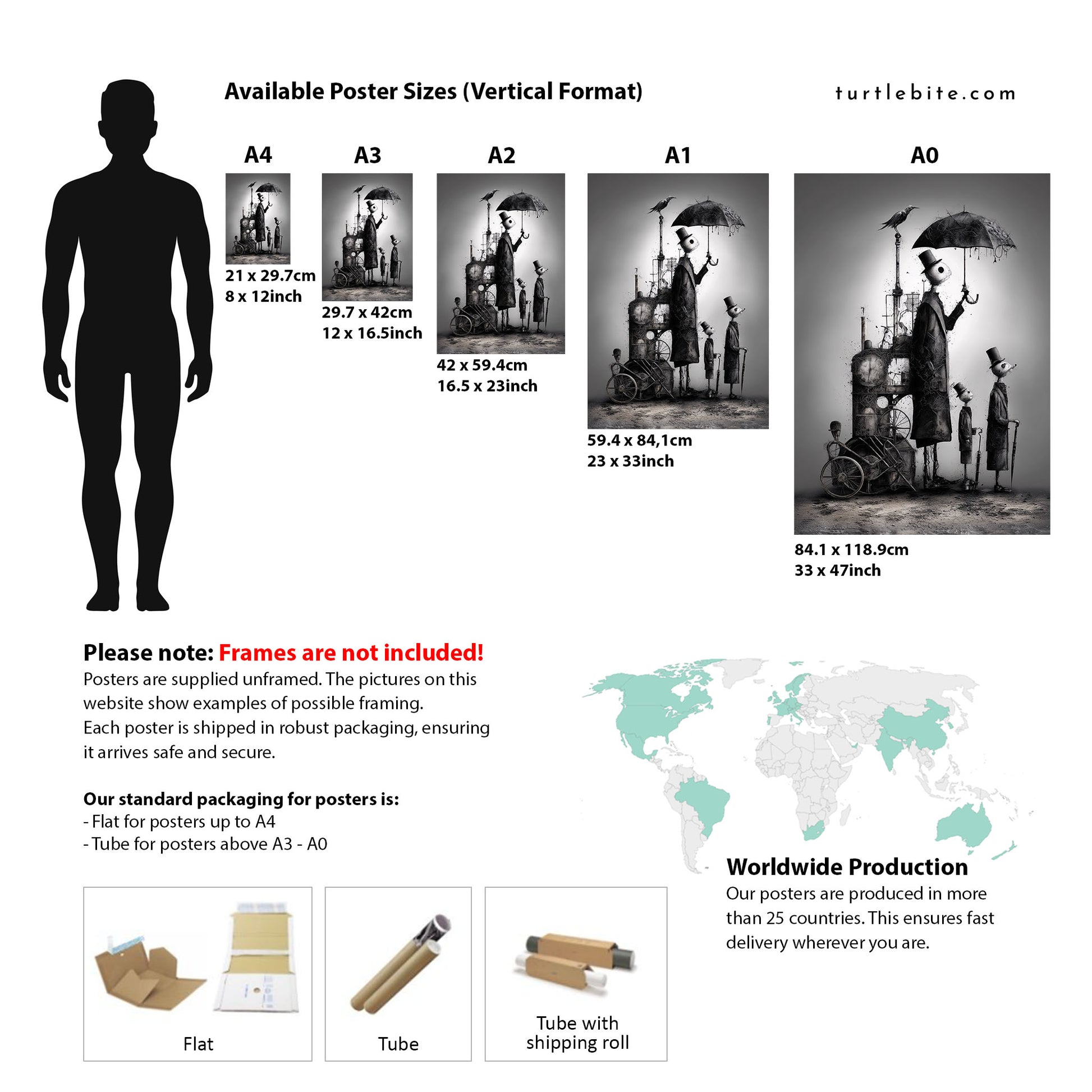 Please note: posters are supplied unframed, the pictures on this website show examples of possible framing. Prints may exhibit slight variation from what you see on your screen due to differences in calibration, brightness, and ambient lighting. Mockups serve only as illustrations and may not perfectly represent the final artwork.
