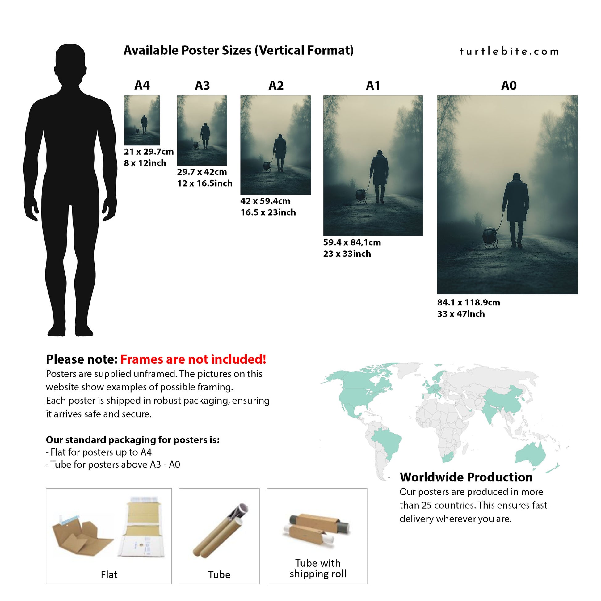 Different packaging depending on the size of the poster as well as the country where the item is produced and shipped to. Larger prints are carefully rolled and shipped in a tube, without framing included. Each of these products is crafted specifically for you upon ordering, so please allow a bit more time for delivery.