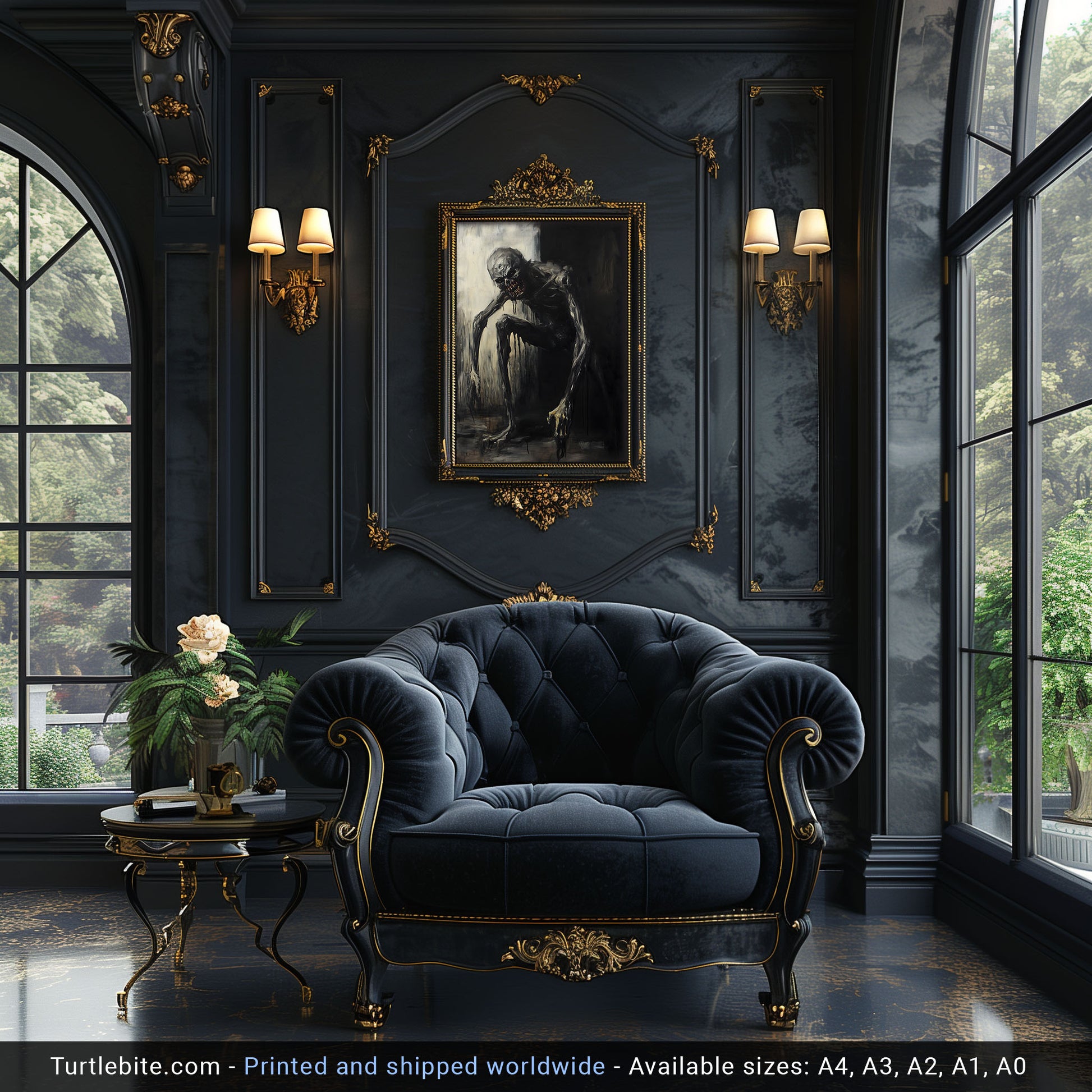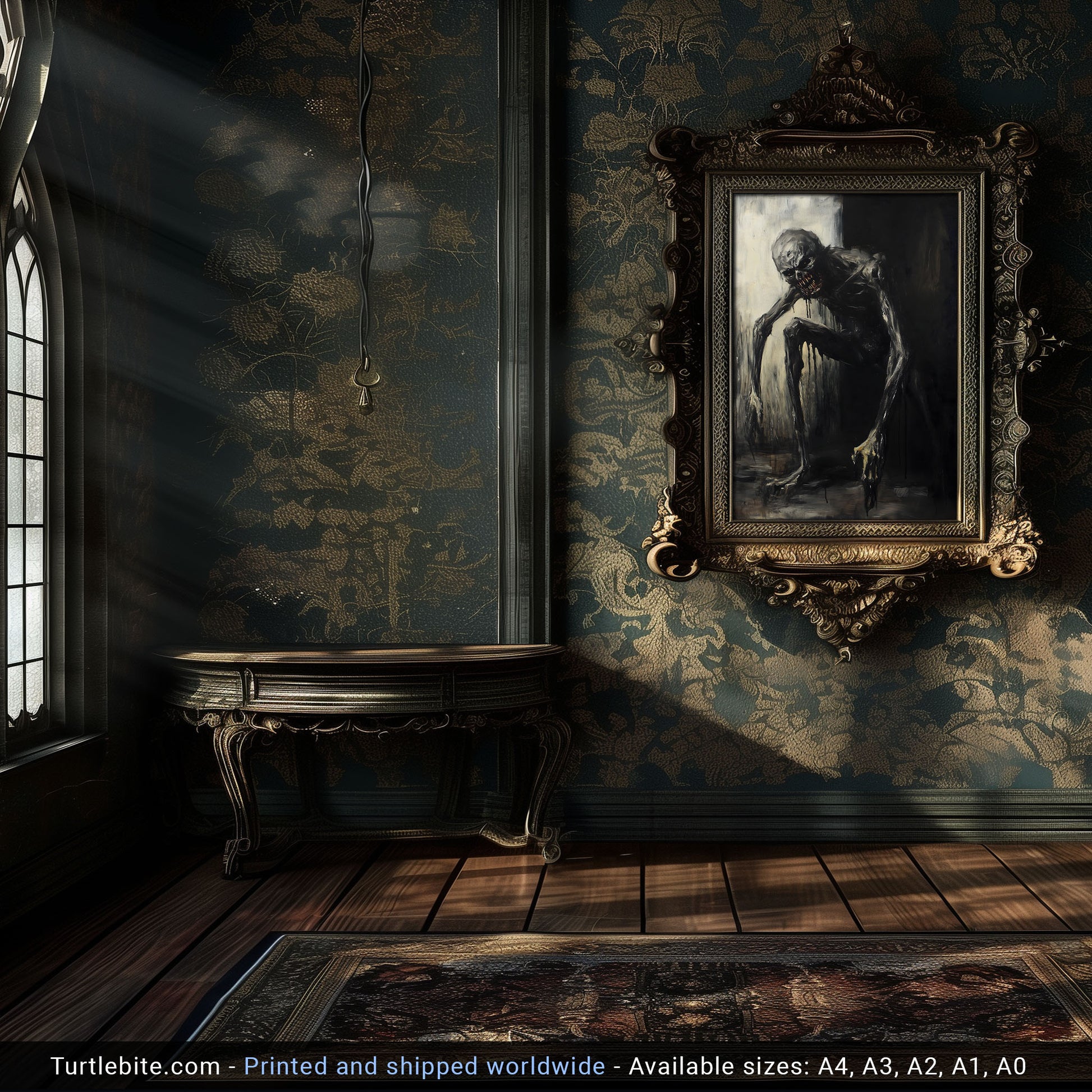 Unleash the macabre with this "Dark Eerie Gritty Oil Painting of a Scary Creature" poster. This chilling artwork, rendered in a gritty oil style, depicts a terrifying creature emerging from the shadows, perfect for those who crave moody and bizarre decor. The victorian-inspired design adds a touch of eerie elegance, blending the bizarre with the occult. This haunting print is ideal for anyone looking to add a dark, mysterious atmosphere to their space, making it a striking piece for fans of the bizarre and supernatural.