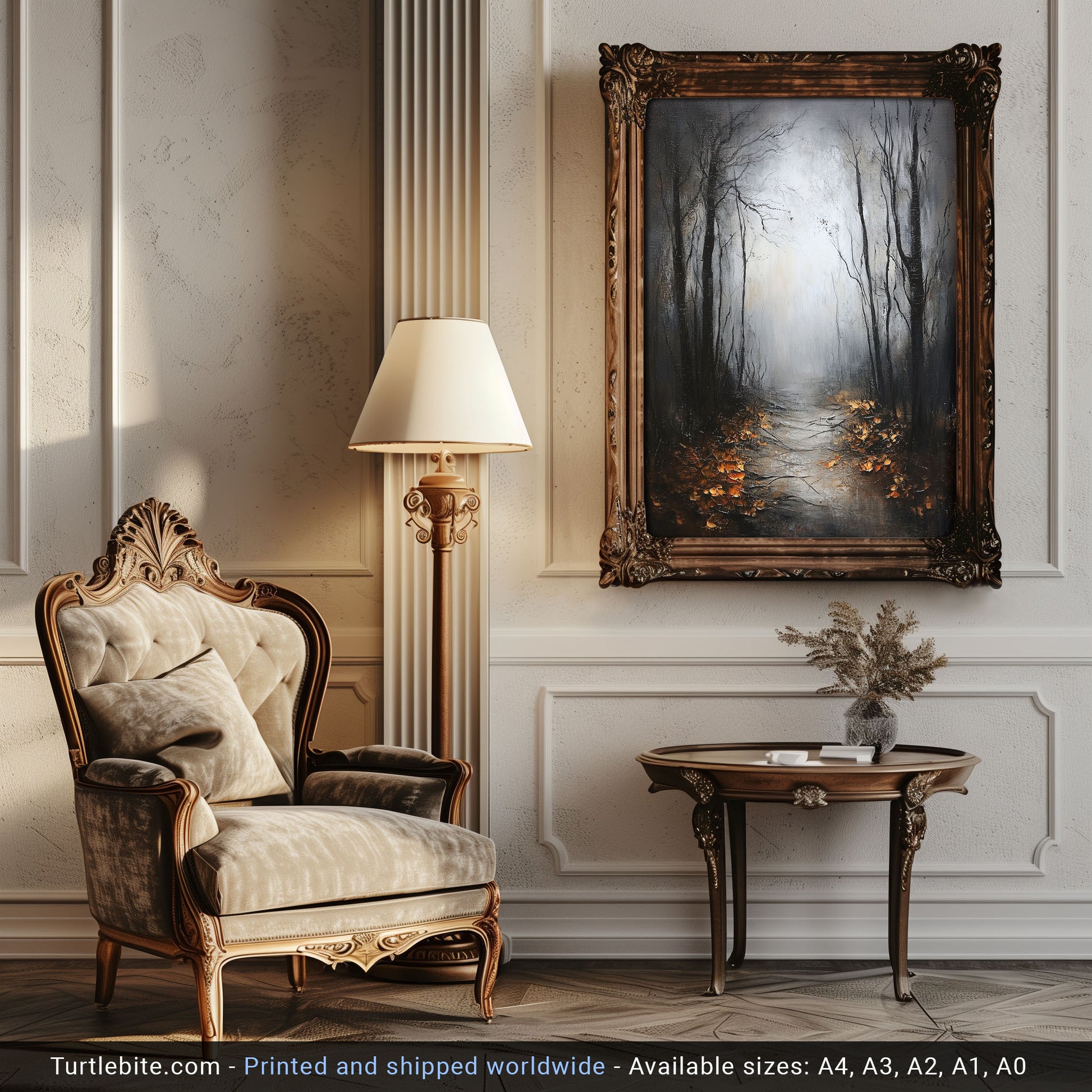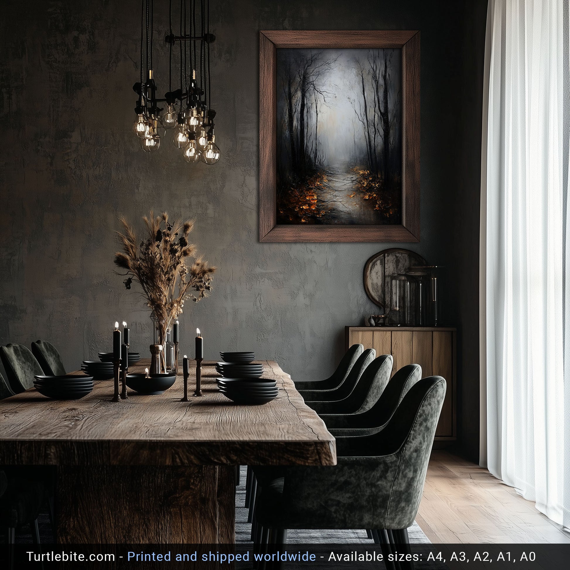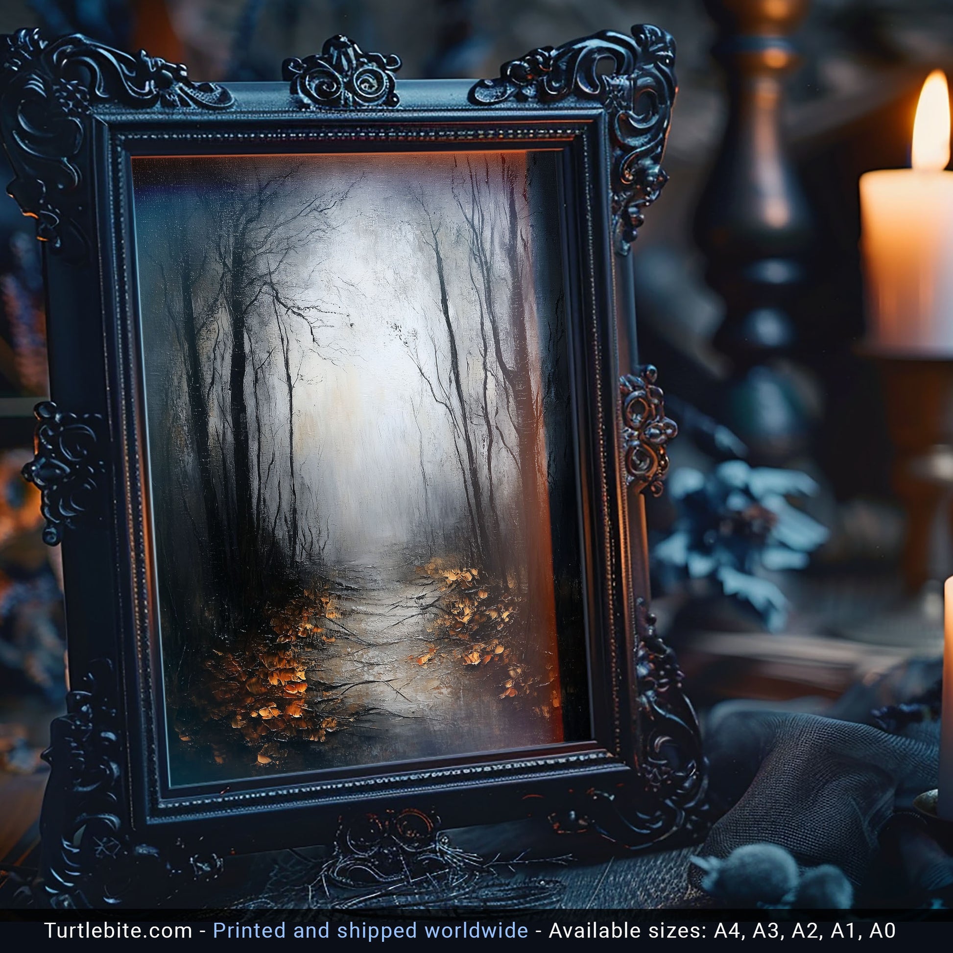 Bring a haunting sense of beauty into your space with this dark forest wall art, featuring a misty path shrouded in fog and framed by shadowy trees and fallen golden leaves. This moody landscape artwork evokes a sense of solitude, perfect for anyone drawn to atmospheric nature scenes and dark romantic aesthetics.