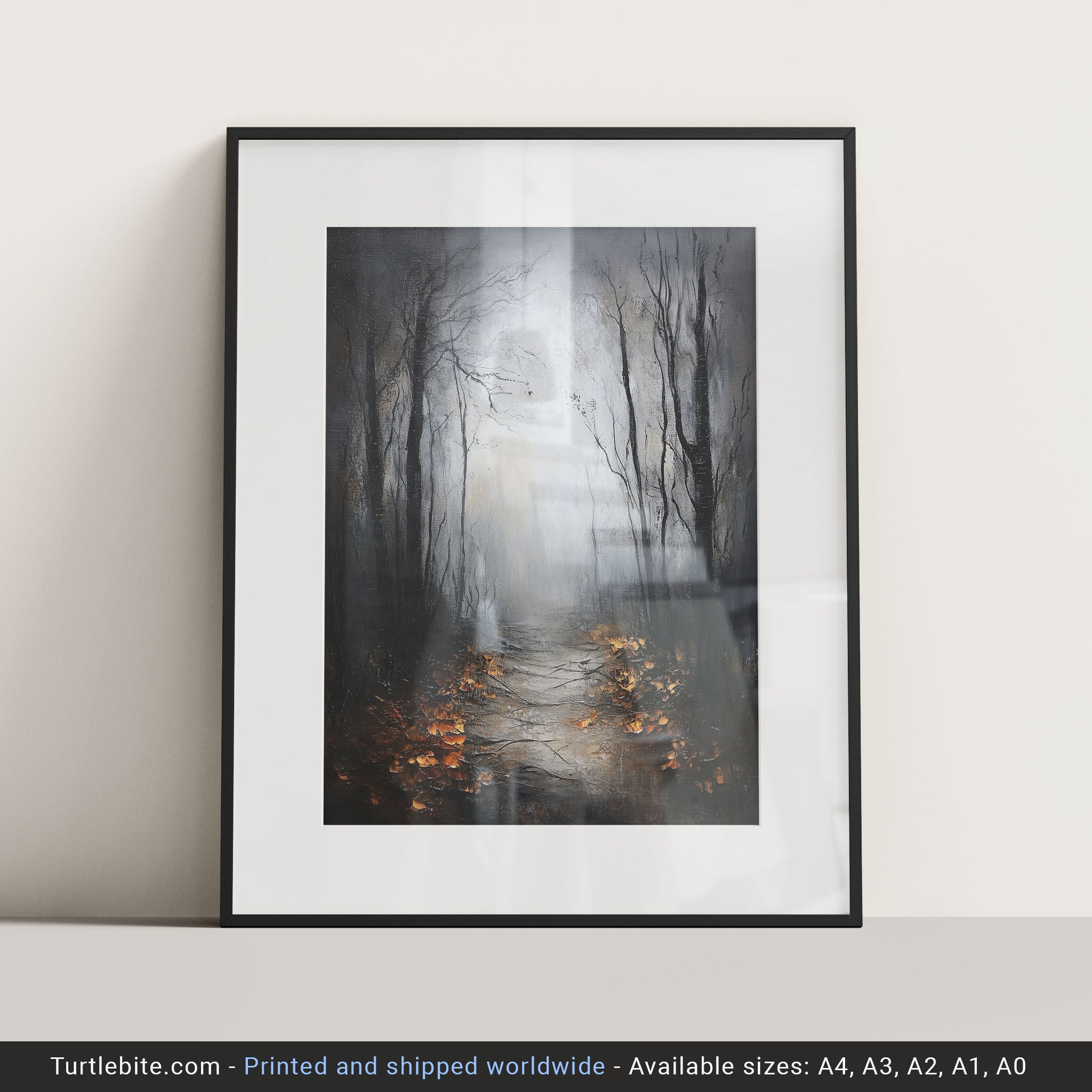 Dark Forest Wall Art Poster Print with Mysterious Foggy Path and Autumn Leaves