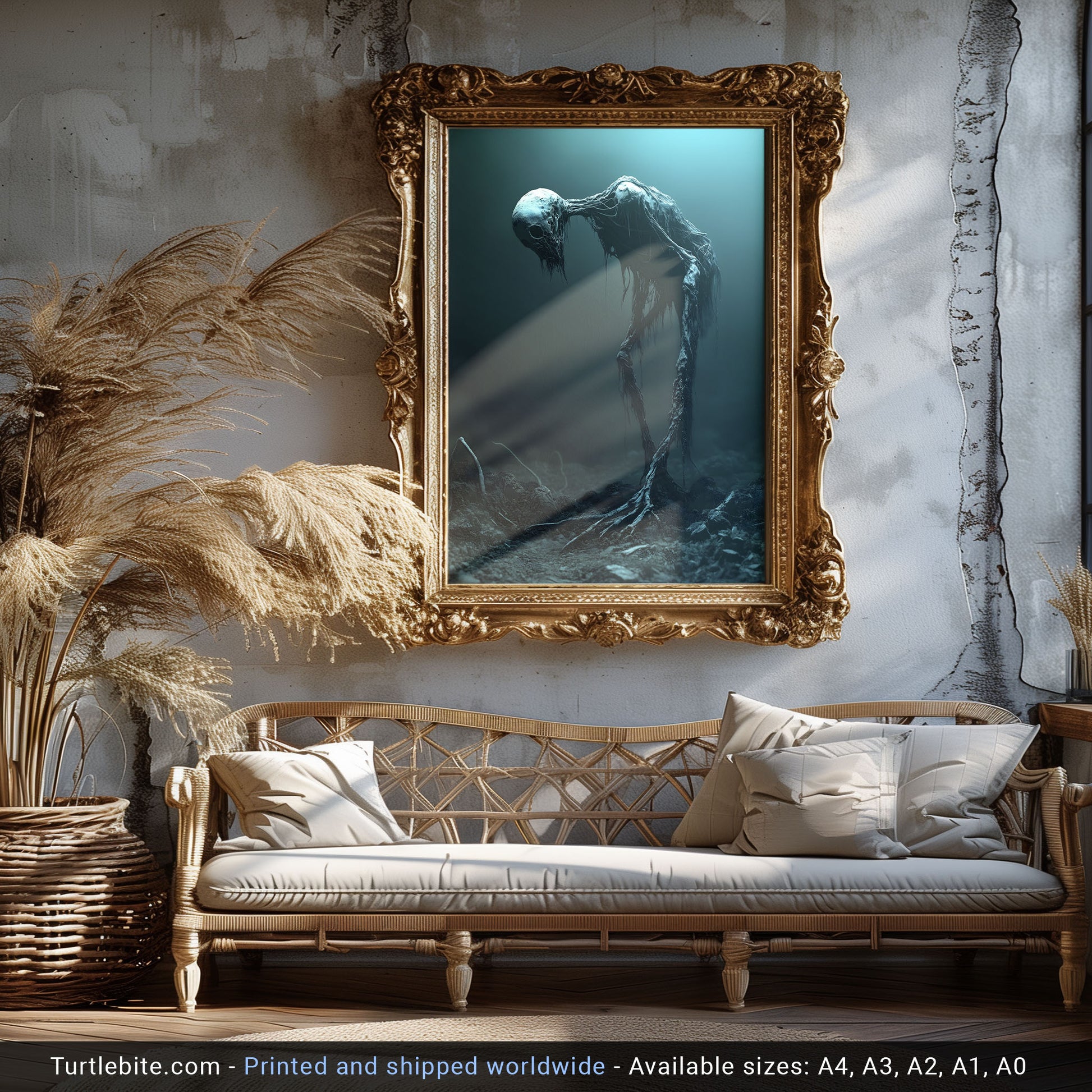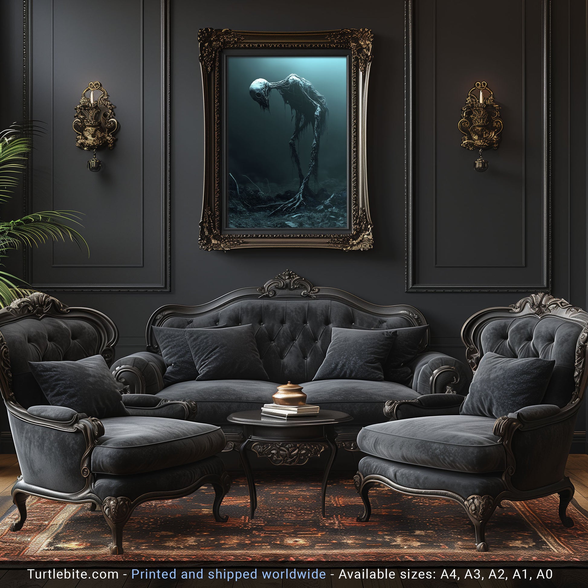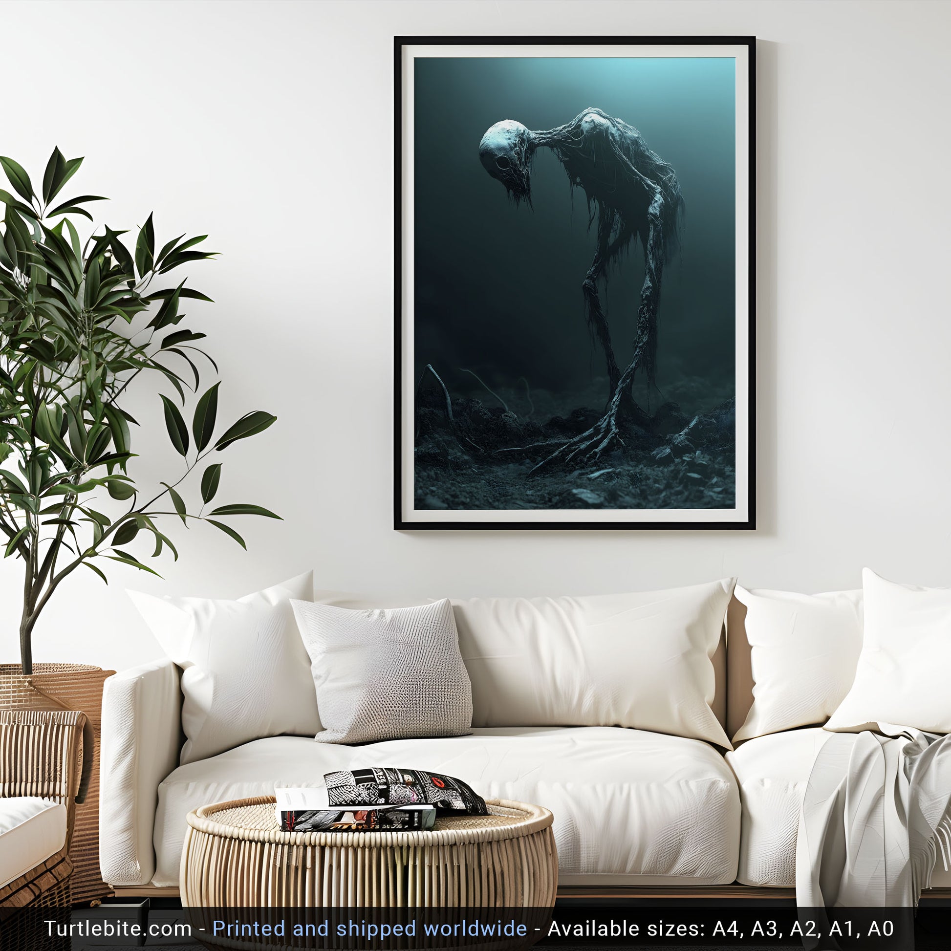 Get ready to dive into the depths of your imagination with our deep sea skeleton creature dark art poster prints! These oversized vertical print is perfect for adding a touch of horror and haunting beauty to your wall. Dare to make a bold statement and bring a sense of adventurous risk-taking to your space.