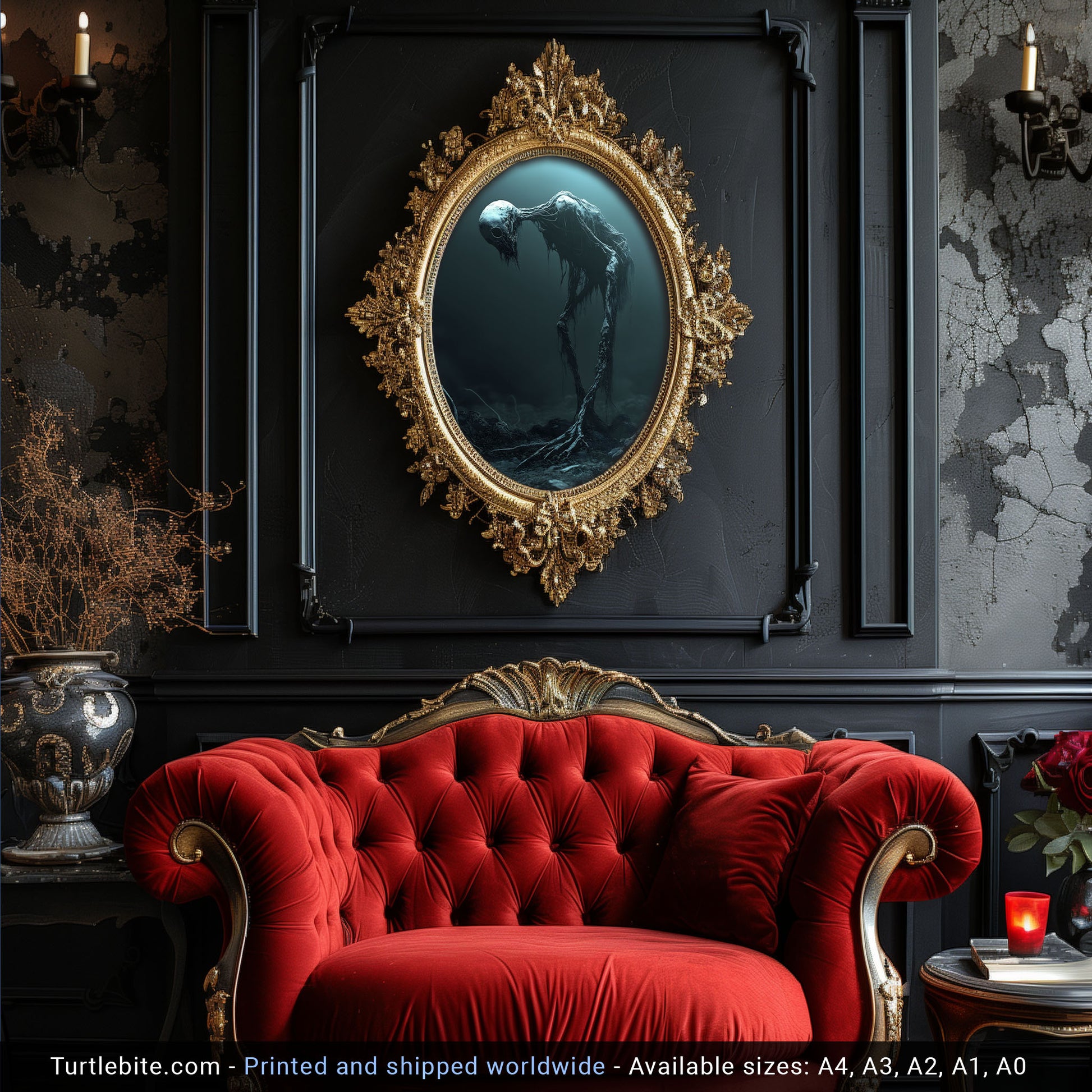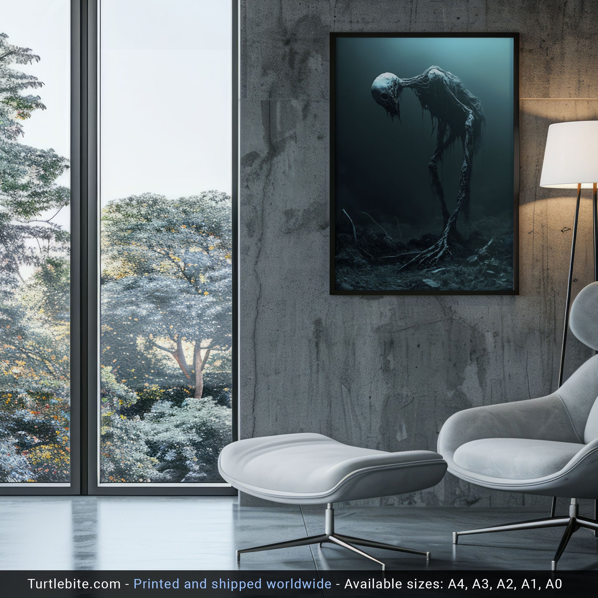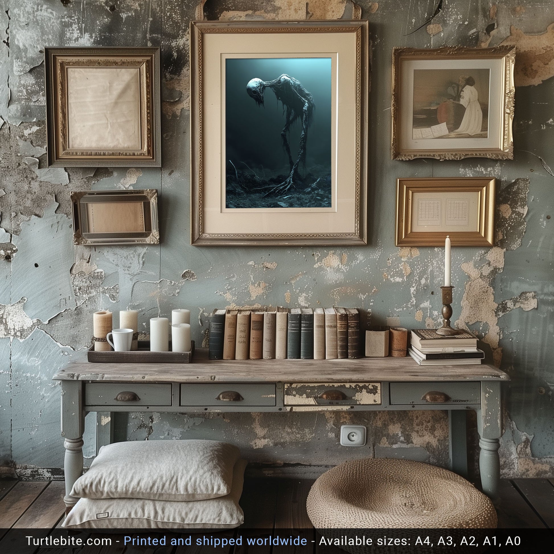Get ready to dive into the depths of your imagination with our deep sea skeleton creature dark art poster prints! These oversized vertical print is perfect for adding a touch of horror and haunting beauty to your wall. Dare to make a bold statement and bring a sense of adventurous risk-taking to your space.