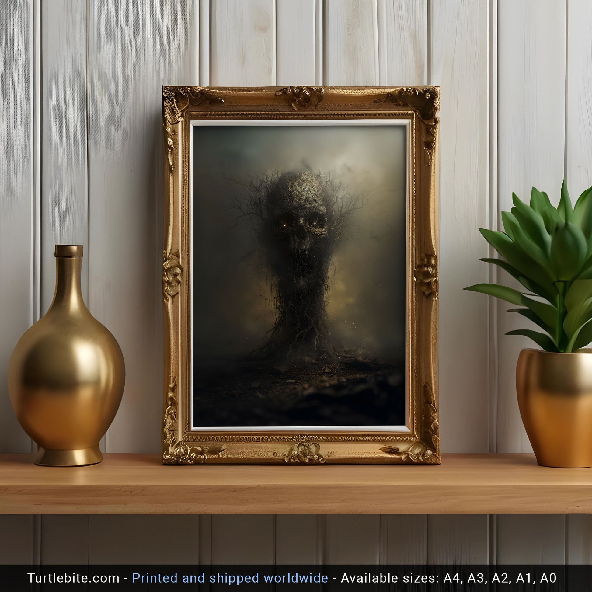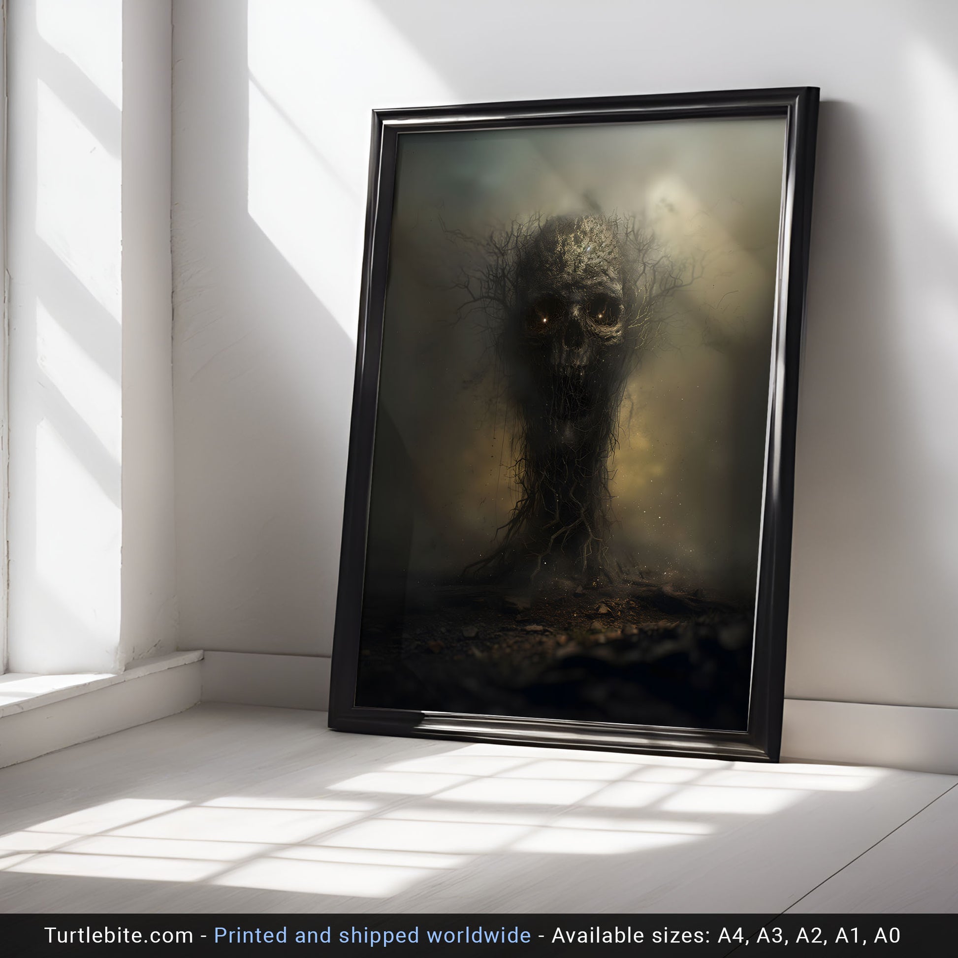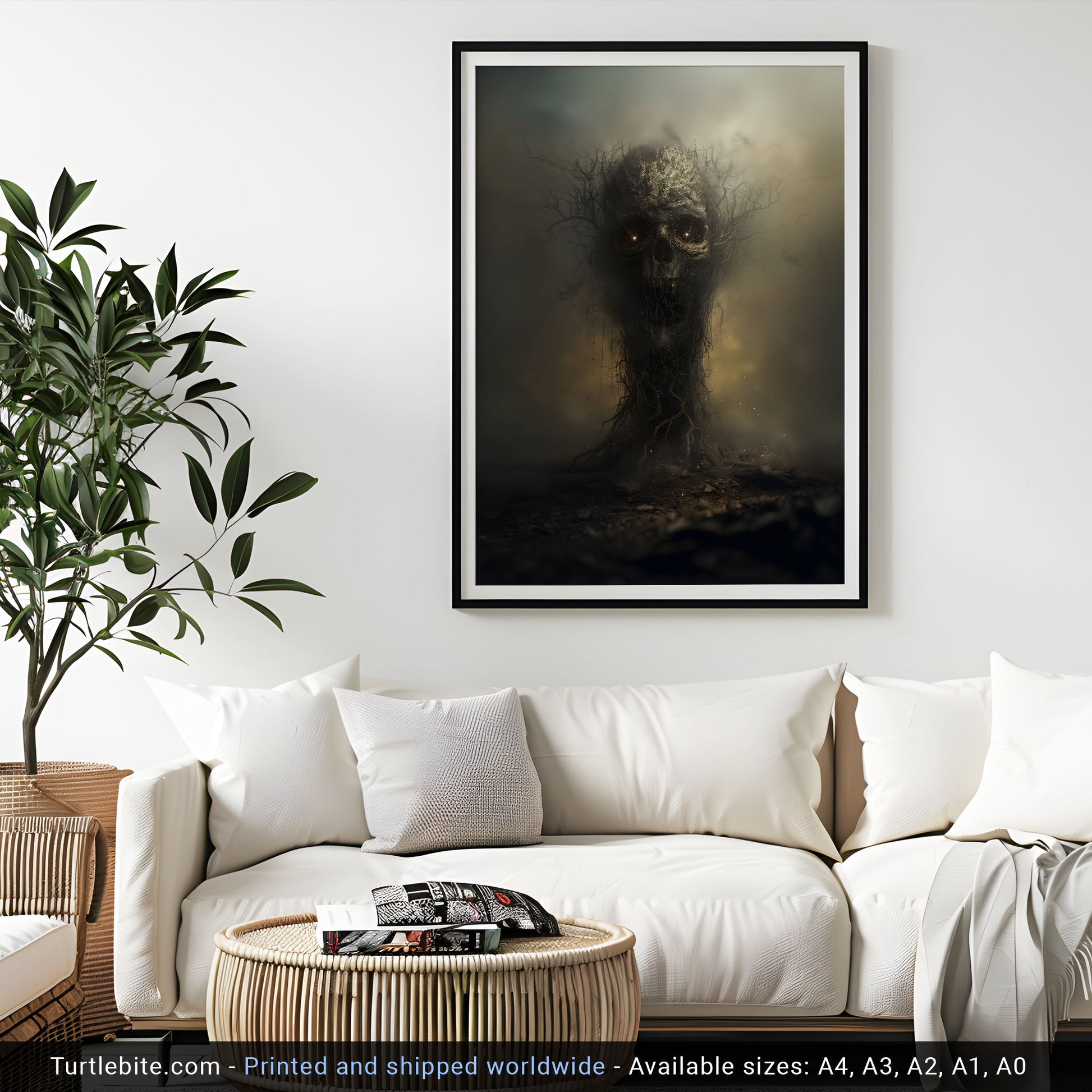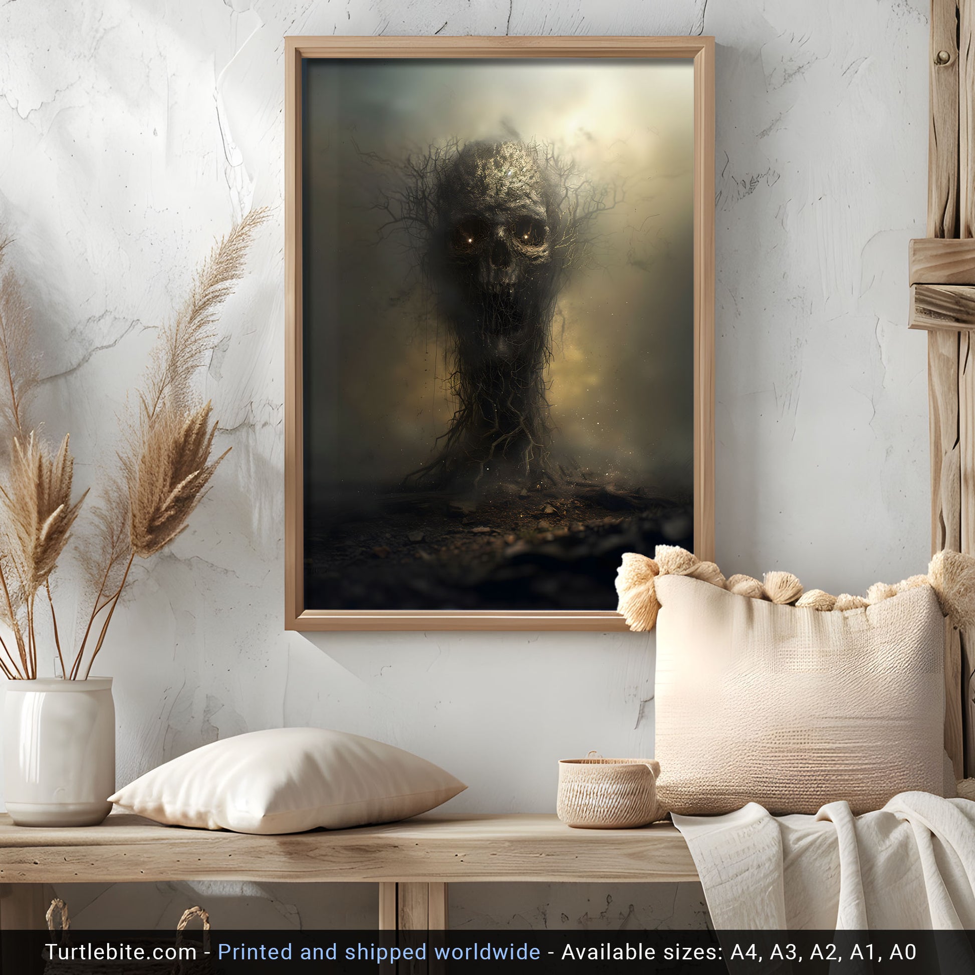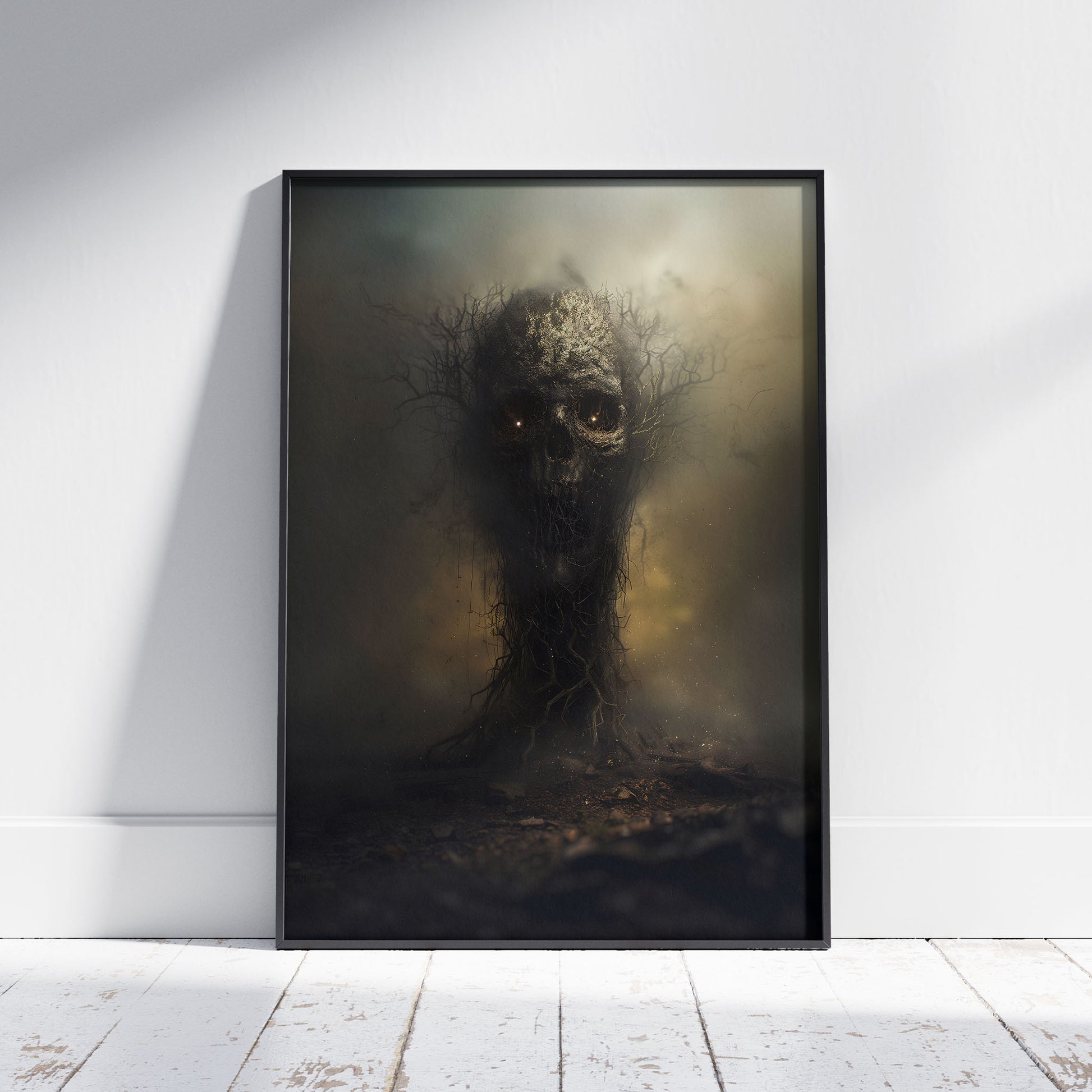 Decorate your space with an eerie touch by adding this Tree of Death Wall Art to your collection. This dark aesthetic poster features a haunting design of a creepy skull print intertwined with twisted branches, perfect for those who embrace the macabre. Add a touch of mystery and intrigue to your home decor with this unique and chilling piece.