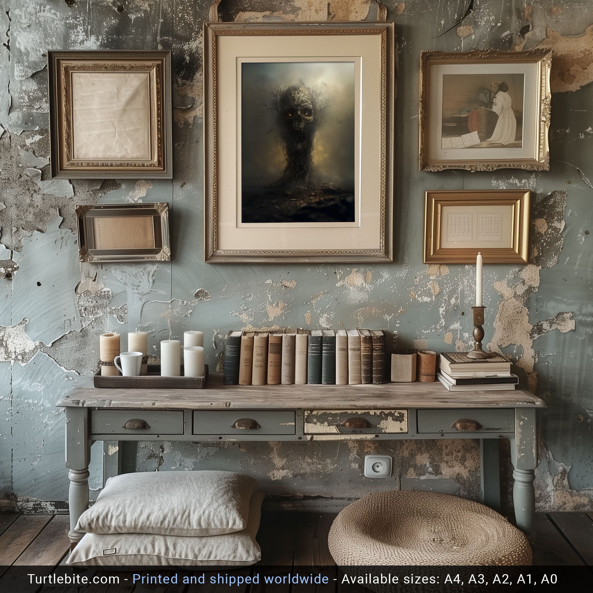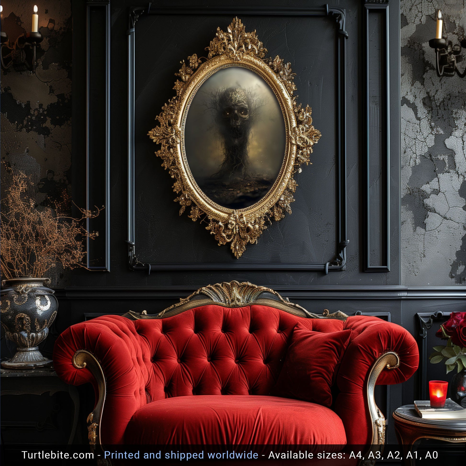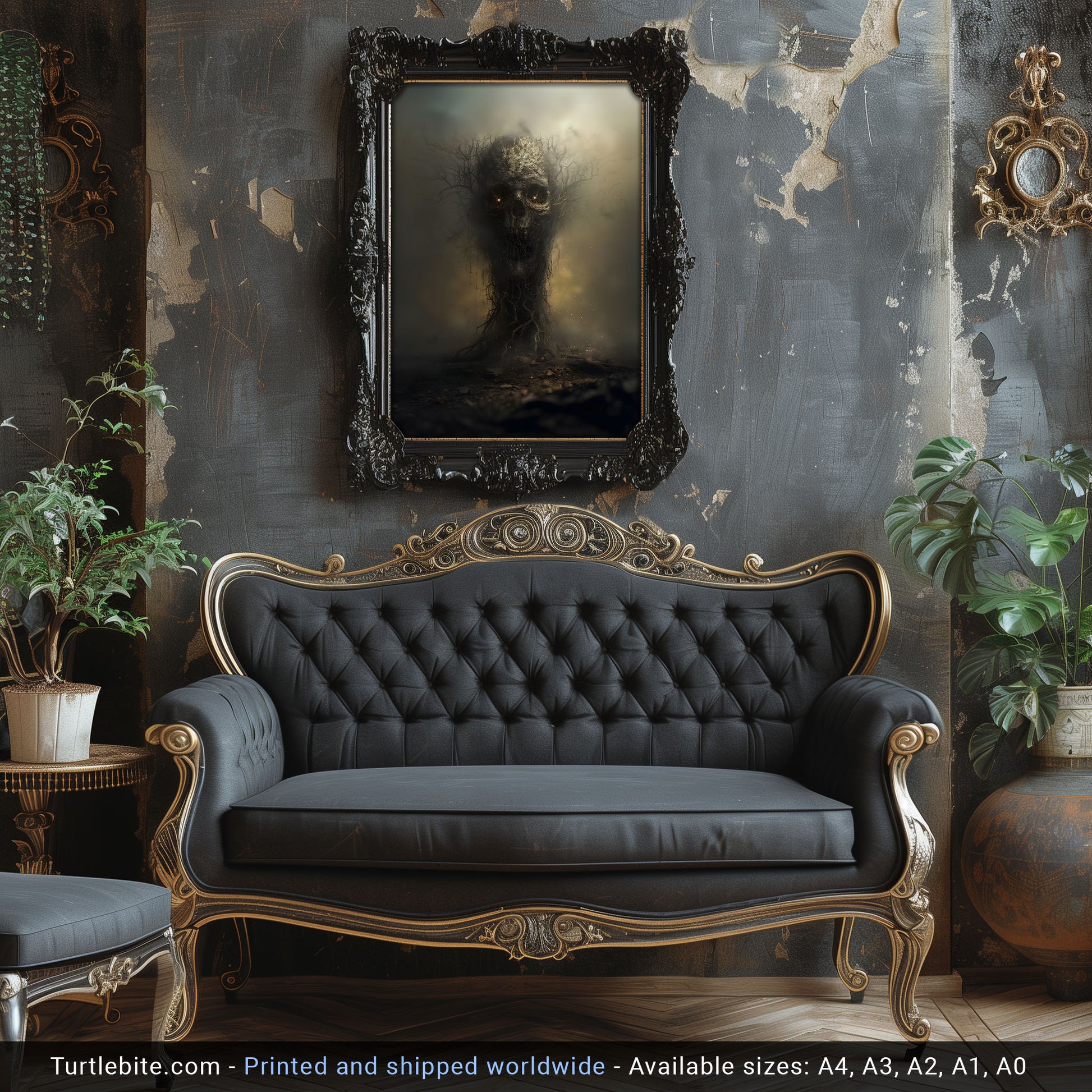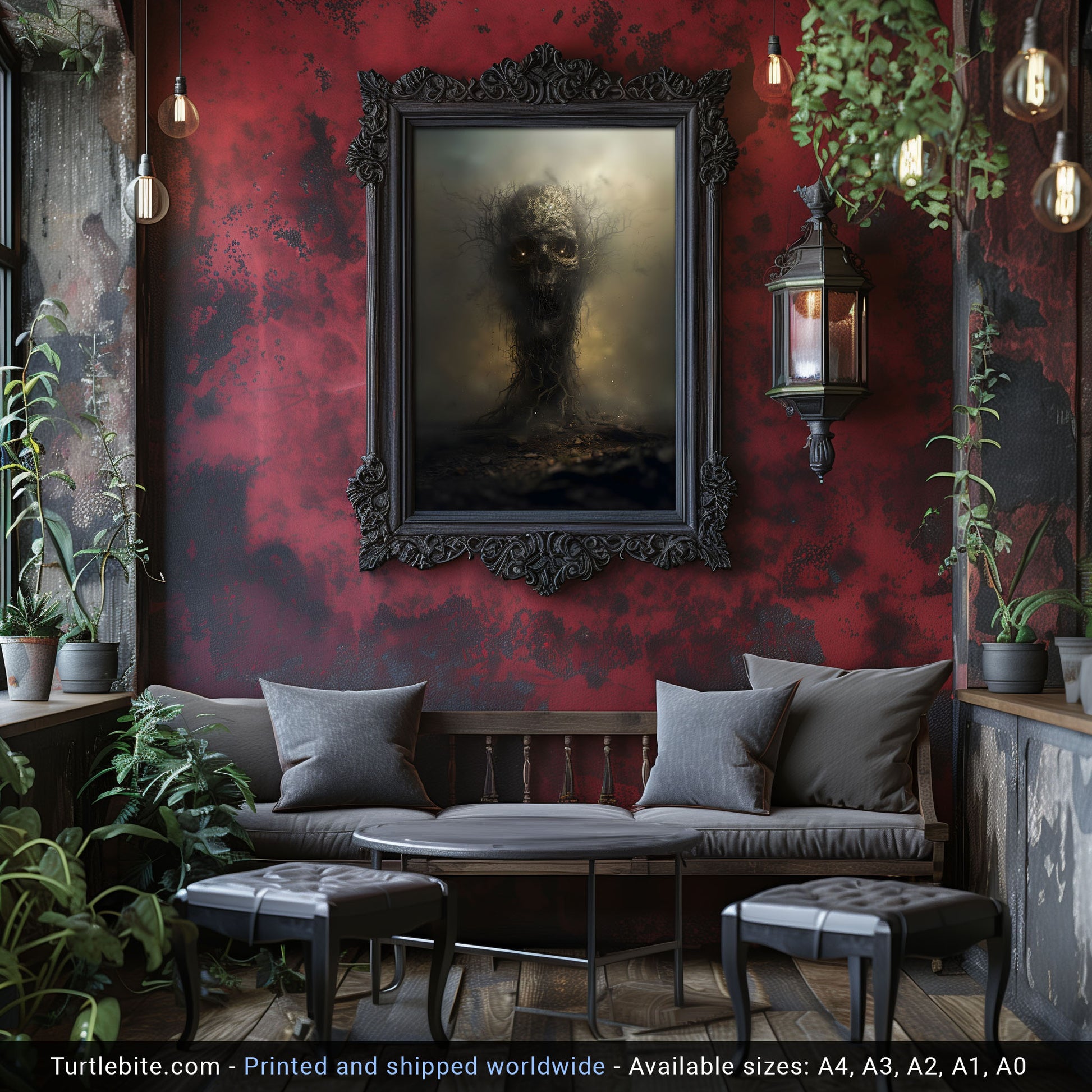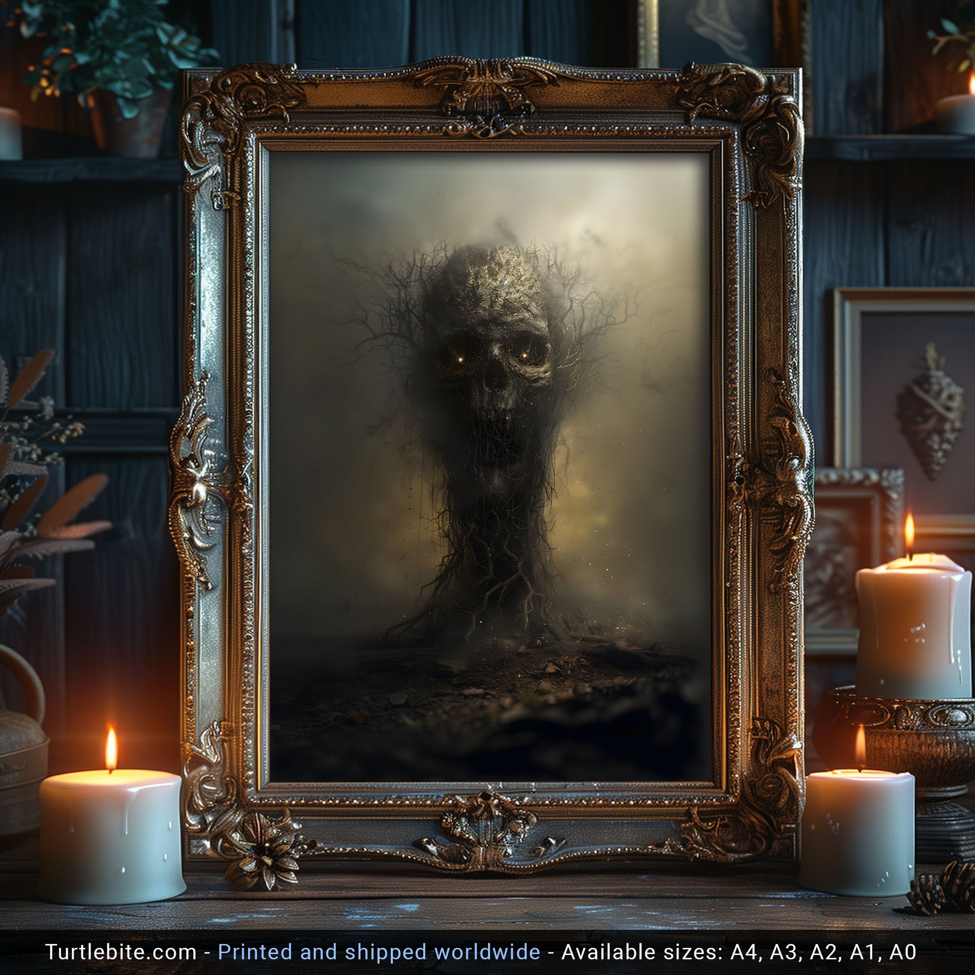 Decorate your space with an eerie touch by adding this Tree of Death Wall Art to your collection. This dark aesthetic poster features a haunting design of a creepy skull print intertwined with twisted branches, perfect for those who embrace the macabre. Add a touch of mystery and intrigue to your home decor with this unique and chilling piece.