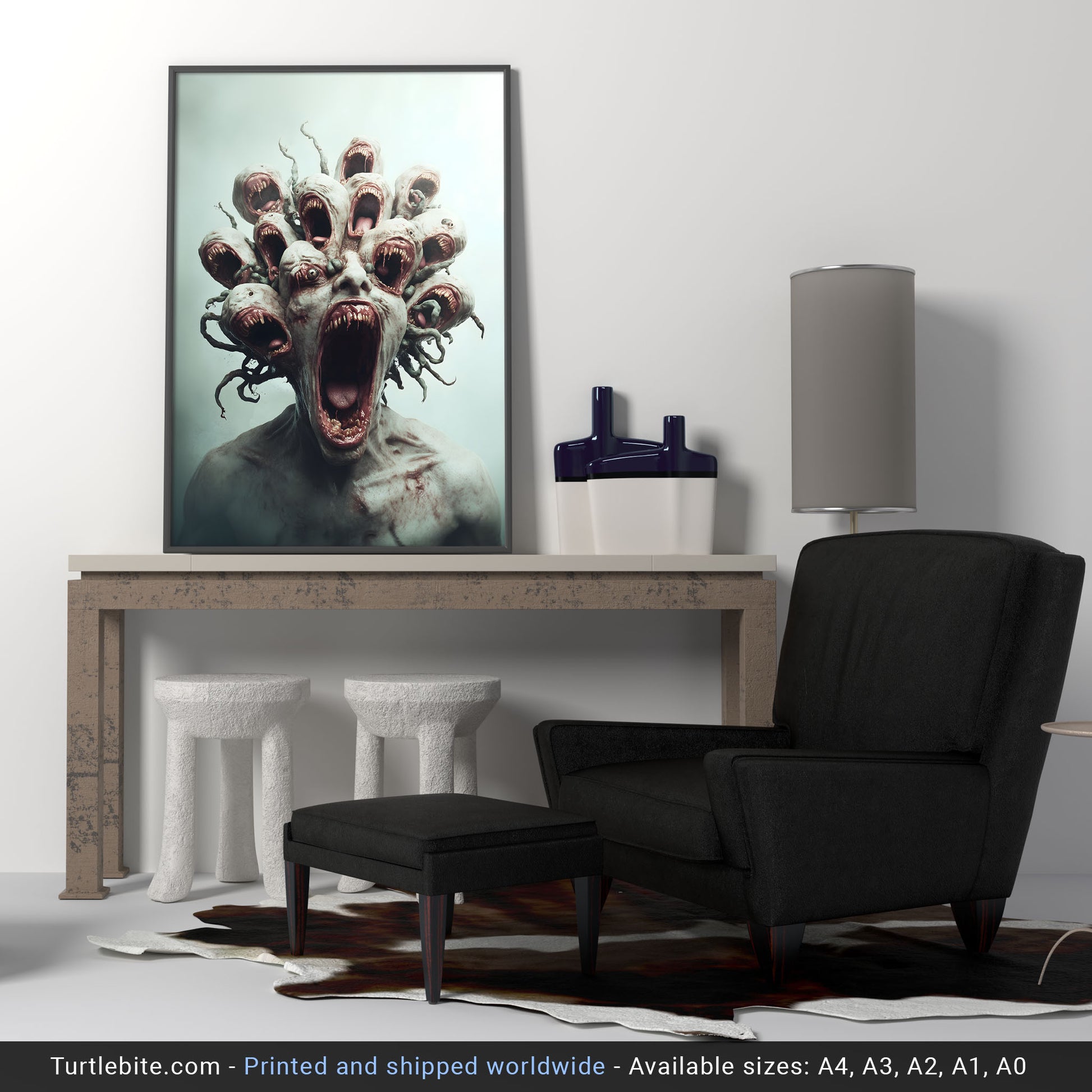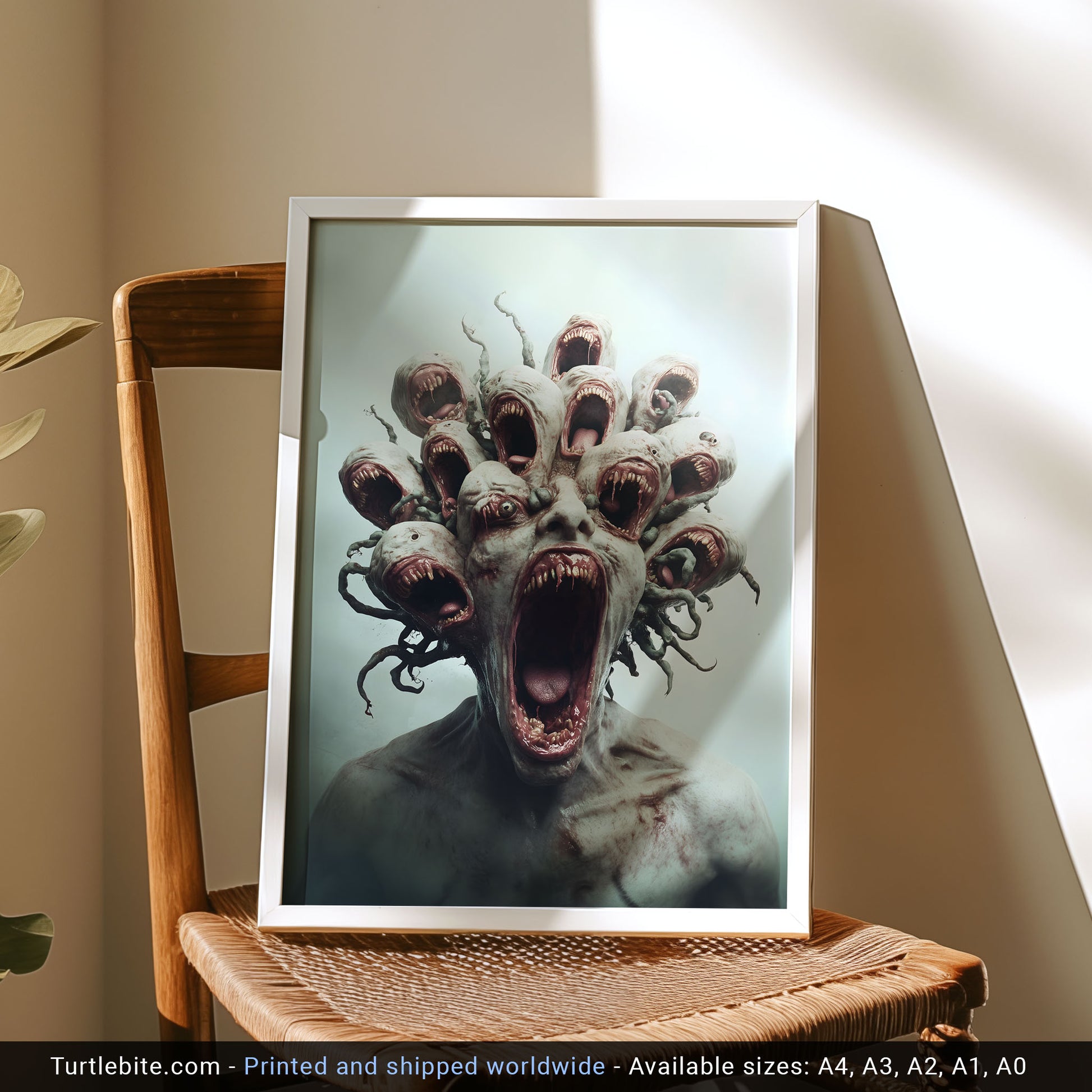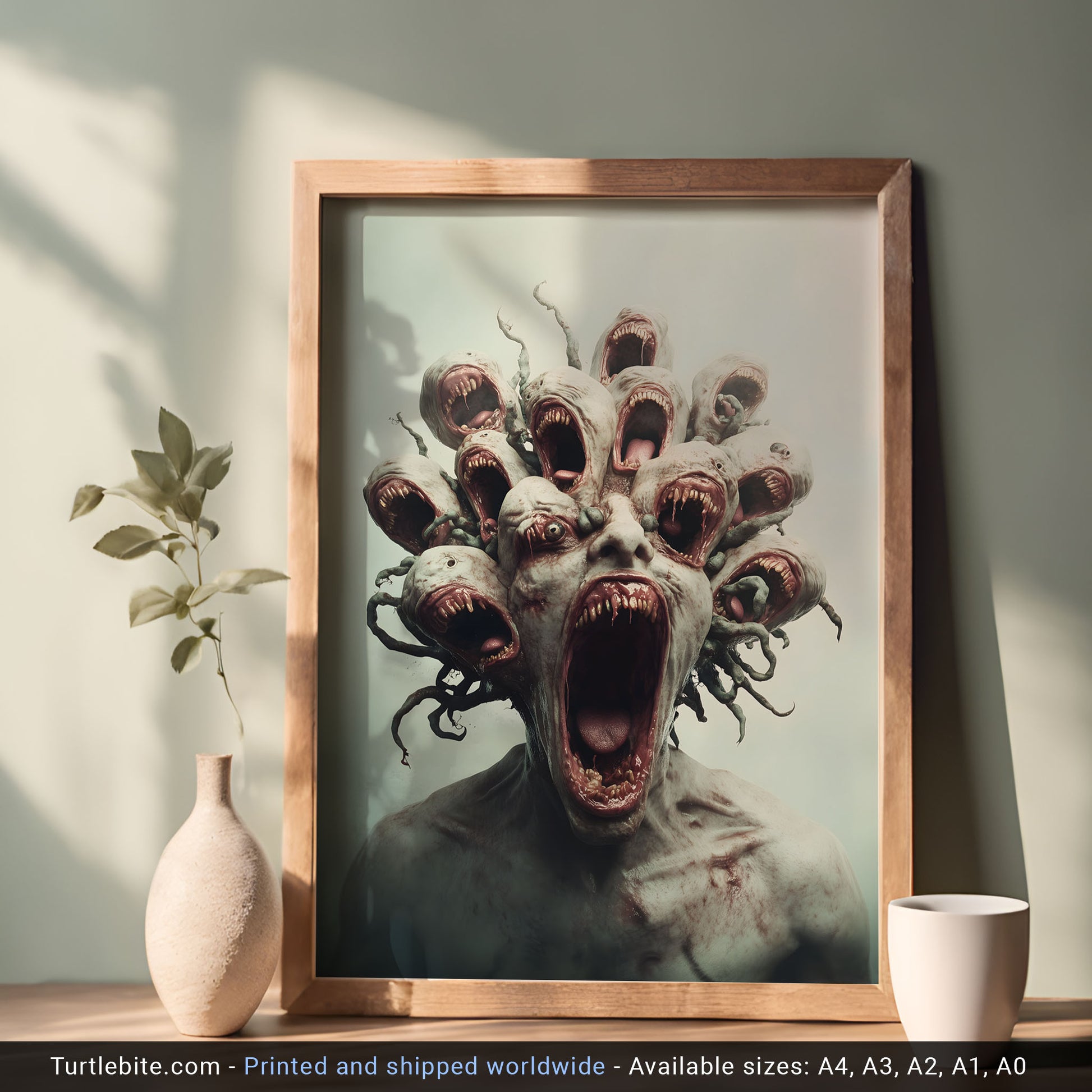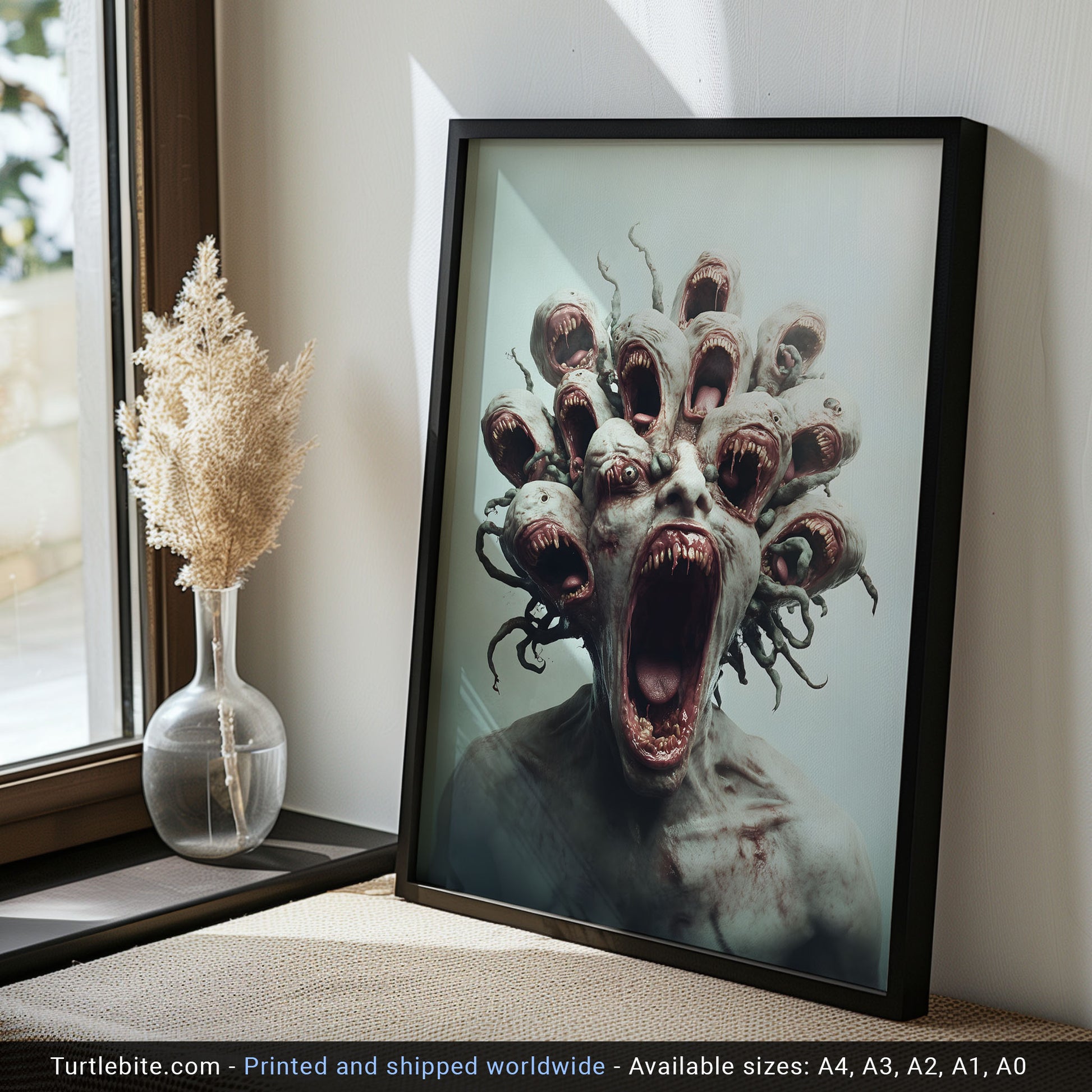 Unleash your wild side with the "Fierce Multi-Headed Monster Print"! This captivating dark art poster blends surrealism and fantasy, featuring a grotesque, multi-headed creature that will add an edgy flair to any space. Perfect for lovers of the macabre, this striking piece makes an unforgettable gift for witches, artists, or anyone who appreciates gory, thought-provoking wall art. Transform your walls into a haunting gallery with this unique print that’s sure to spark conversations and intrigue!