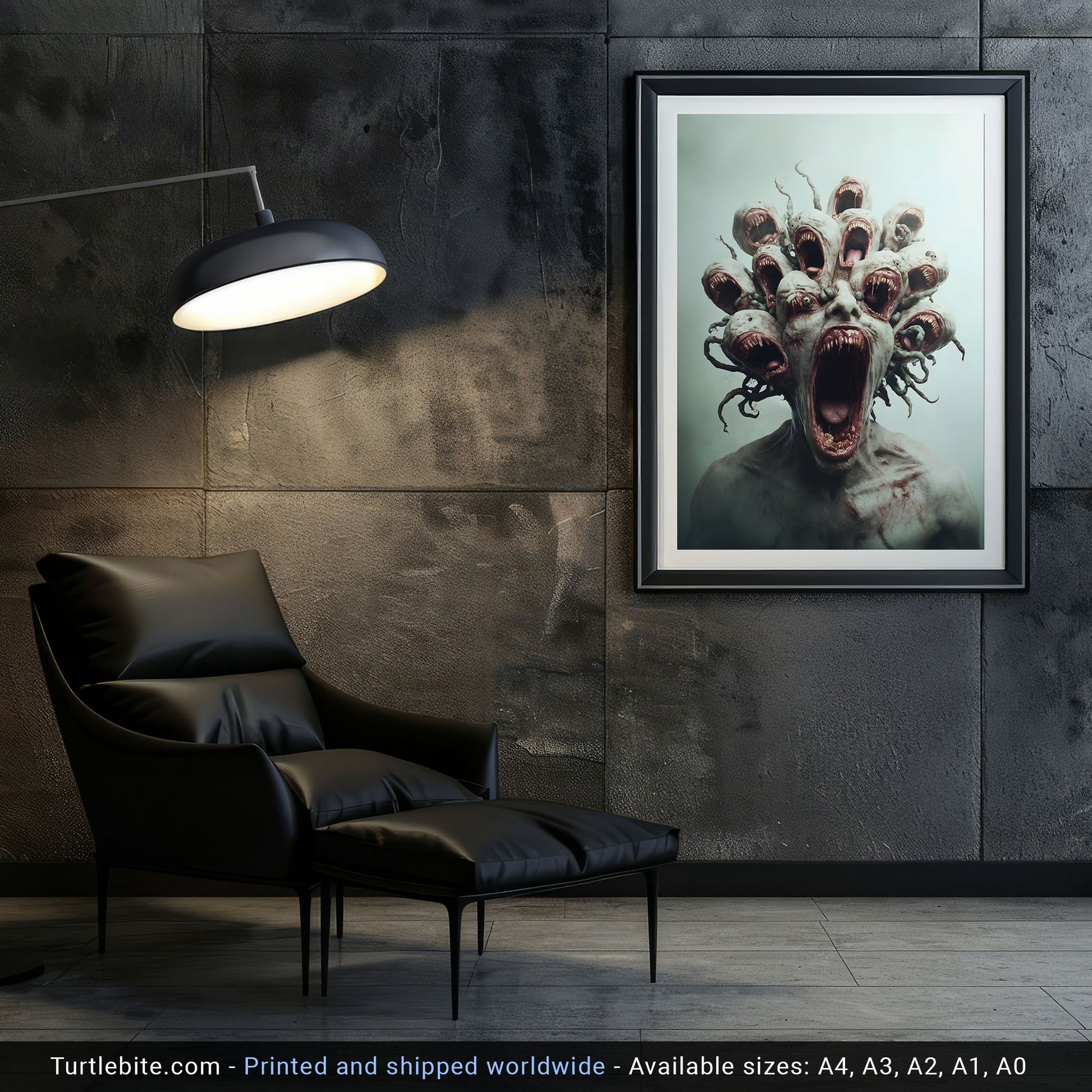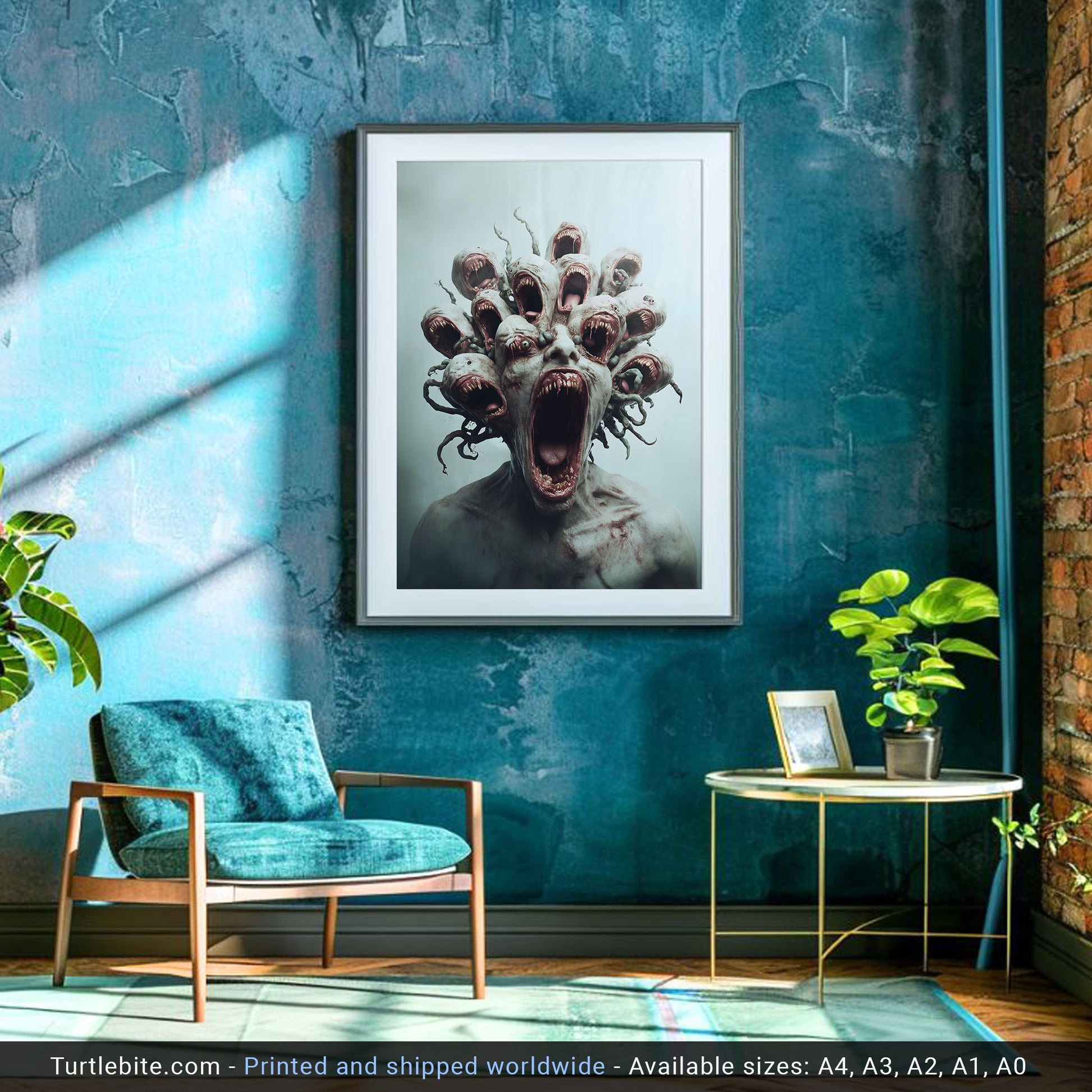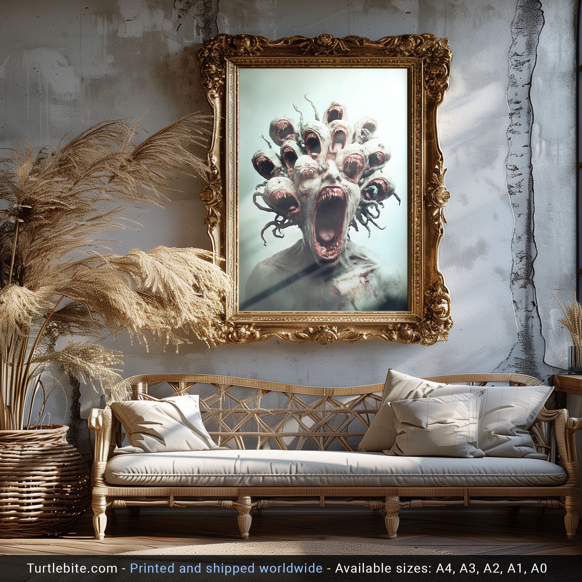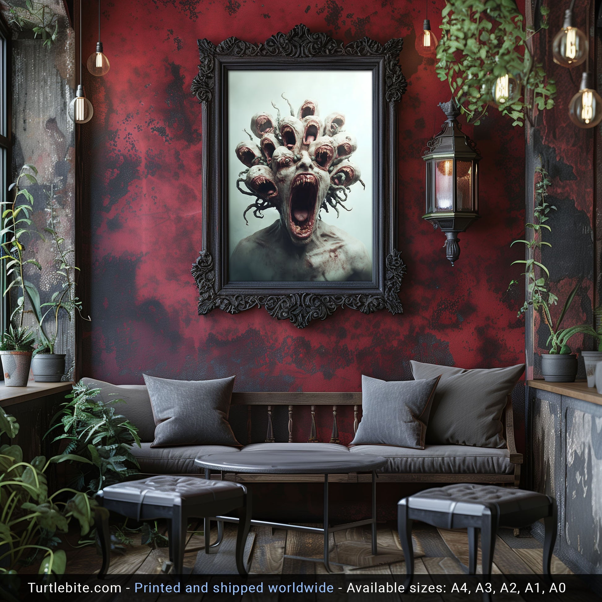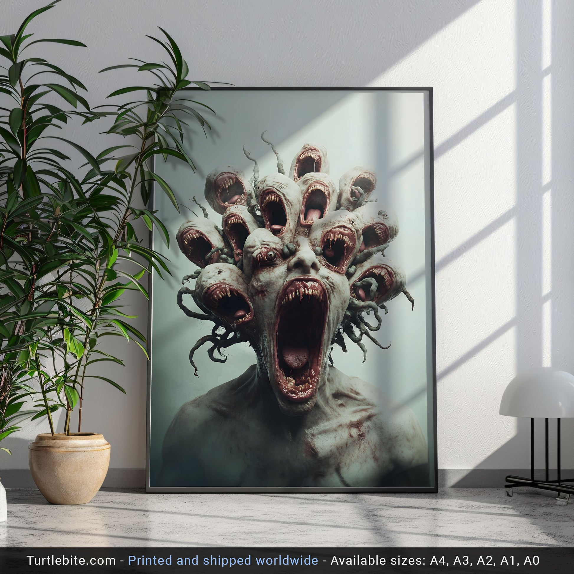 Unleash your wild side with the "Fierce Multi-Headed Monster Print"! This captivating dark art poster blends surrealism and fantasy, featuring a grotesque, multi-headed creature that will add an edgy flair to any space. Perfect for lovers of the macabre, this striking piece makes an unforgettable gift for witches, artists, or anyone who appreciates gory, thought-provoking wall art. Transform your walls into a haunting gallery with this unique print that’s sure to spark conversations and intrigue!
