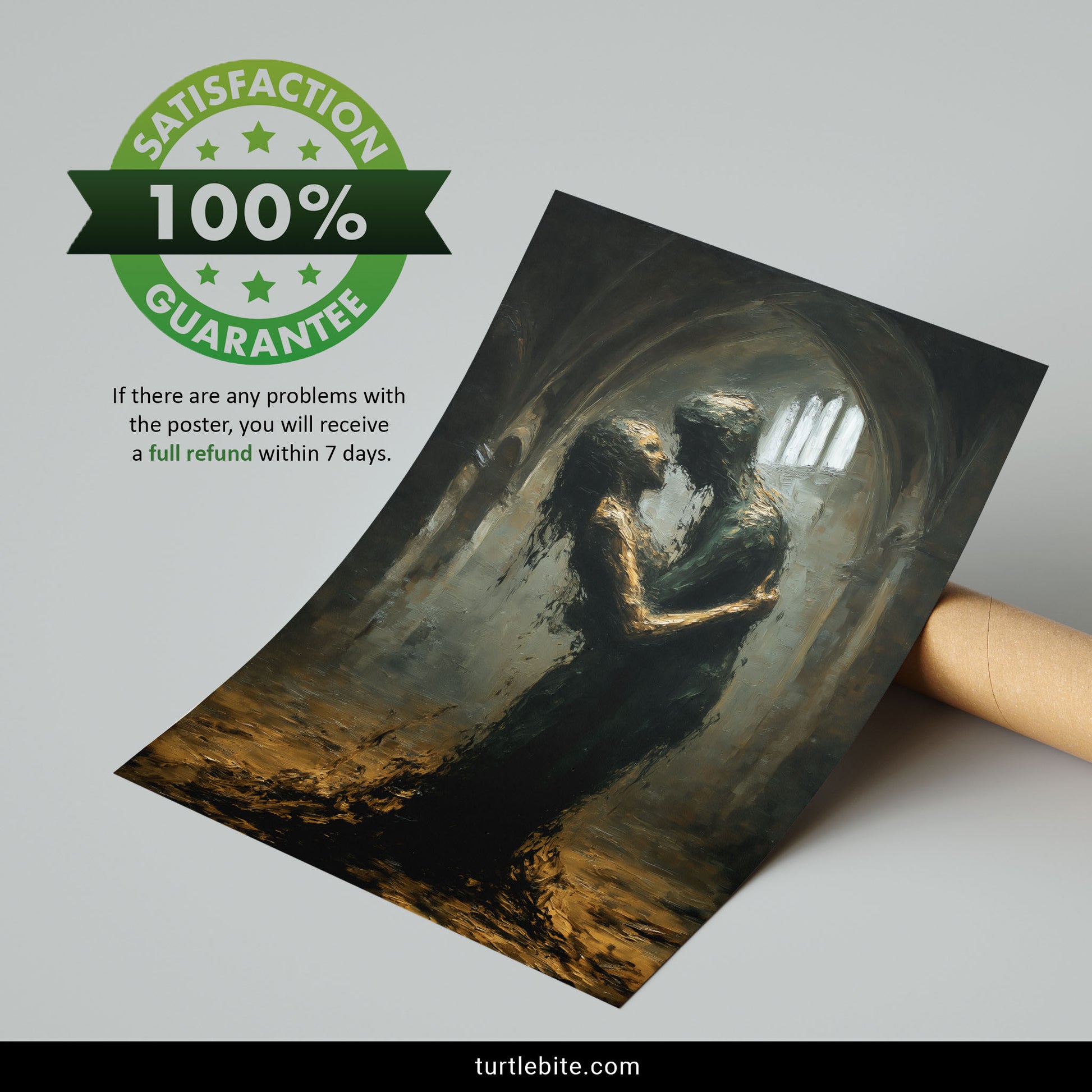 The moody painting works beautifully in spaces that embrace alternative decor – your reading nook, bedroom, or anywhere you've decided conventional romance isn't cutting it. It speaks to those who understand that real beauty often exists in liminal spaces, where light meets shadow and love flirts with obsession.