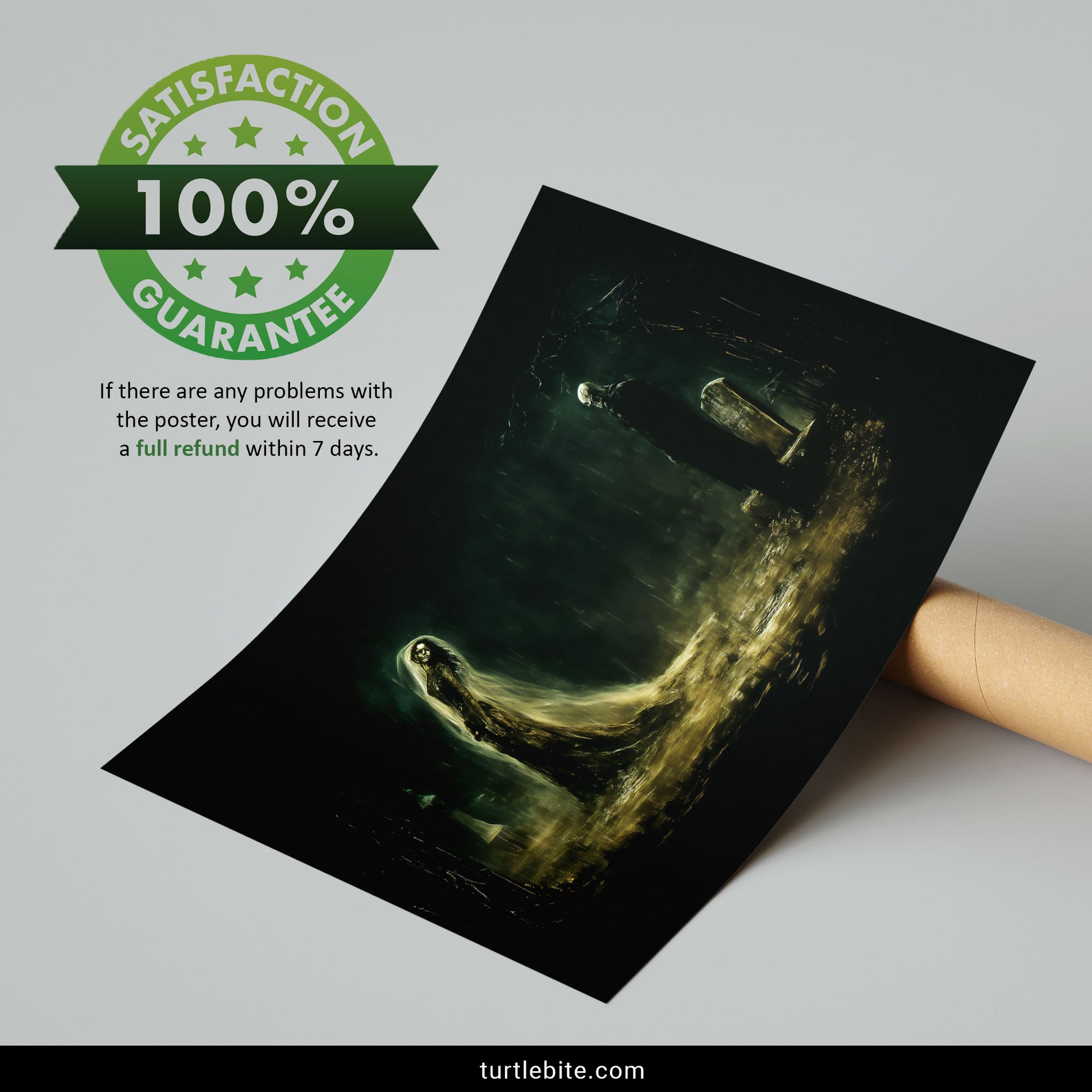 This isn't your typical cemetery poster. The golden-lit shrouds against that deep, fog-drenched green create an almost painterly quality – equal parts unsettling and exquisite. It's the visual equivalent of finding beauty in decay, which is exactly what memento mori is all about. Death doesn't have to be grim when it's this gorgeous.