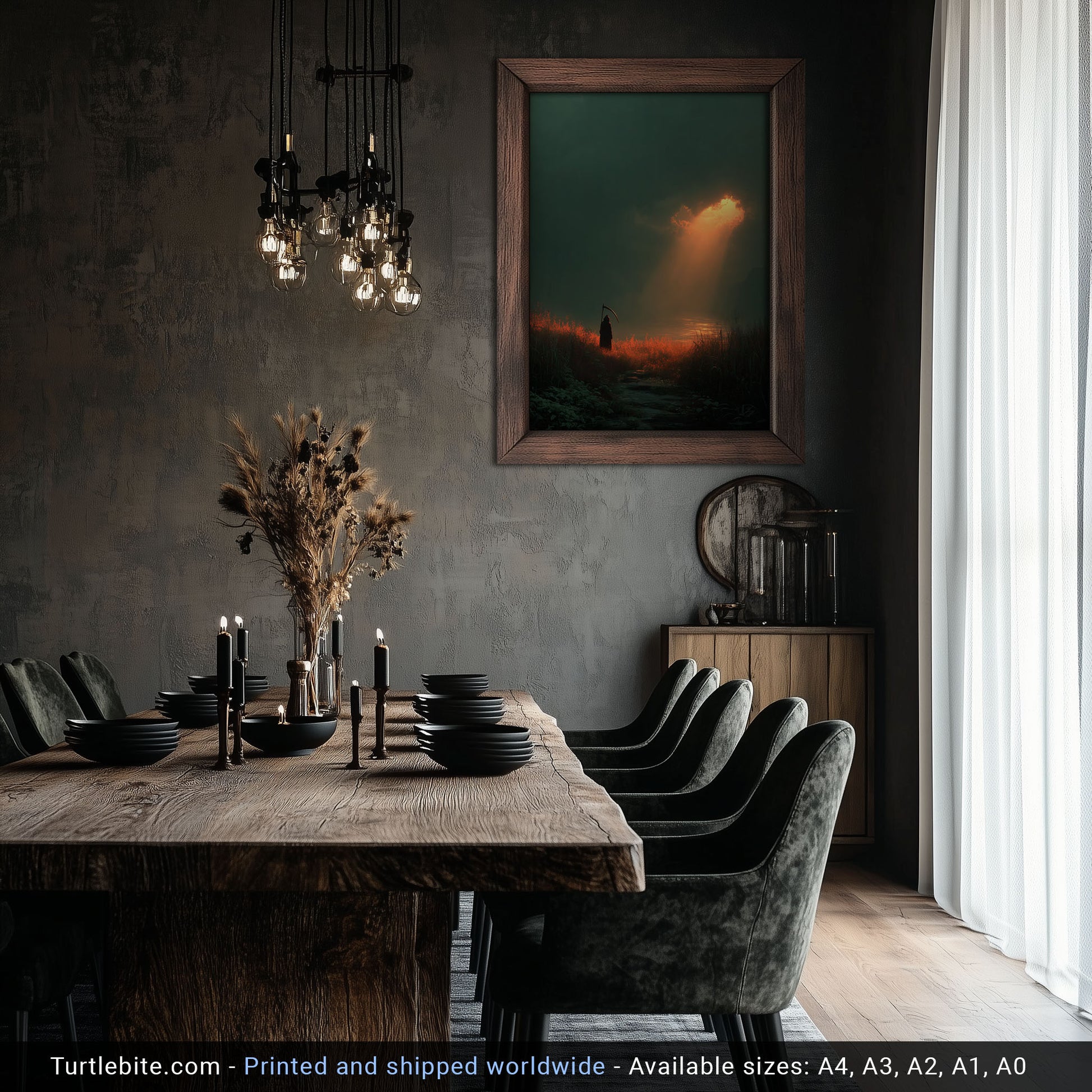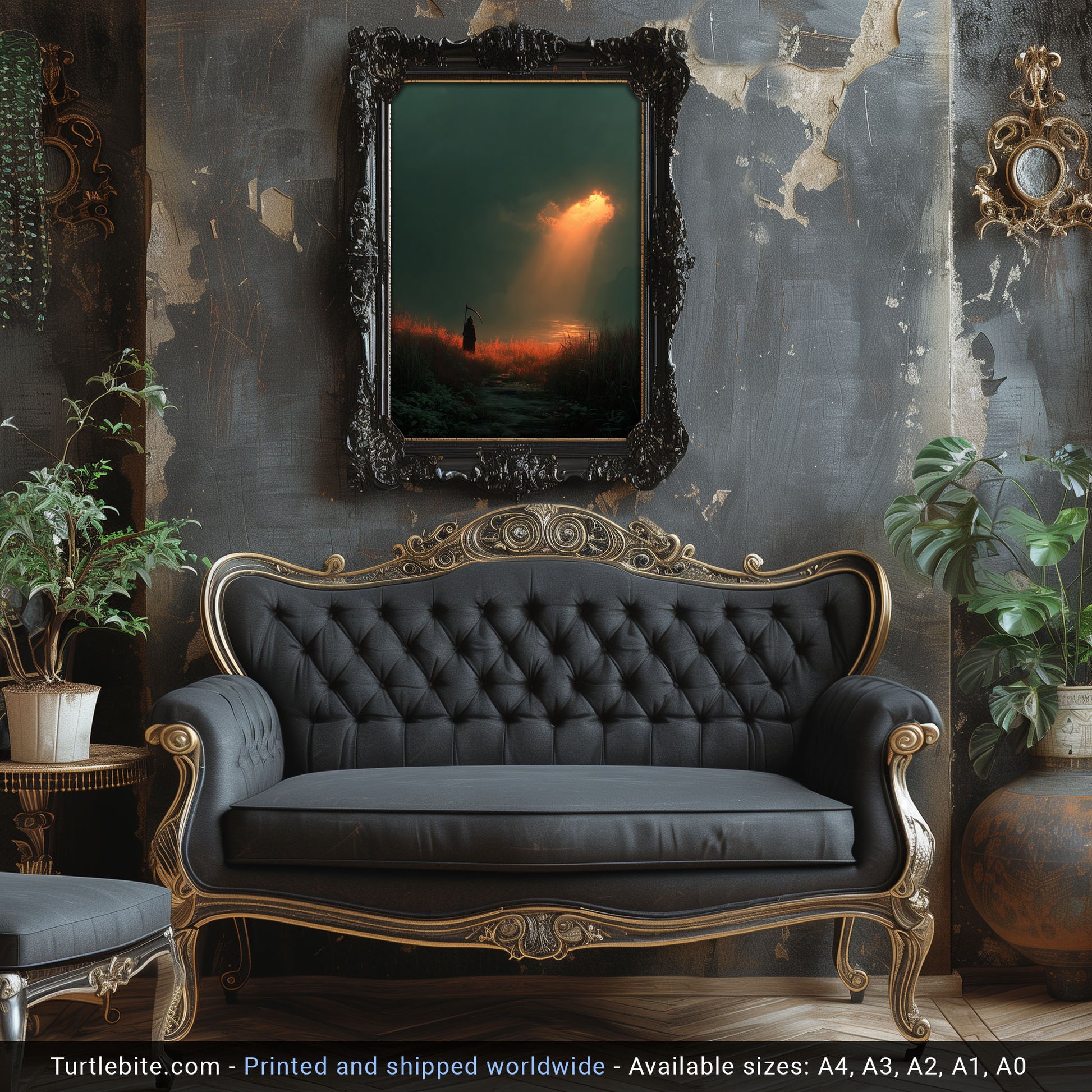 The print quality ensures every shadowy detail and dramatic contrast comes through beautifully. This is the kind of dark wall art that gets better every time you look at it – you'll notice new details, new moods, new stories unfolding in those mysterious depths.