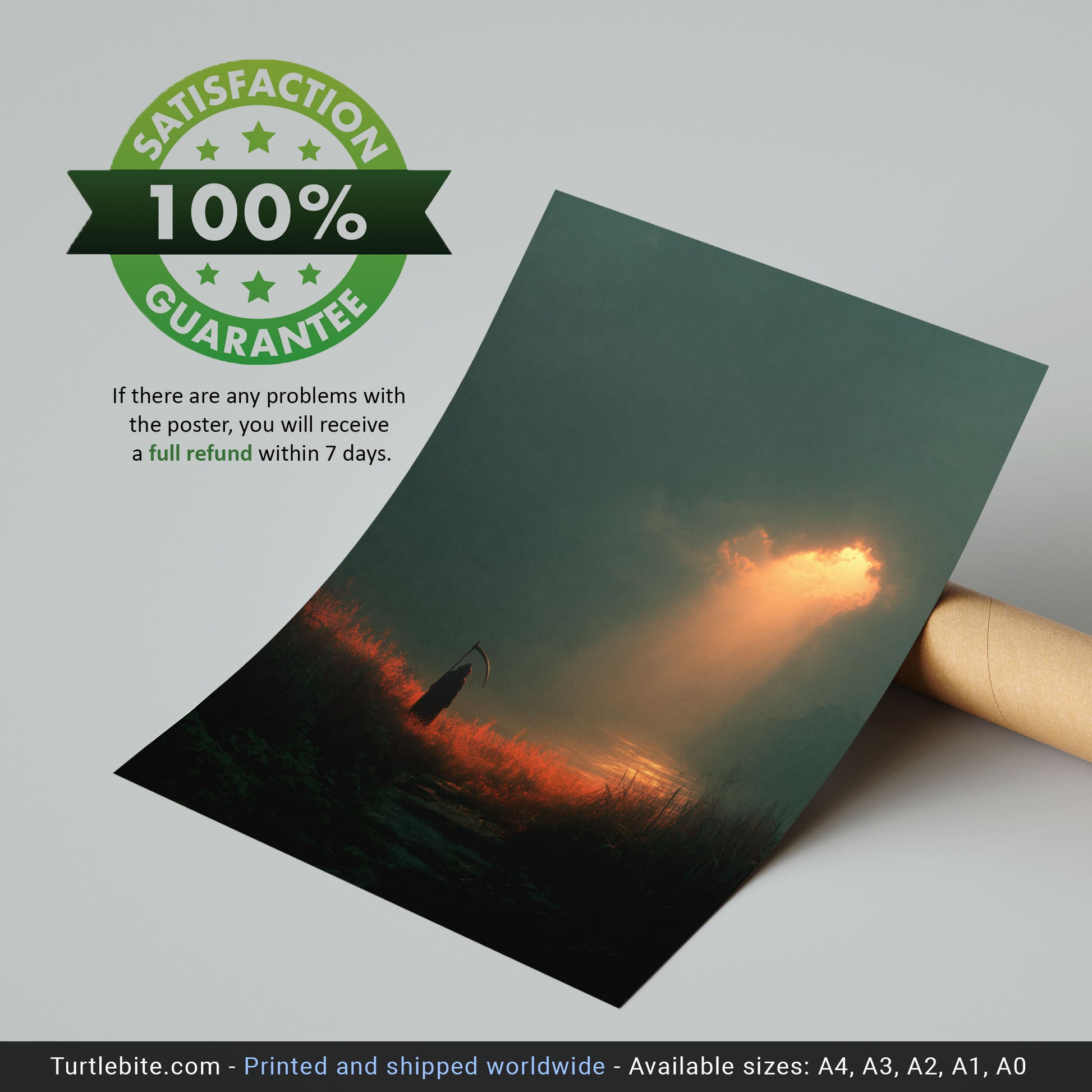 This isn't your typical poster. It's a conversation starter, a mood setter, and honestly? It's the kind of artwork that makes guests do a double-take. The mysterious cloaked figure stands sentinel beside tranquil waters, creating an almost cinematic quality that transforms any space into something more intriguing.