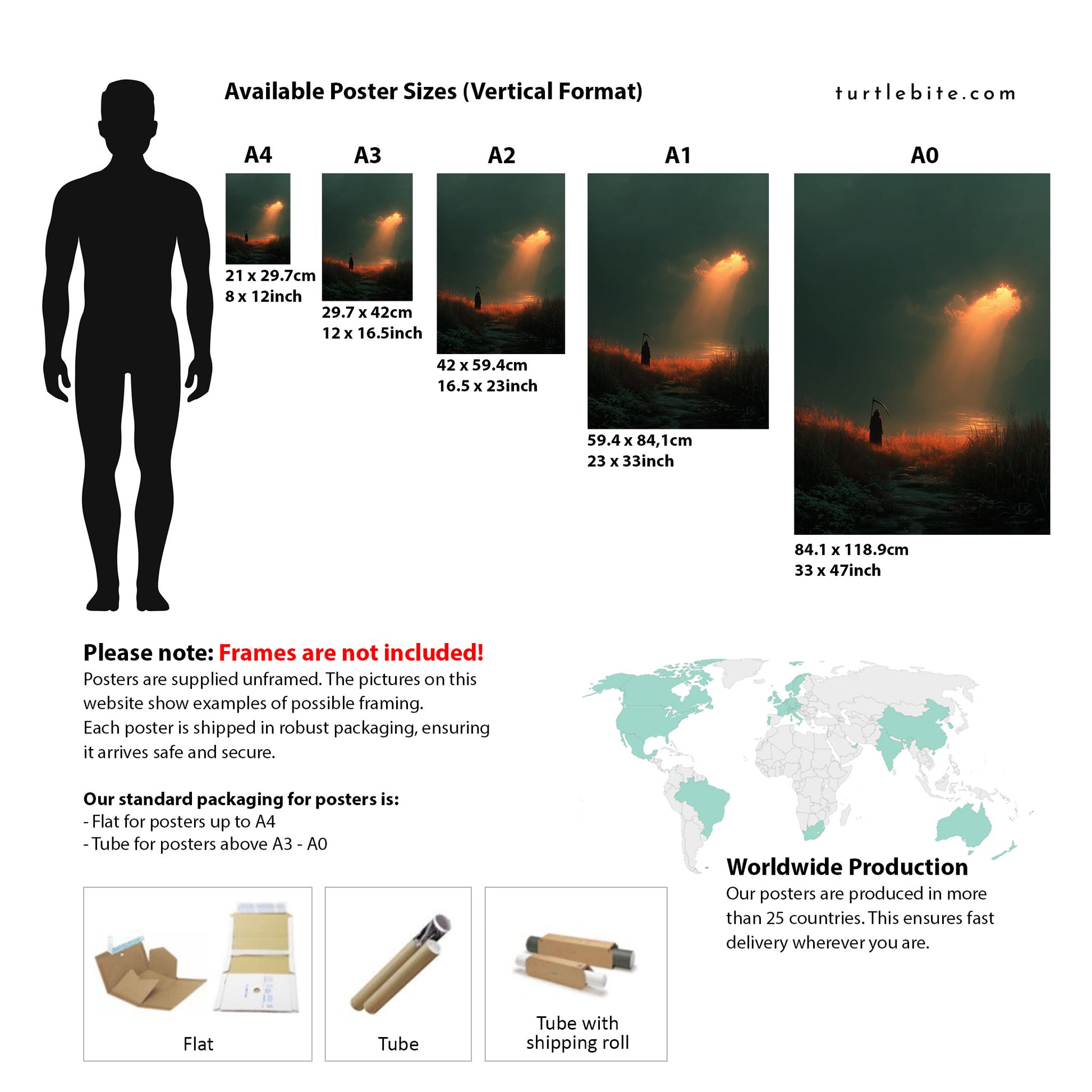 With a paper weight of 200 gsm/ 80 lb, it is perfect for long-lasting prints that are stunning to look at in all their vibrant glory. We use FSC-certified paper or equivalent certifications depending on regional availability. It’s better for the people and the planet. Each poster is shipped in robust packaging, ensuring it arrives safe and secure. Paper sizes may vary slightly by region. For the US and Canada, the measurement is in inches, while for the rest of the world, it is in centimeters. This product is carefully made especially for you as soon as you place an order, which is why it takes us a bit longer to deliver it to you.