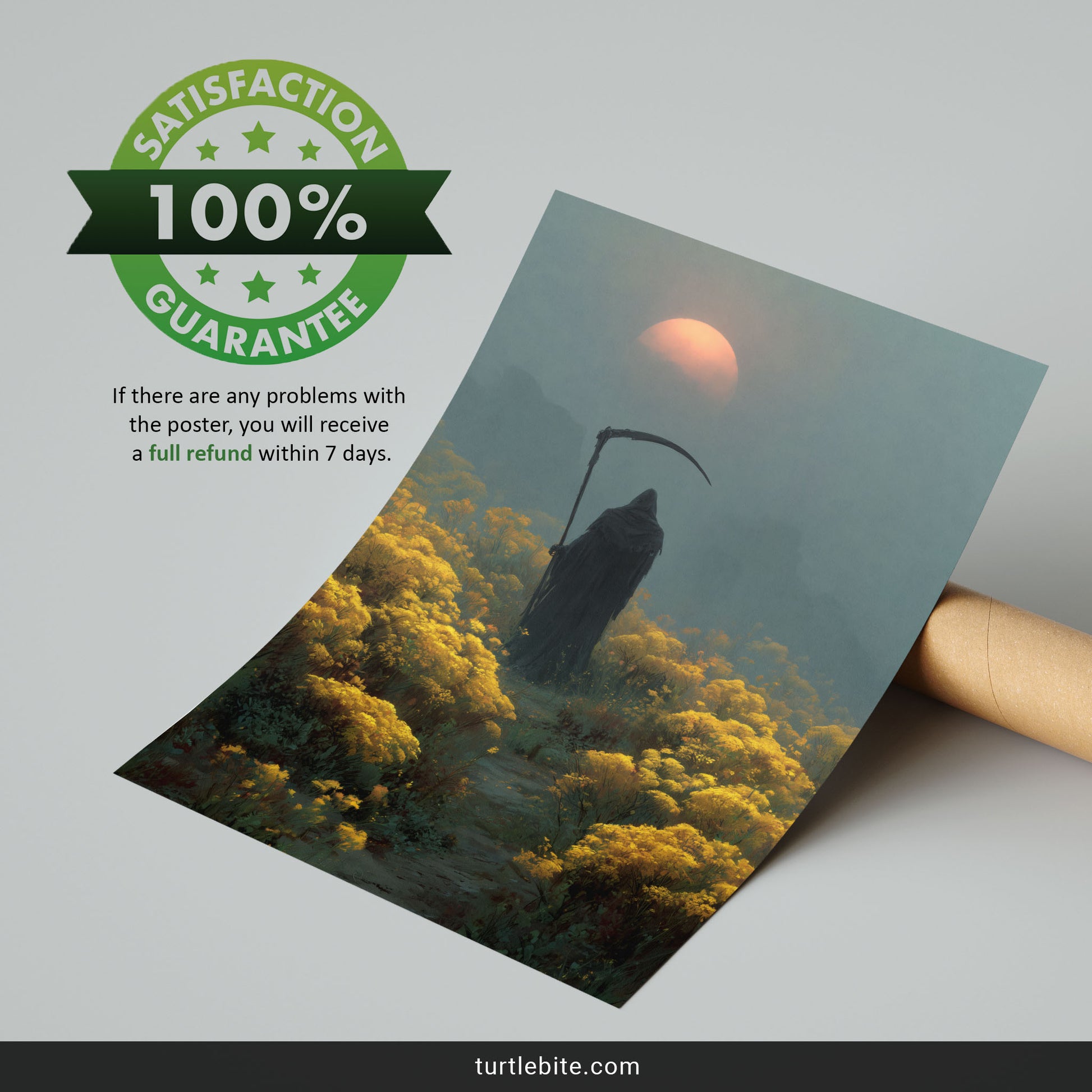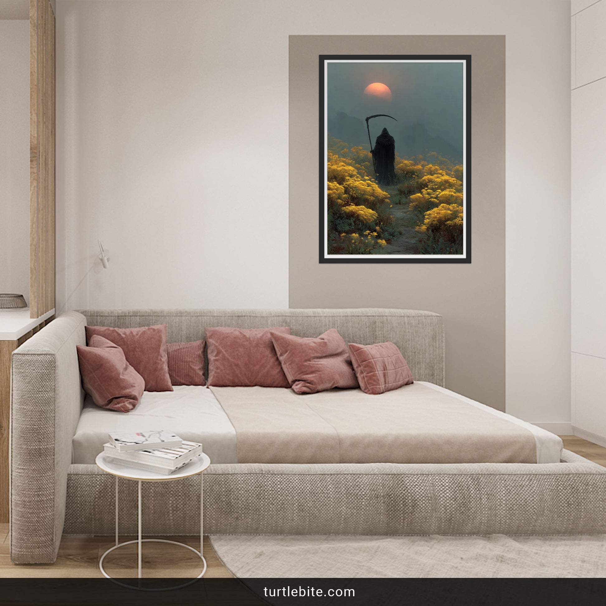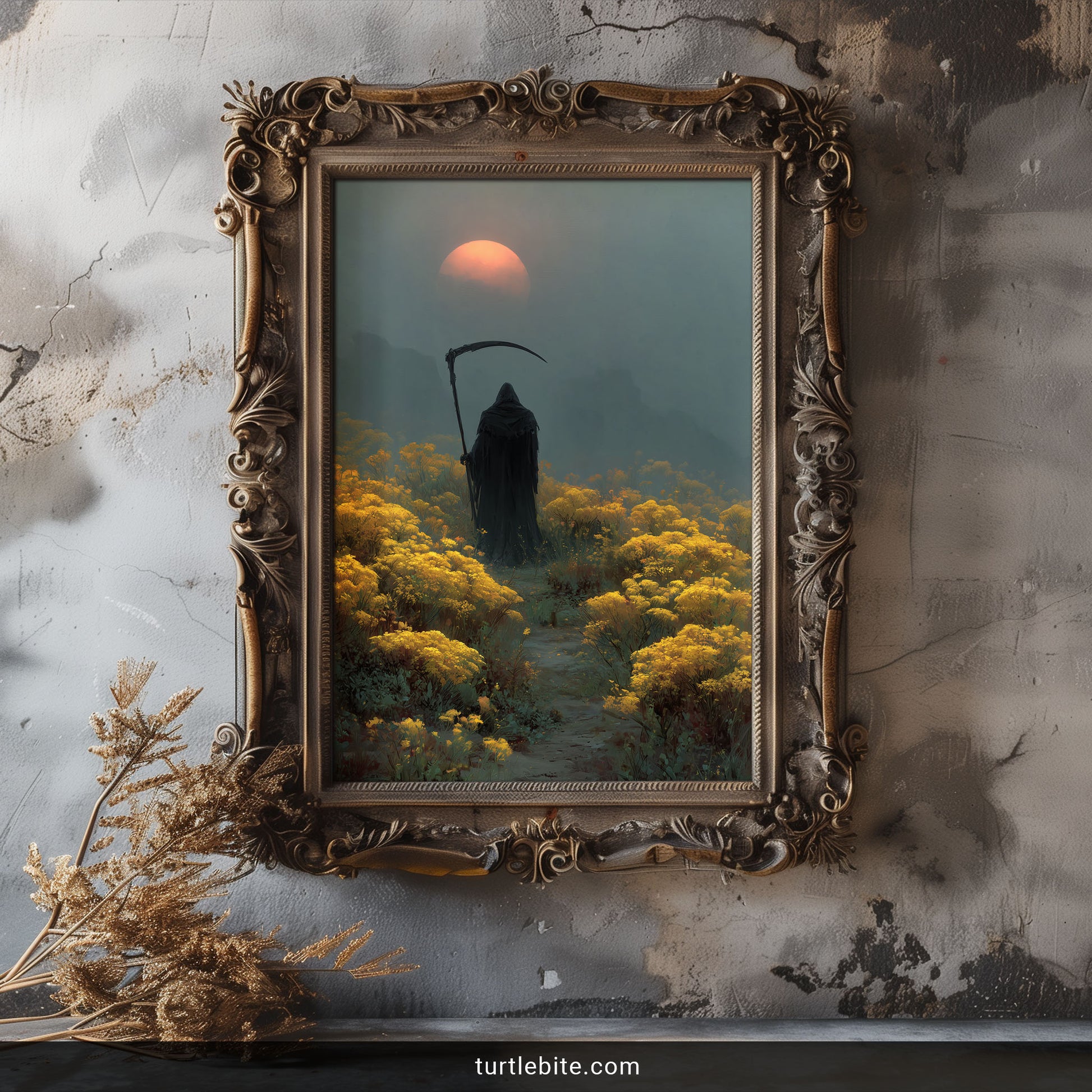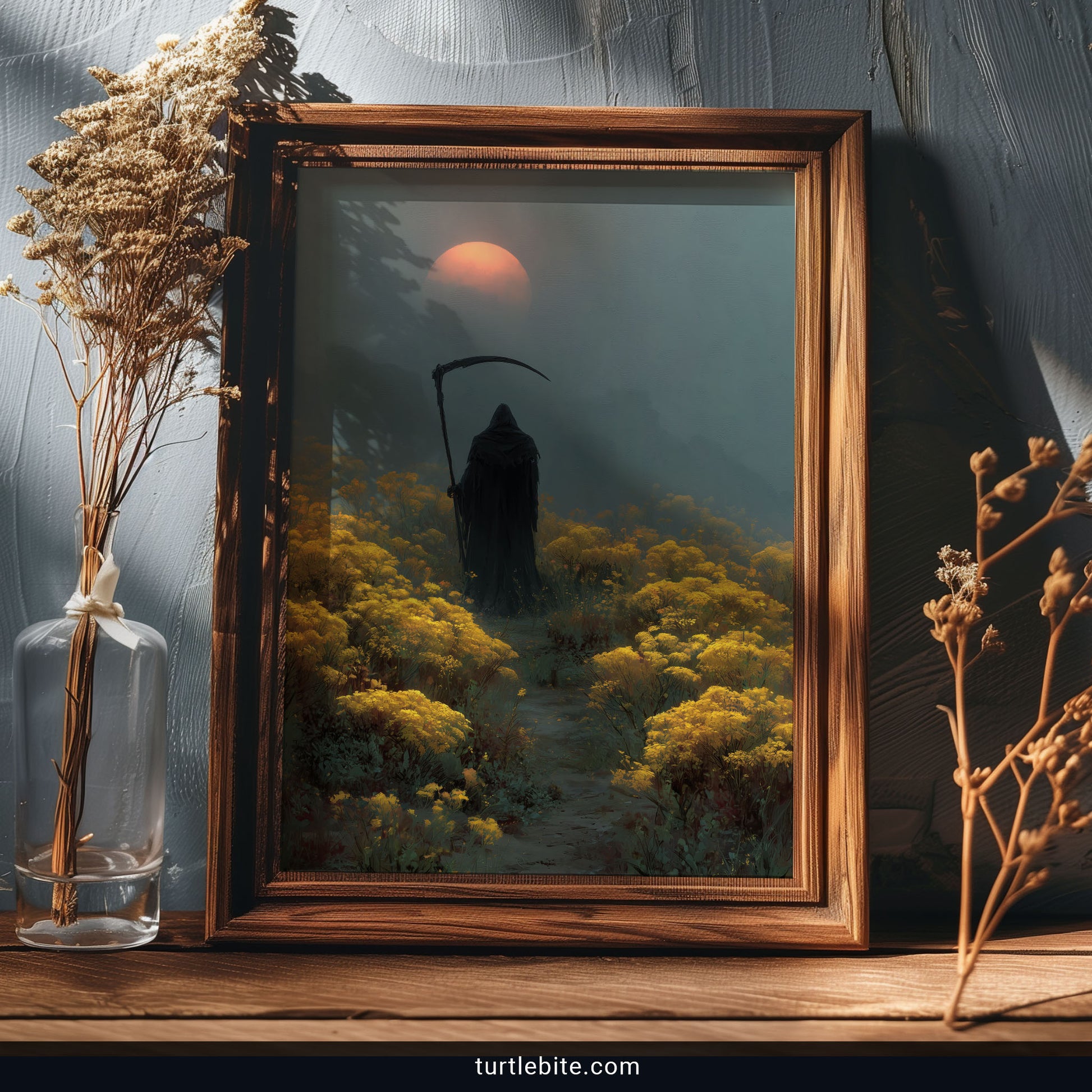 This isn't your typical dark art piece. While most gothic artwork goes for pure shock value, this print strikes that perfect balance between haunting and beautiful. The Grim Reaper stands serenely among a field of golden wildflowers, creating an unexpectedly peaceful scene that challenges everything you think you know about death imagery.