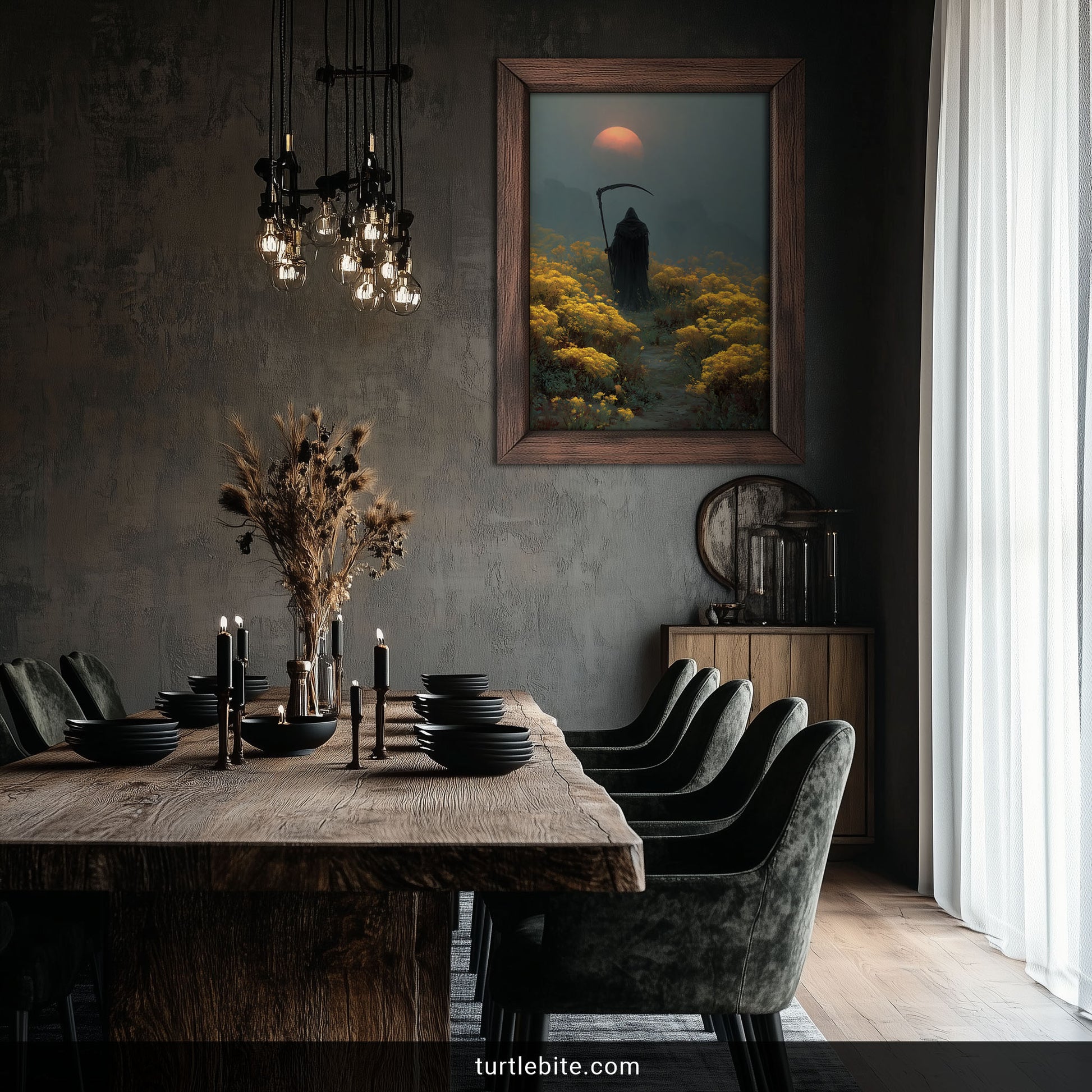 Imagine your guests walk into your space and immediately stop in their tracks. That's exactly what happens when you hang this mesmerizing grim reaper art on your wall.