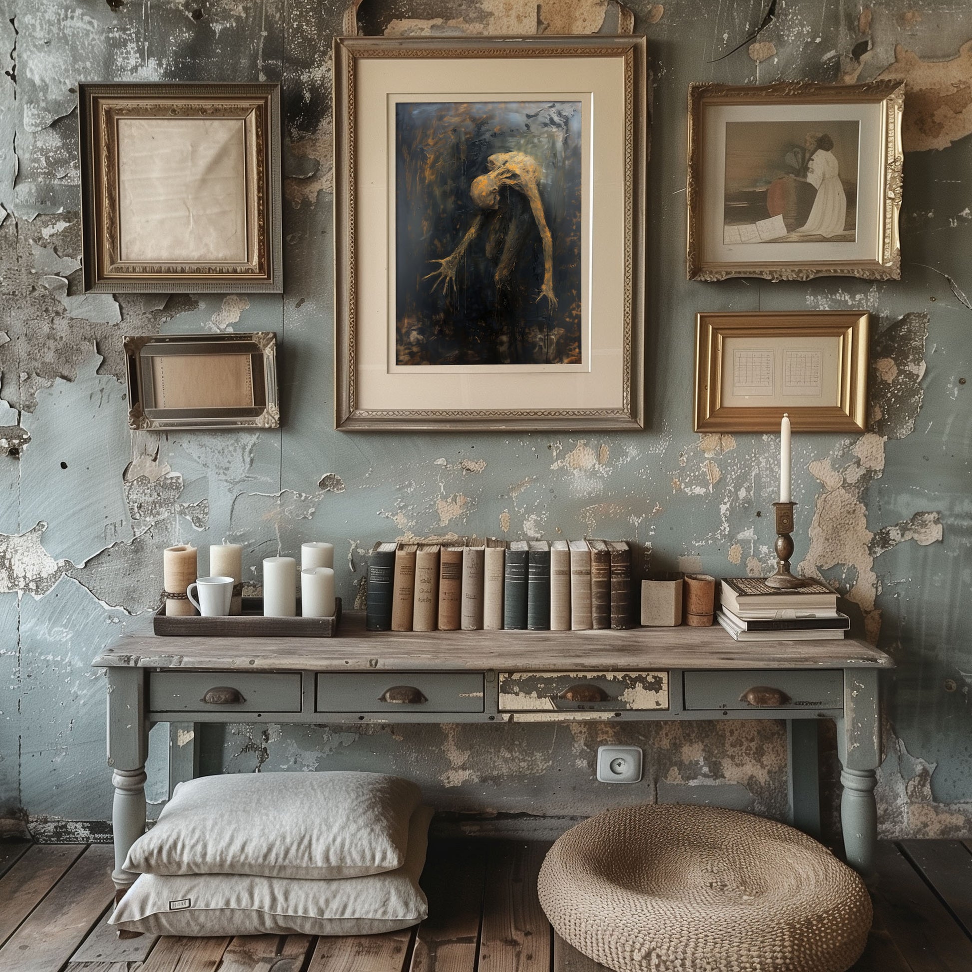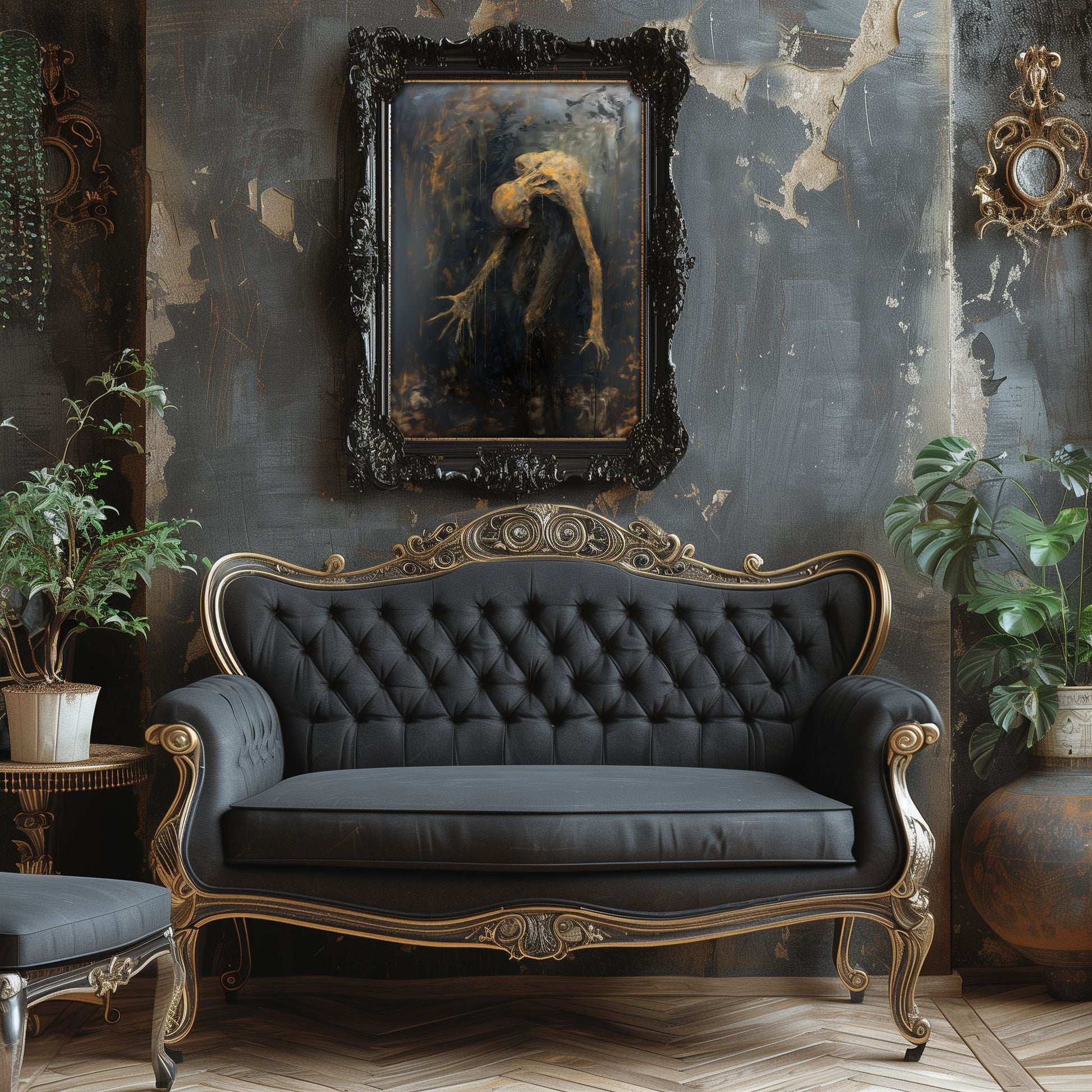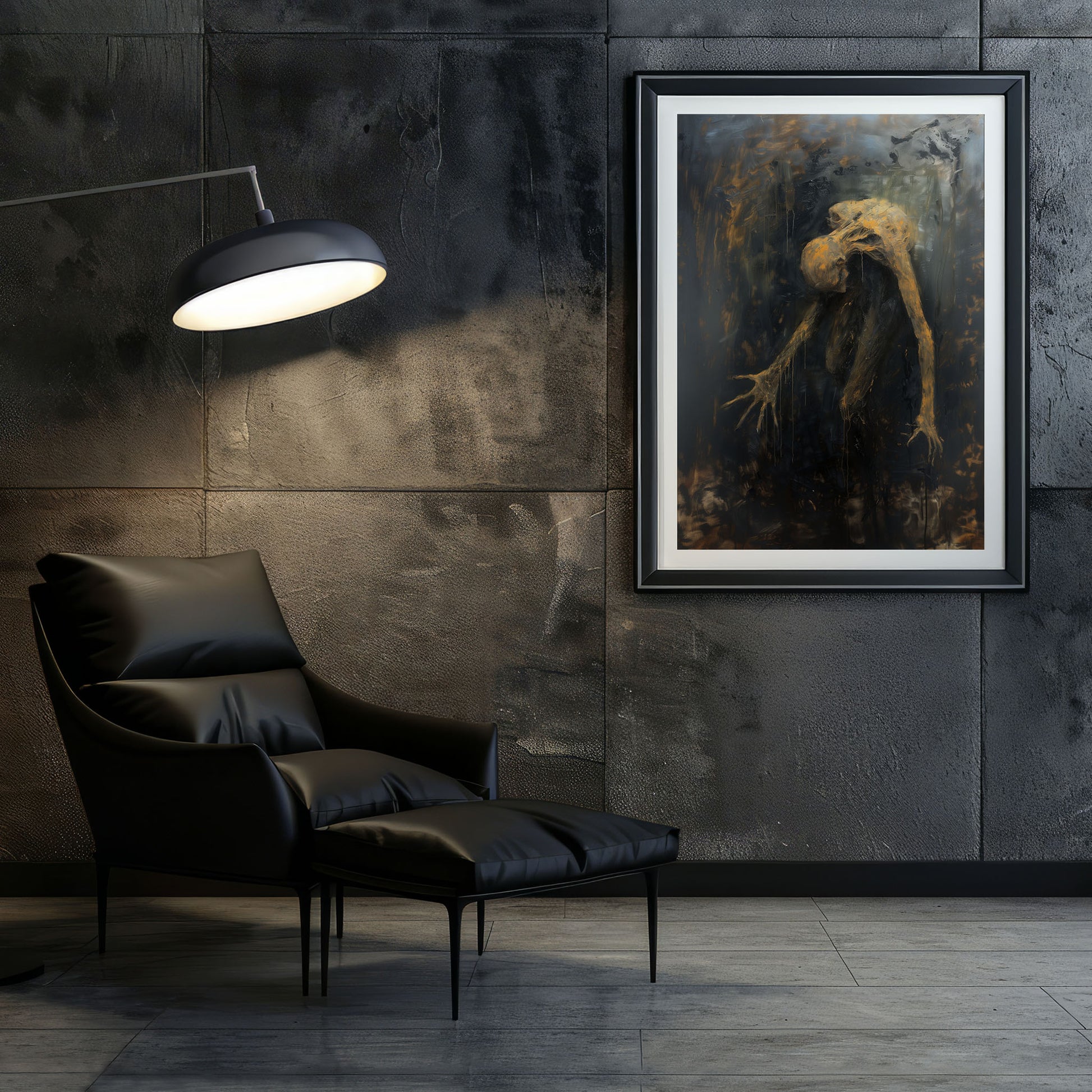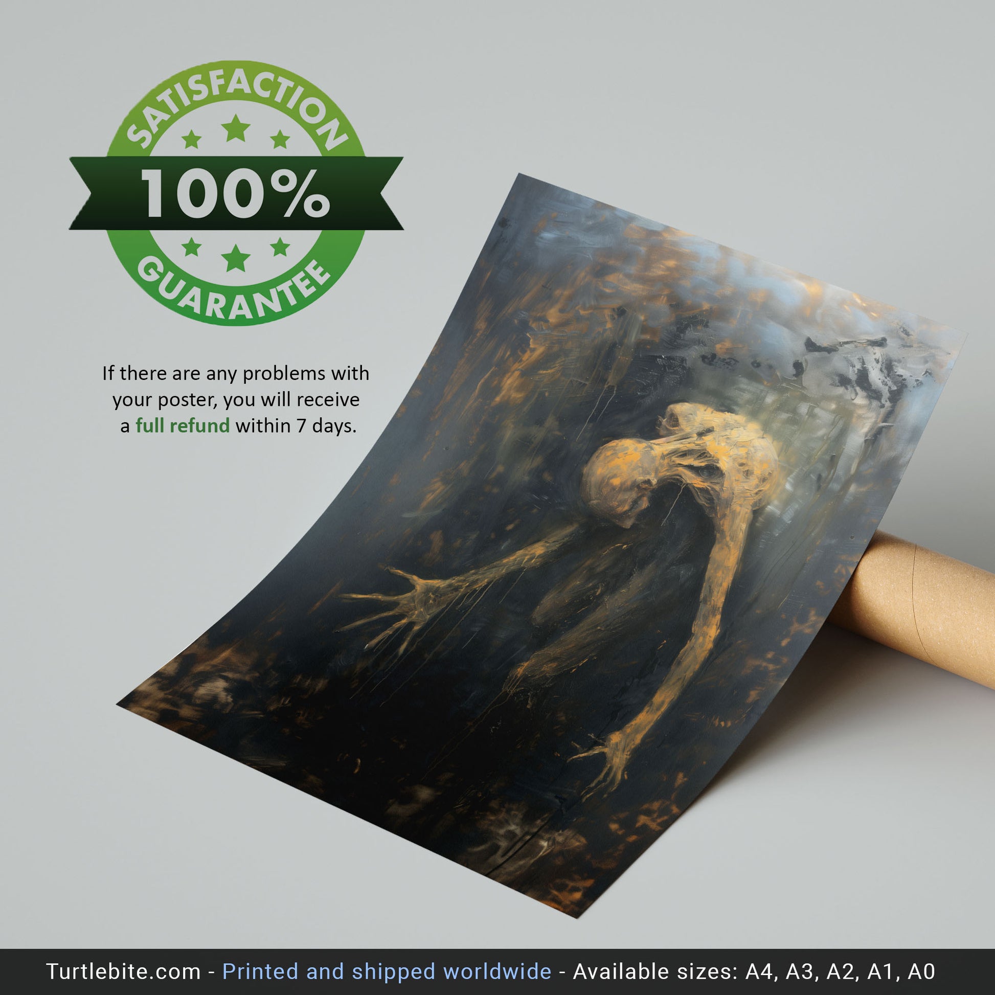 A chilling oil painting of a grotesque, bent-over creature dominates this gothic dark poster. The gritty textures and shadowy hues amplify the eerie atmosphere, evoking a sense of dread and macabre fascination. Perfect for those who appreciate unconventional art that sparks conversation and curiosity. Embrace the darker side of art with this one-of-a-kind piece that is sure to stand out in your collection.