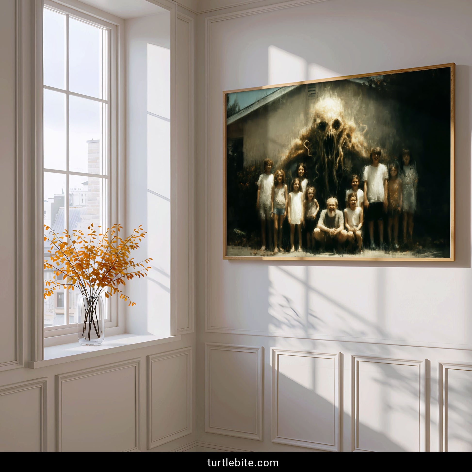 Your horror collector friends will obsess over the unsettling ambiguity – are the children aware of their monstrous companion? Is this a family portrait or a last photograph? The beauty lies in what you don't quite see clearly, what remains suggested in those haunting brushstrokes.