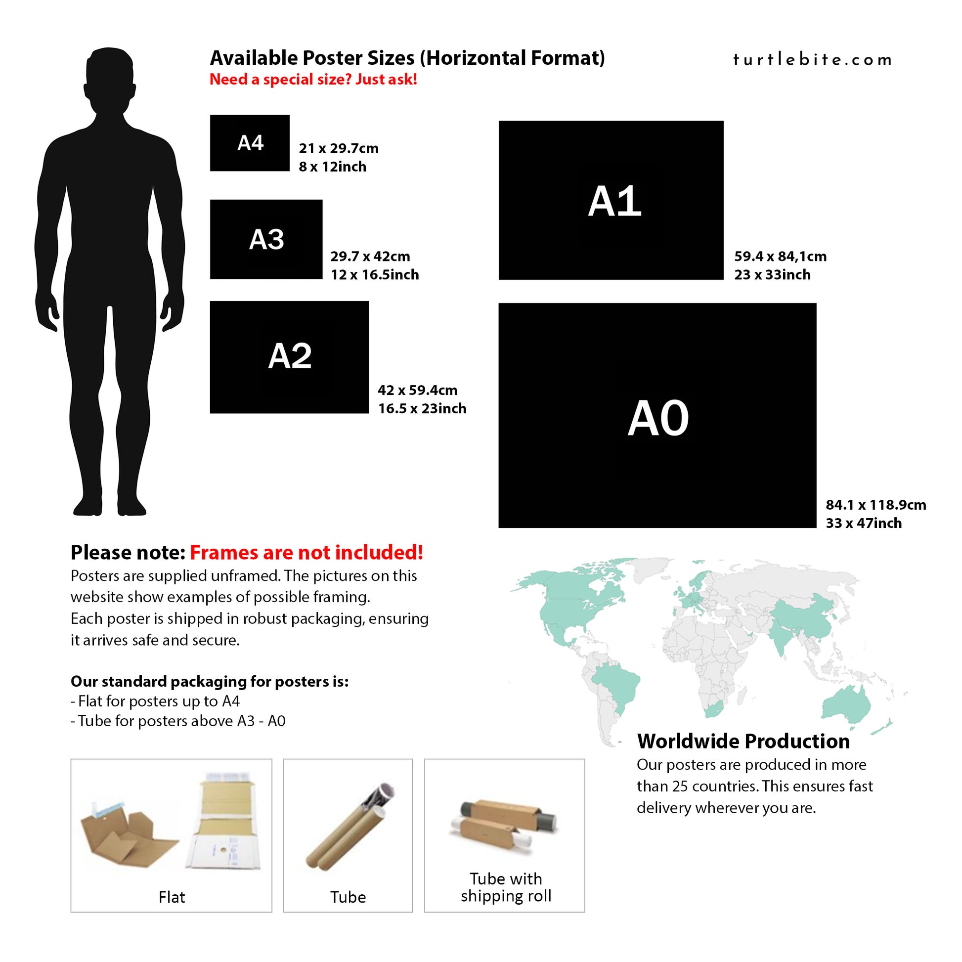 Different packaging depending on the size of the poster as well as the country where the item is produced and shipped to. Larger prints are carefully rolled and shipped in a tube, without framing included. Each of these products is crafted specifically for you upon ordering, so please allow a bit more time for delivery.