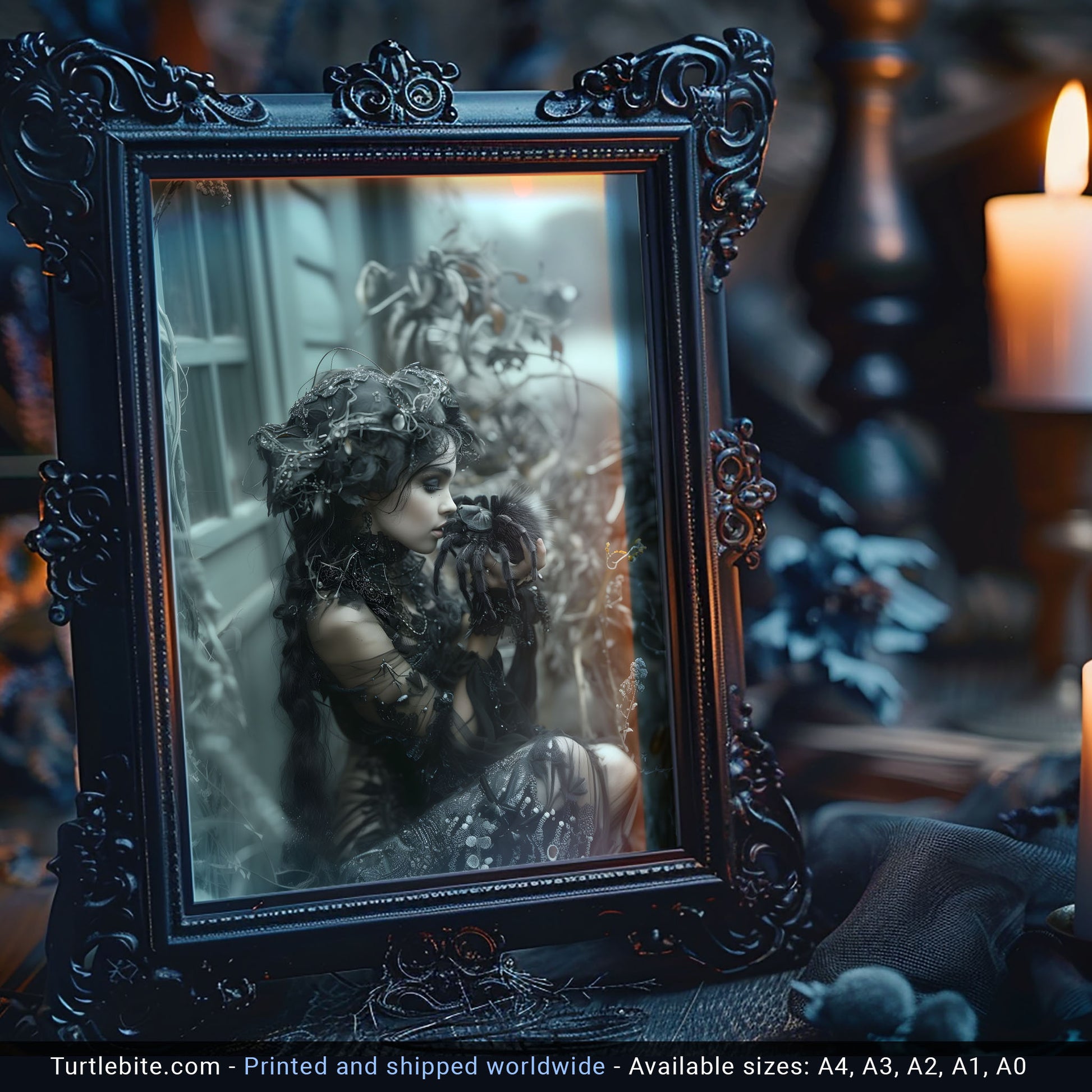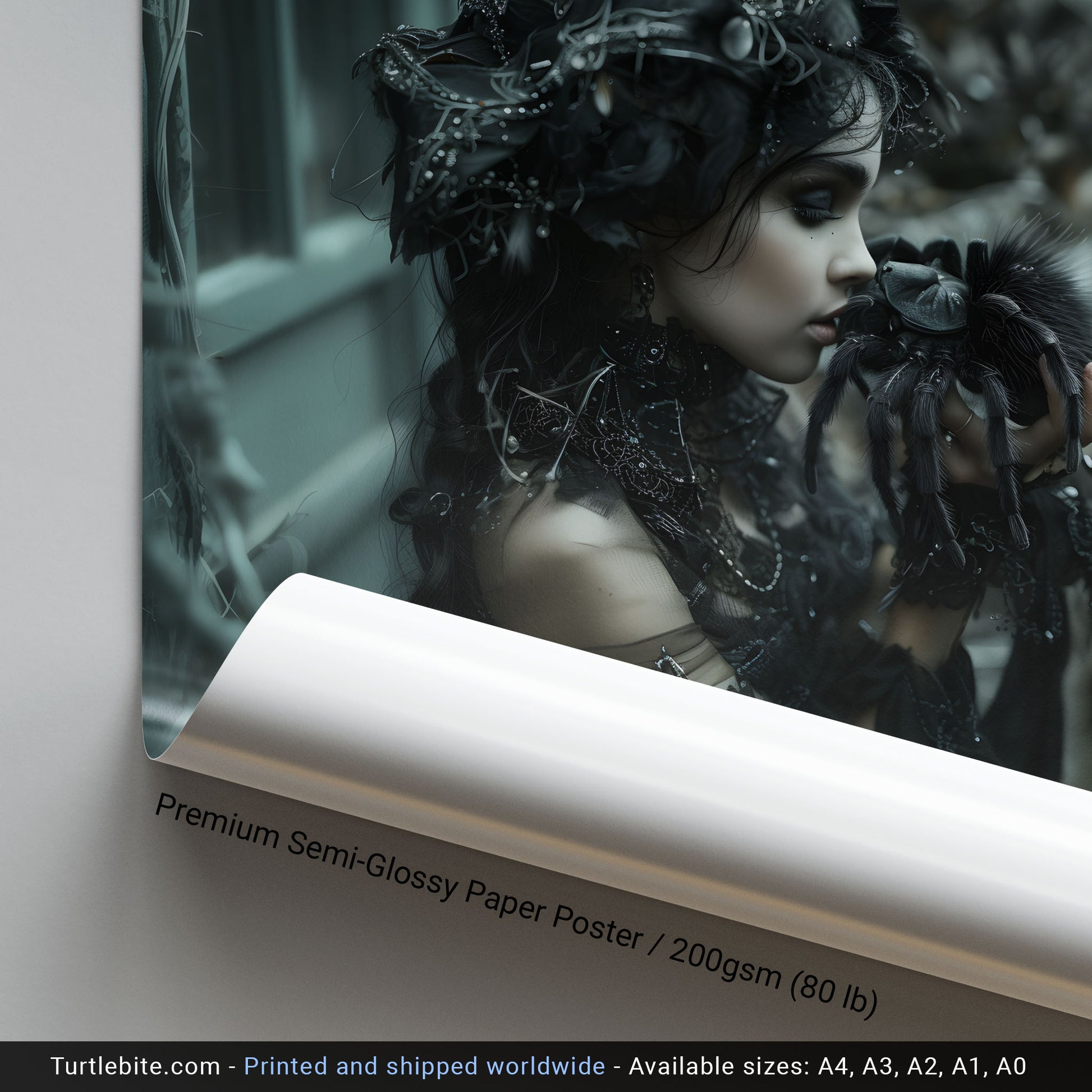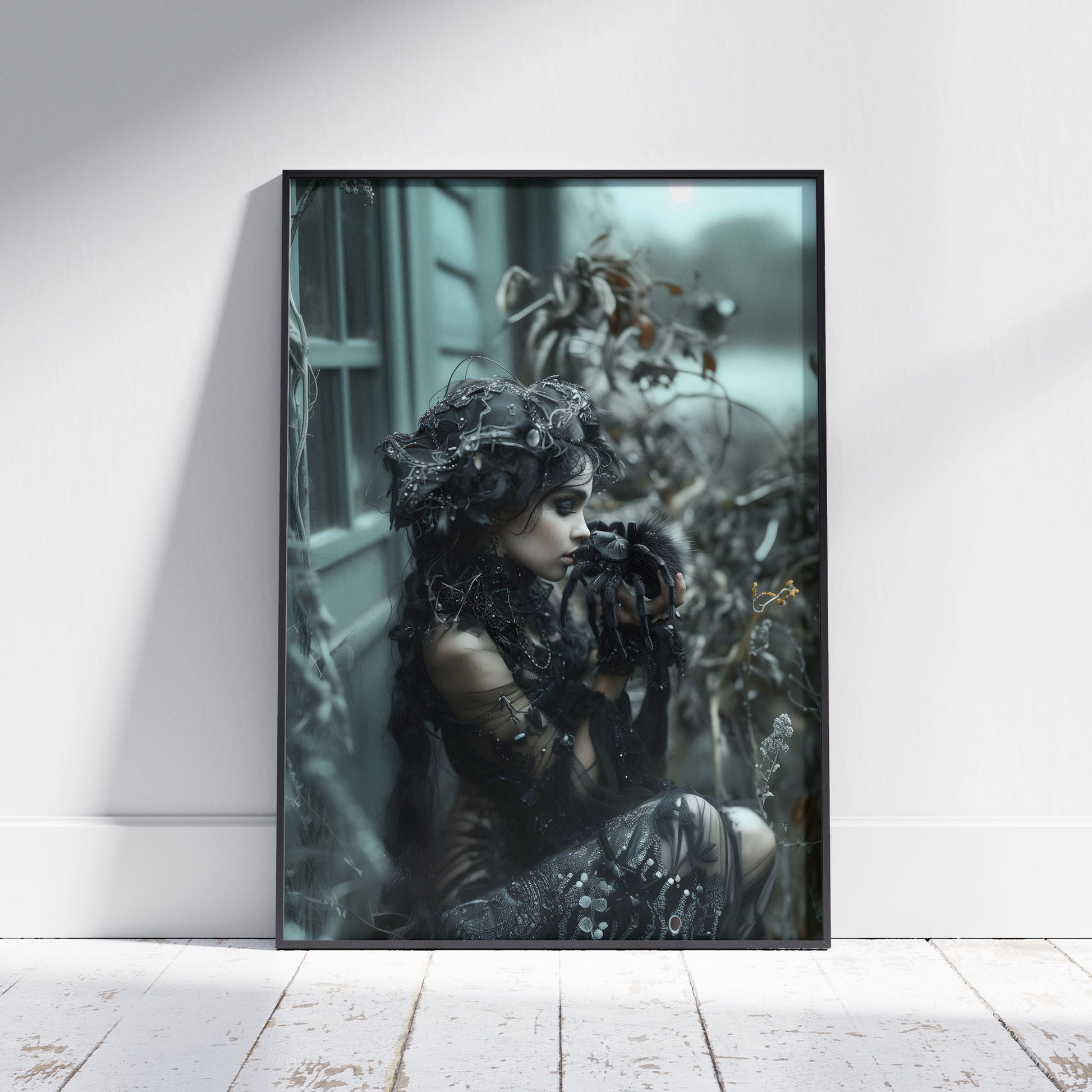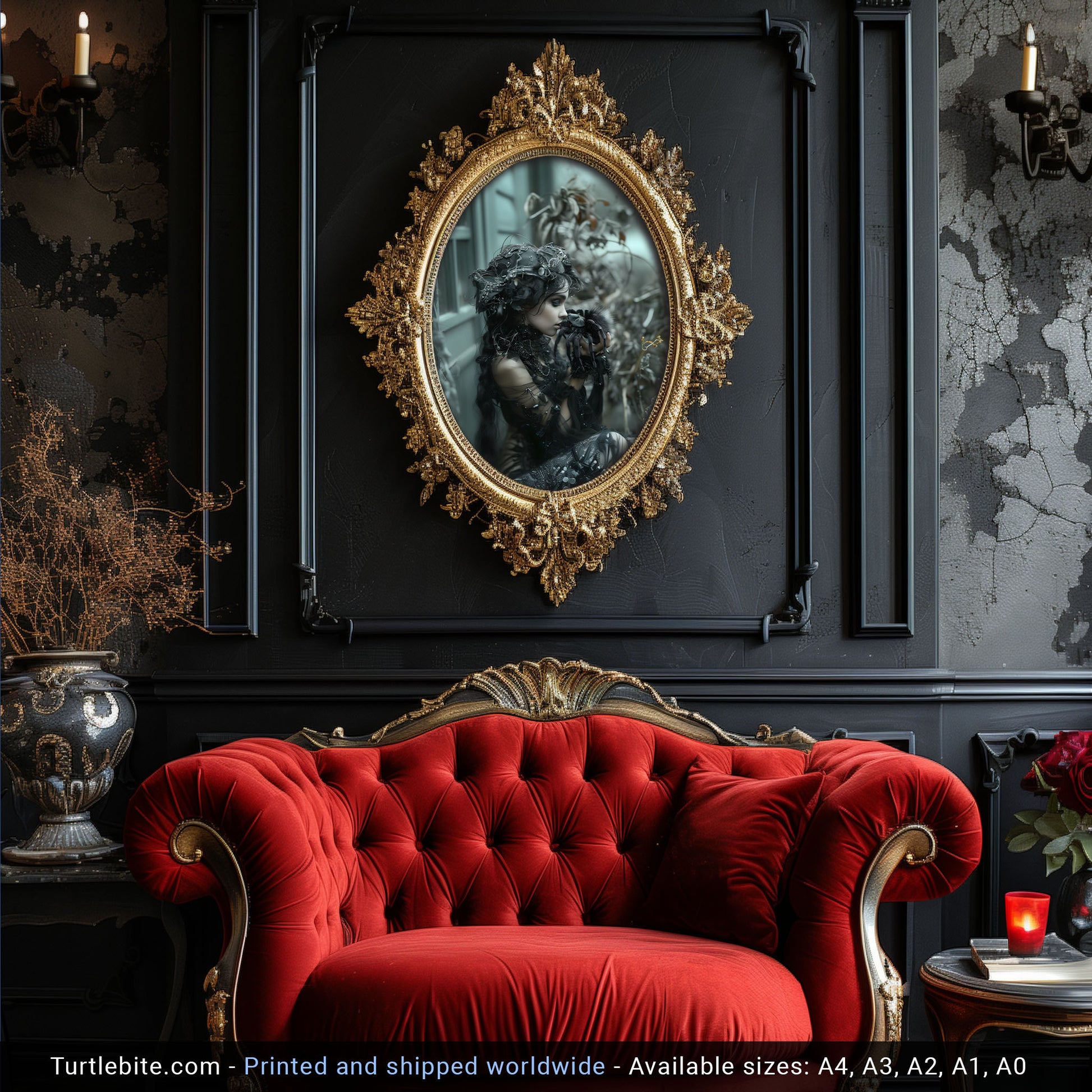 Add a touch of mystery and allure to your space with this dark gothic wall art featuring a beautiful woman captured in the kiss of the spider. This mesmerizing piece will surely intrigue all who behold it, making it the perfect addition to any room seeking a hint of edgy elegance. Bring a sense of dark allure to your decor with this unique and captivating artwork.