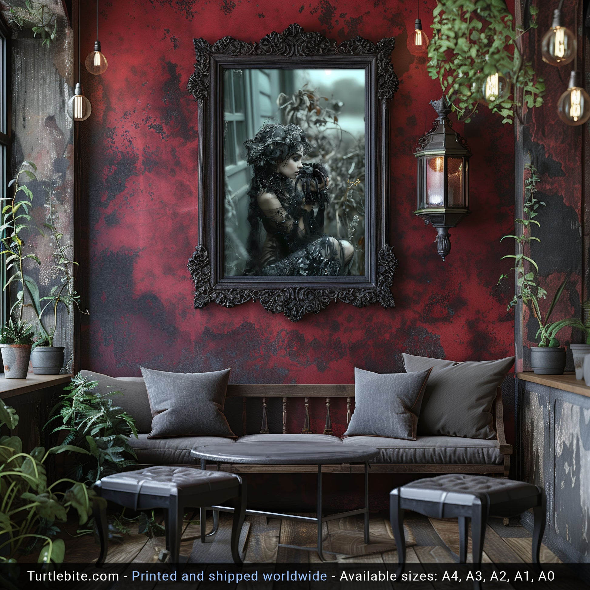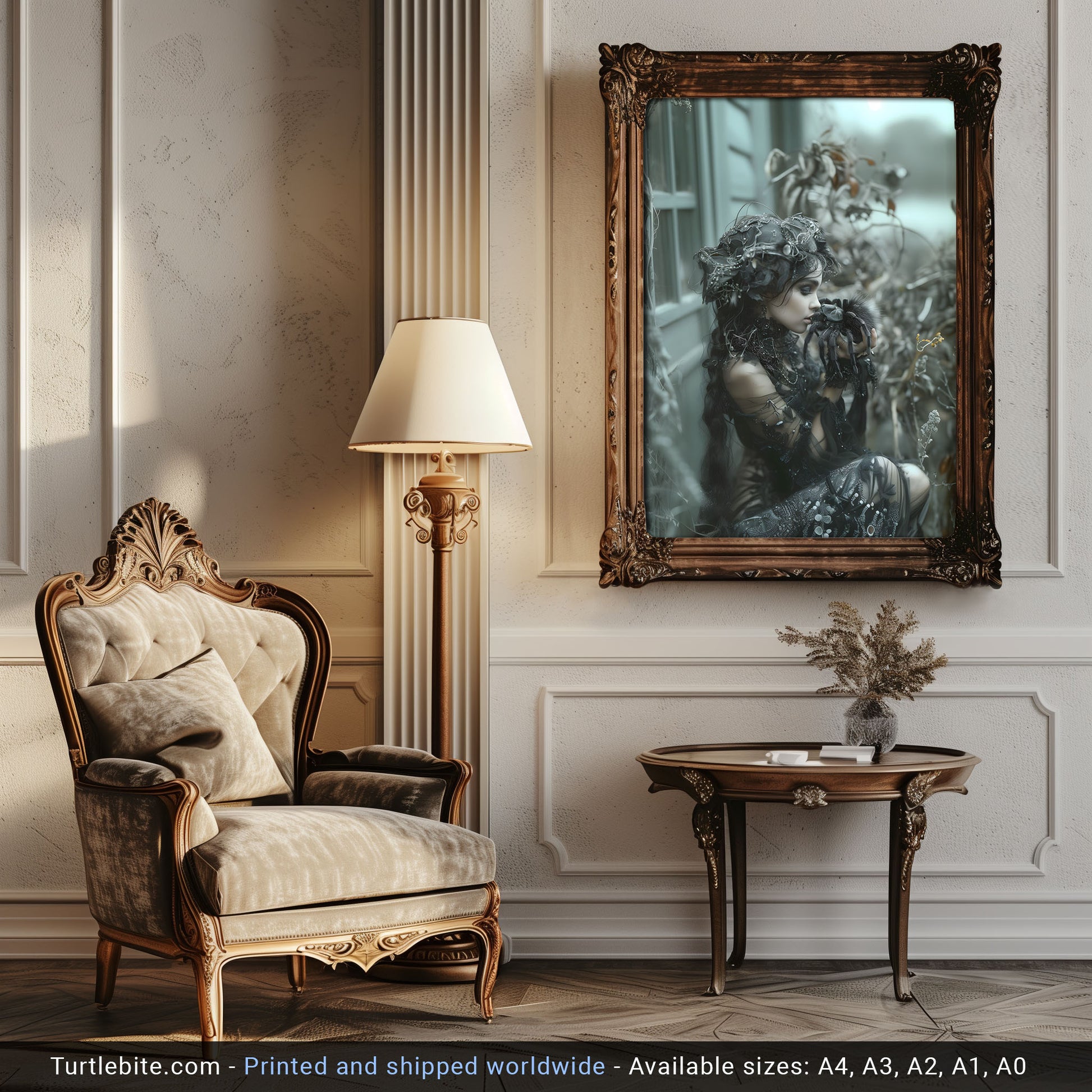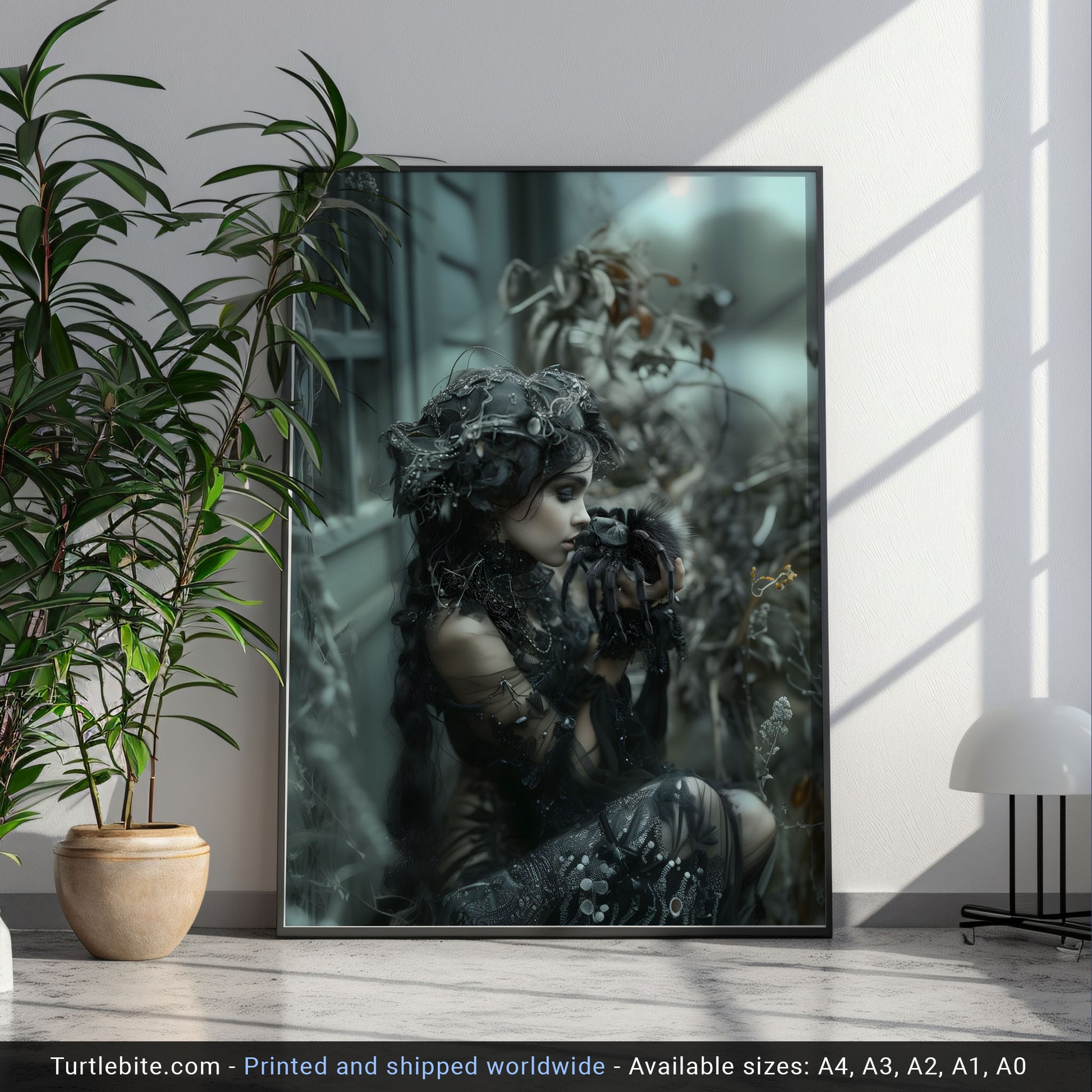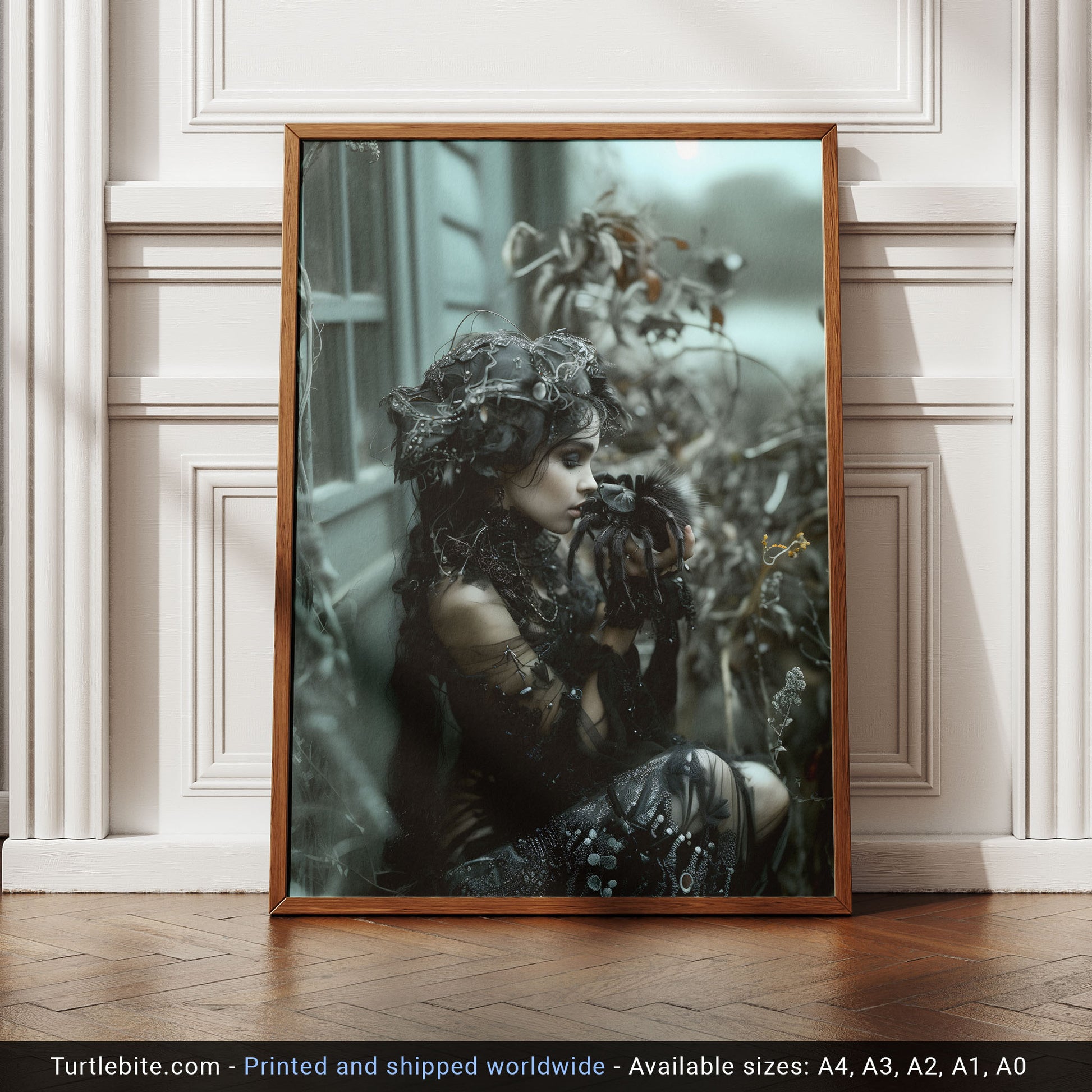 Add a touch of mystery and allure to your space with this dark gothic wall art featuring a beautiful woman captured in the kiss of the spider. This mesmerizing piece will surely intrigue all who behold it, making it the perfect addition to any room seeking a hint of edgy elegance. Bring a sense of dark allure to your decor with this unique and captivating artwork.