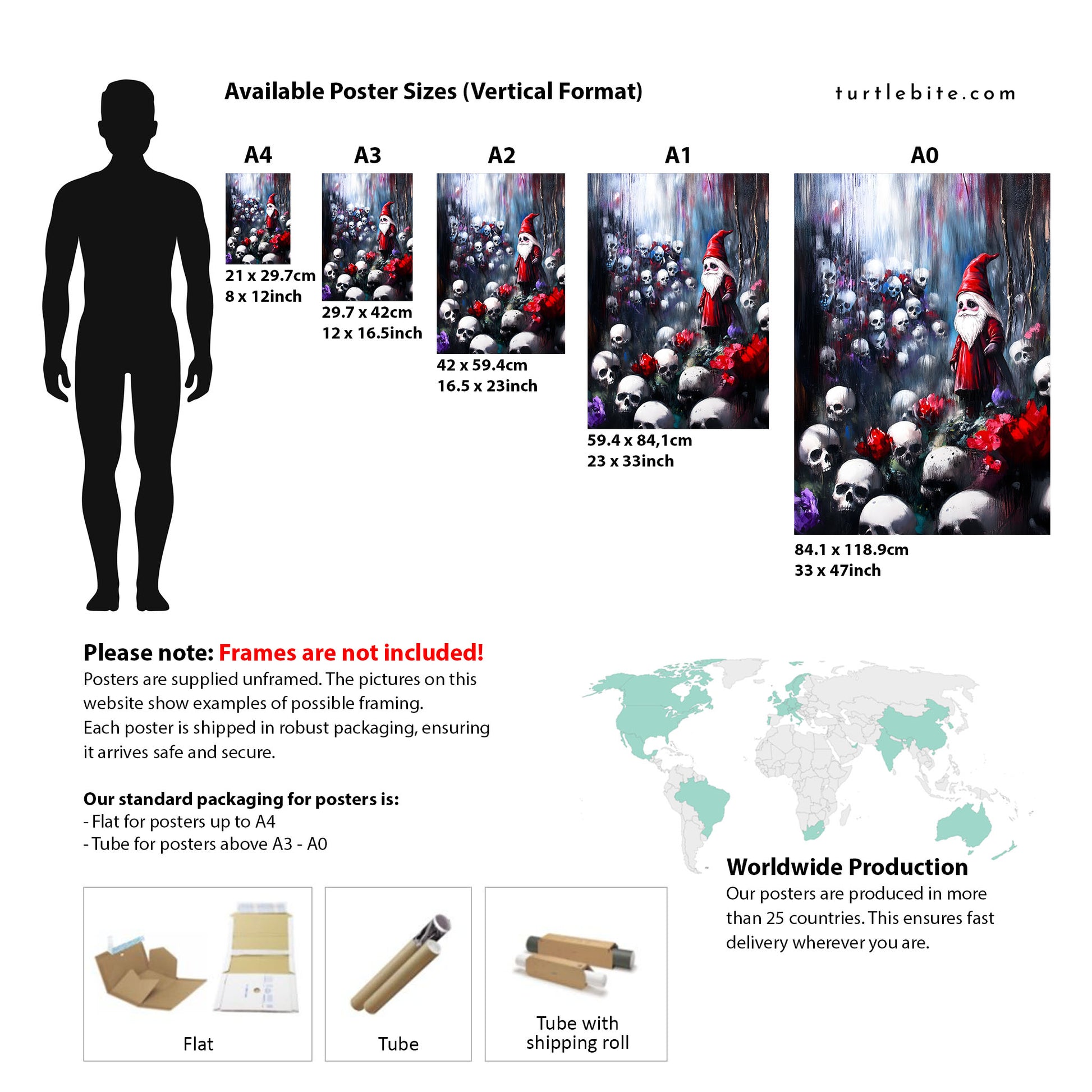 Different packaging depending on the size of the poster as well as the country where the item is produced and shipped to. Larger prints are carefully rolled and shipped in a tube, without framing included. Each of these products is crafted specifically for you upon ordering, so please allow a bit more time for delivery.