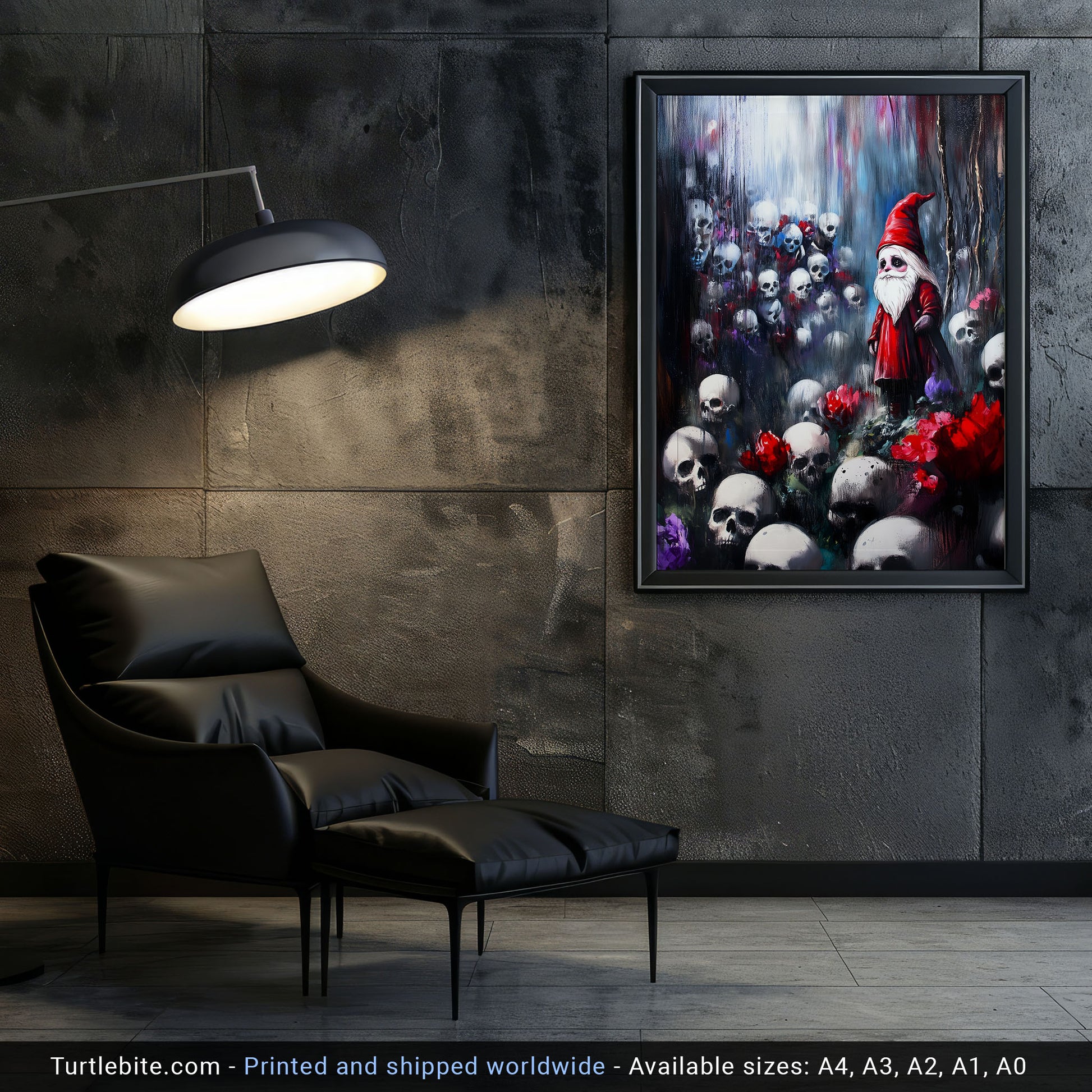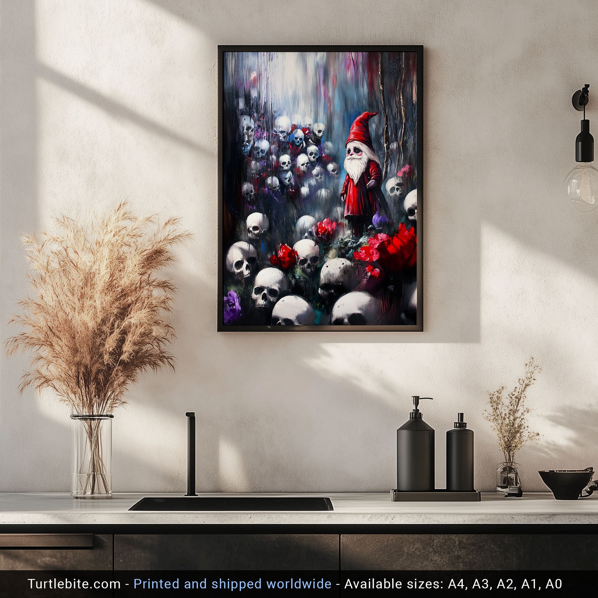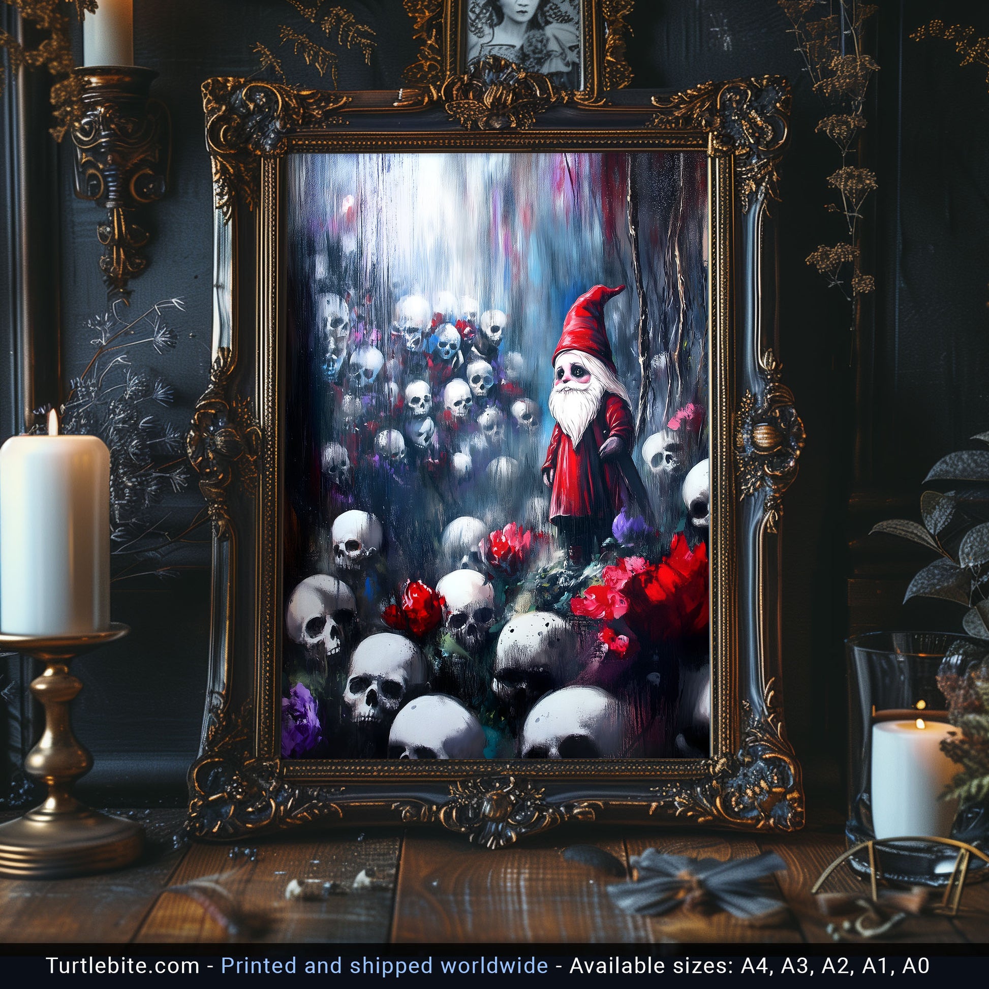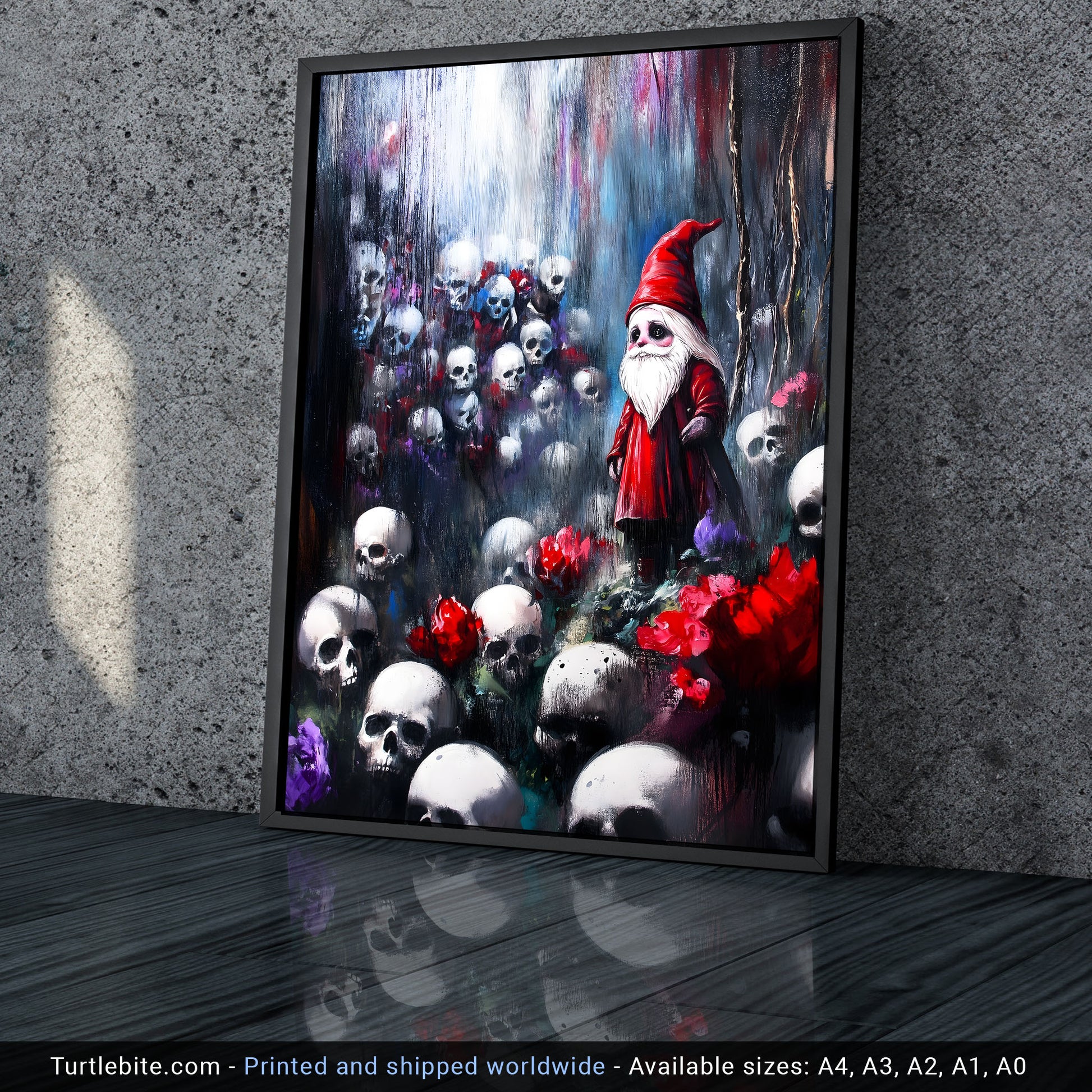 Step into a hauntingly beautiful realm with this captivating art print featuring a solitary red-capped gnome amidst a somber forest of skulls. With a melancholic expression, the gnome stands surrounded by stark white skulls and vibrant, contrasting red and purple flowers, creating a powerful "creepy cute" or "whimsigoth" aesthetic.