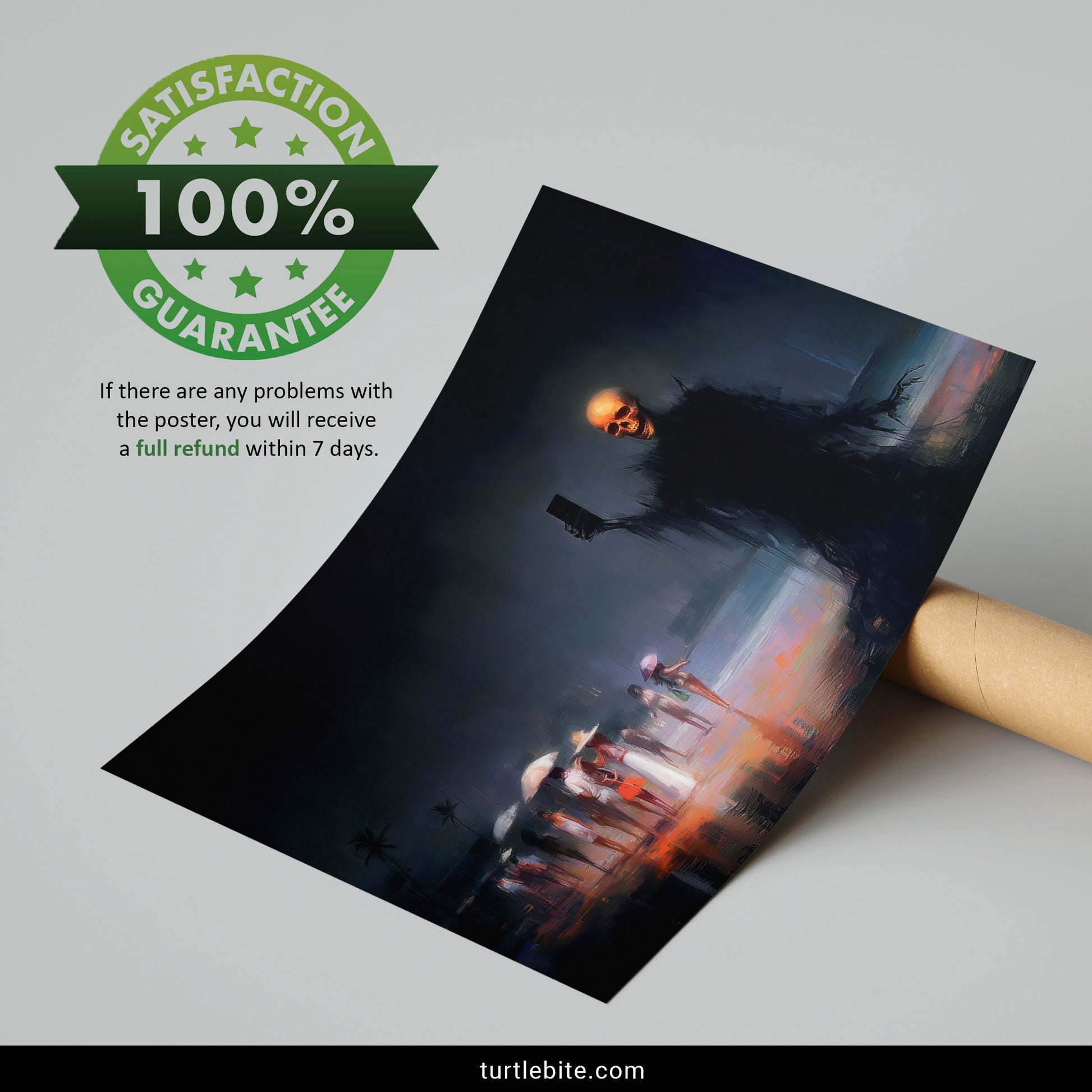 This memento mori poster captures the ultimate irony: a glowing skeleton snapping a beach selfie while sunburned tourists bask in blissful ignorance behind him. It's the kind of dark humor that makes you laugh and then immediately question your own beach vacation plans.