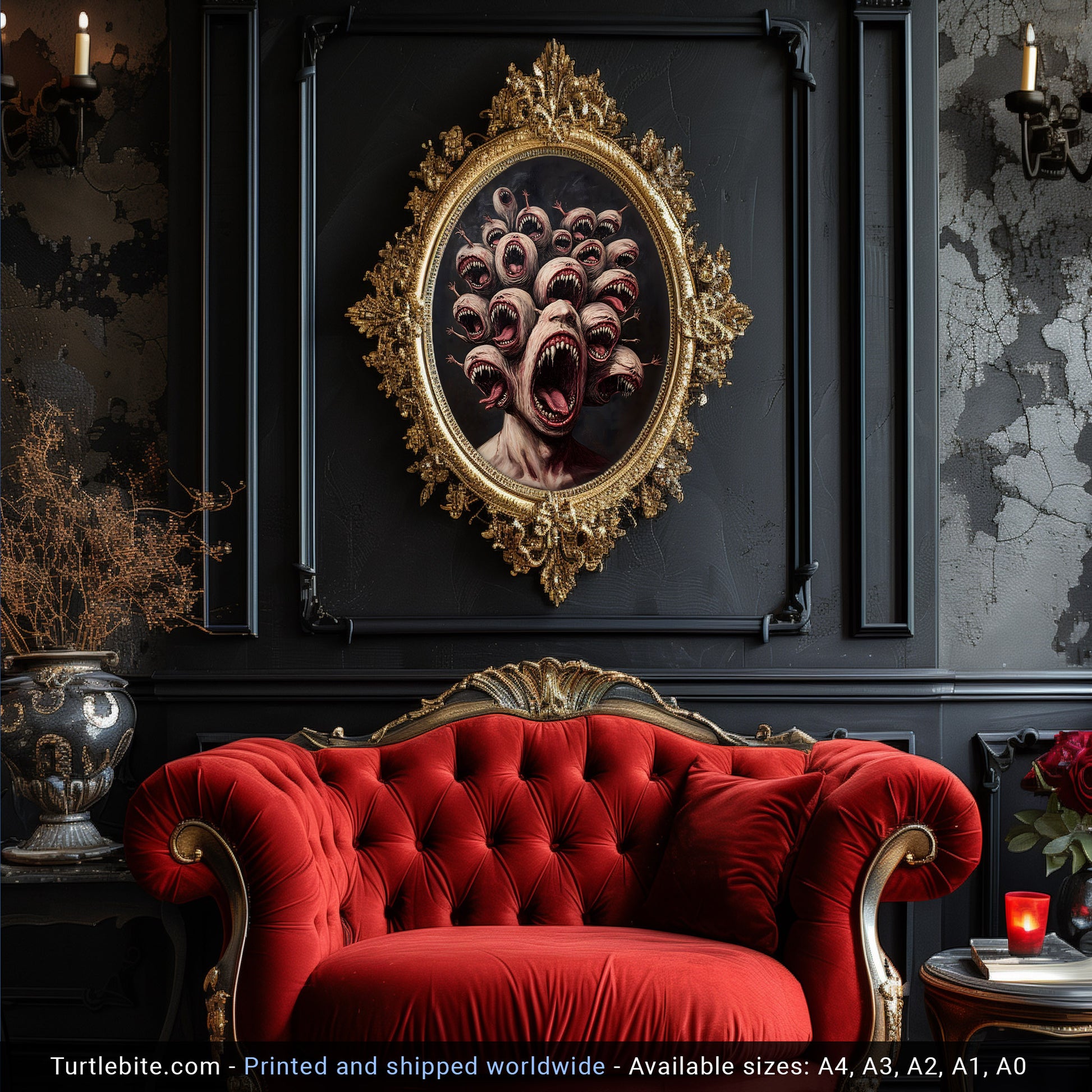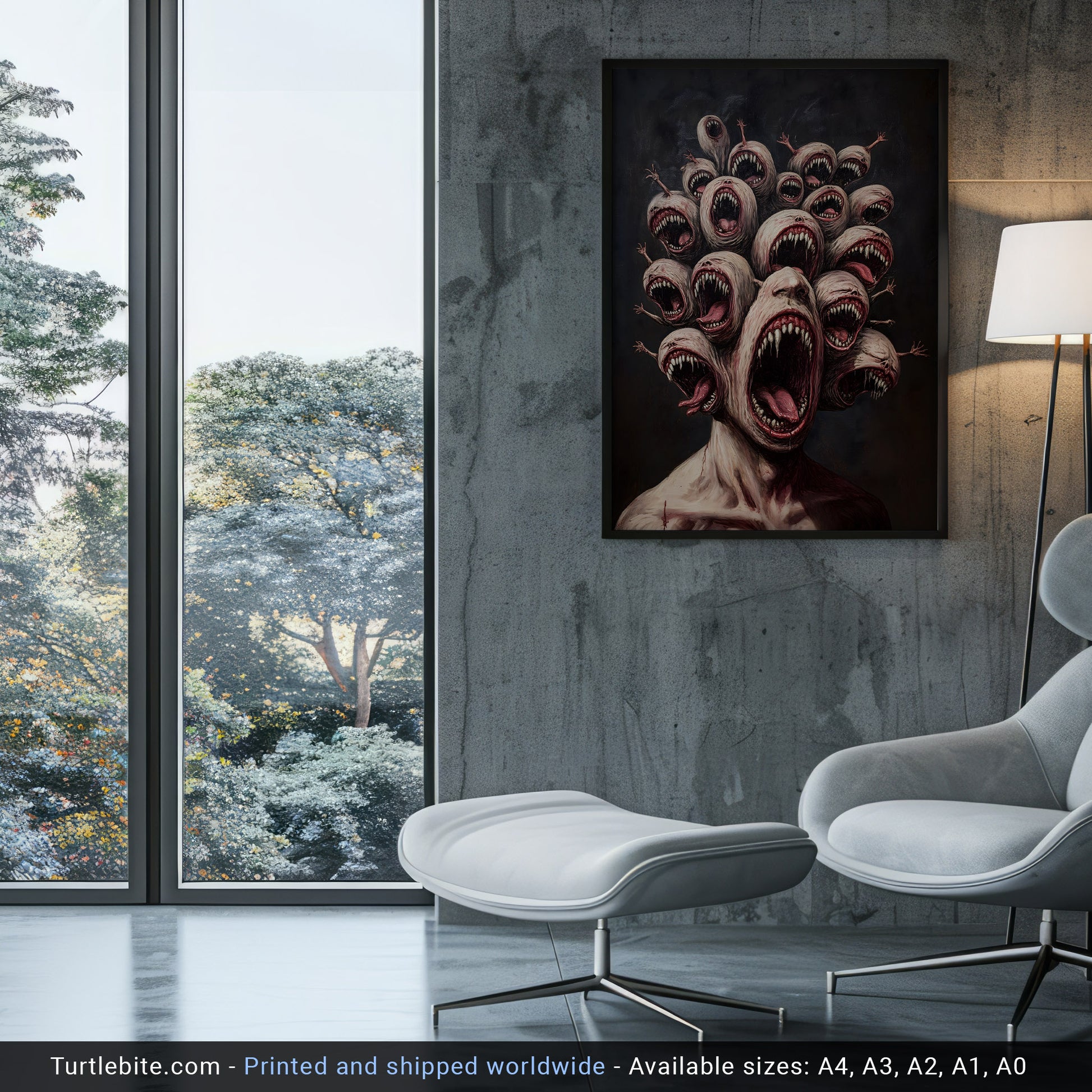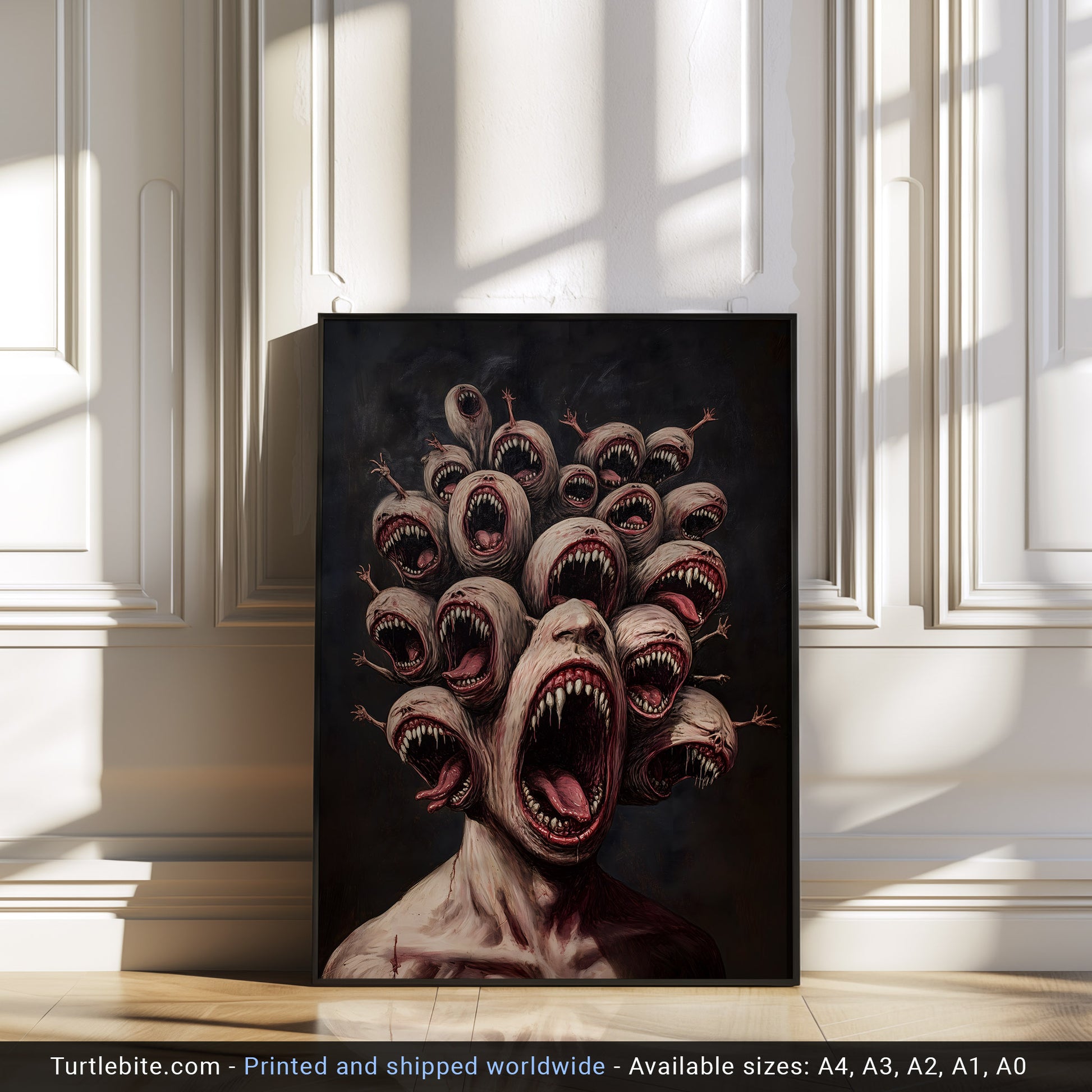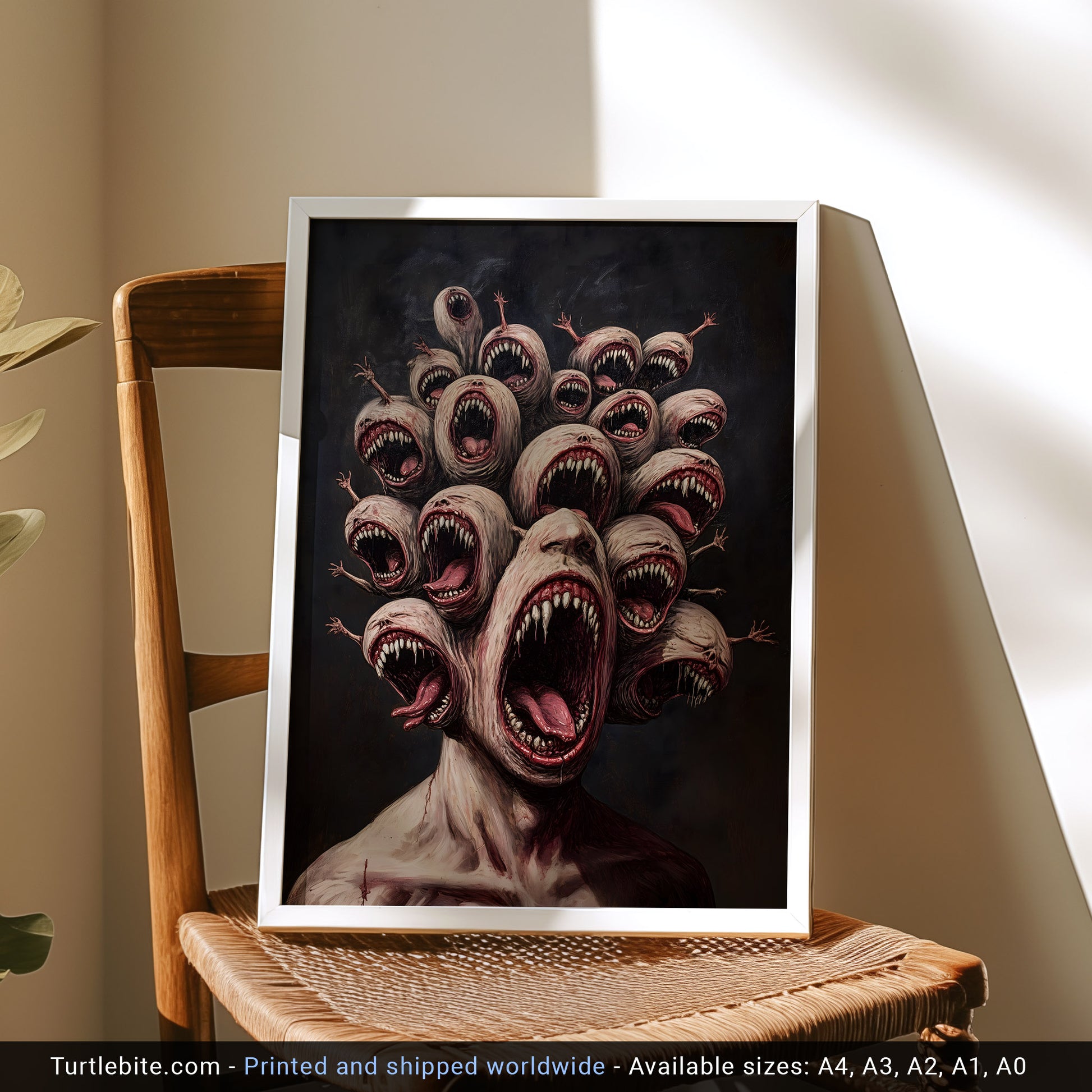 Bring home a piece of the dark and mysterious with this moody multi-headed monster painting print. Perfect for lovers of creepy, surreal art, this fantasy-inspired poster makes a unique and gory addition to any space. Ideal as a witchy gift or for those who appreciate the strange and unusual. Add some edge to your walls with this haunting masterpiece.