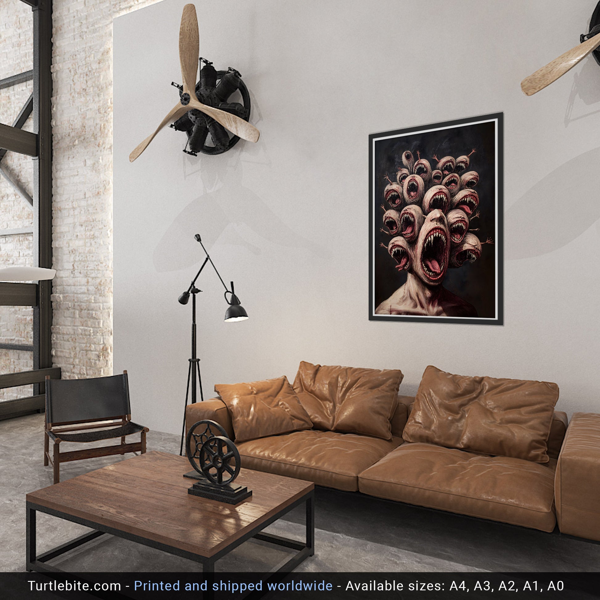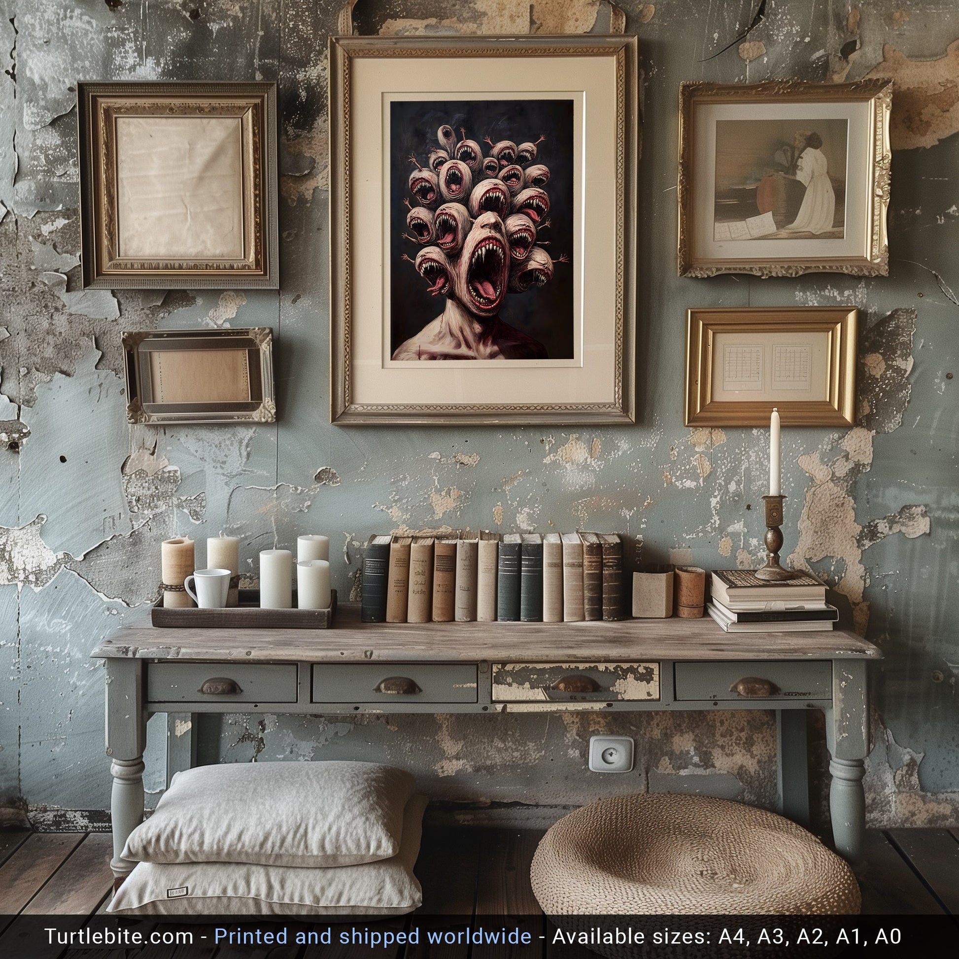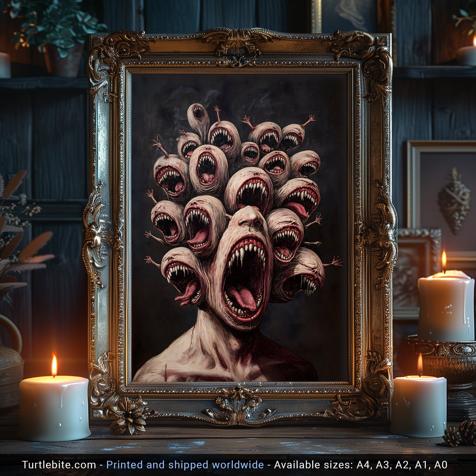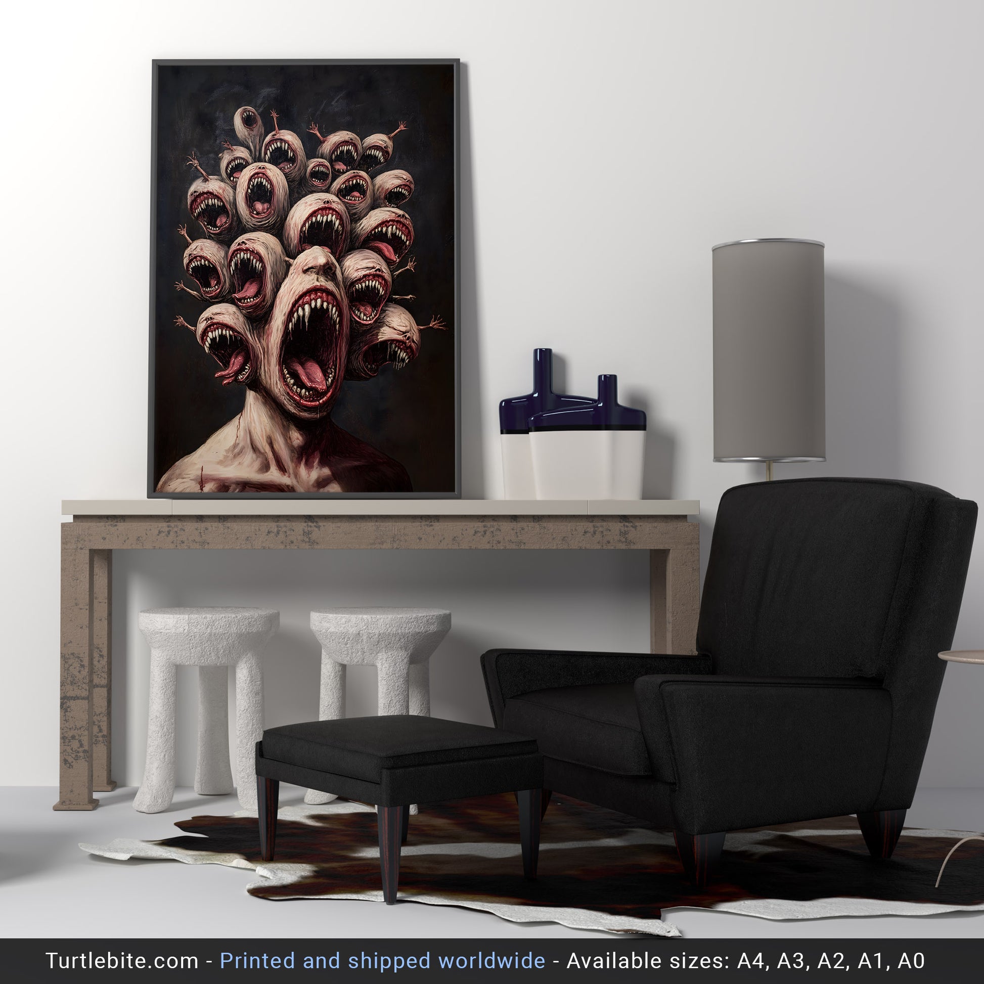 Bring home a piece of the dark and mysterious with this moody multi-headed monster painting print. Perfect for lovers of creepy, surreal art, this fantasy-inspired poster makes a unique and gory addition to any space. Ideal as a witchy gift or for those who appreciate the strange and unusual. Add some edge to your walls with this haunting masterpiece.