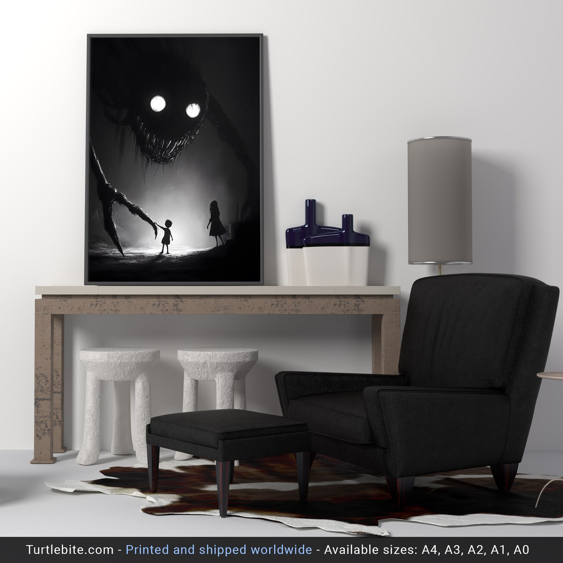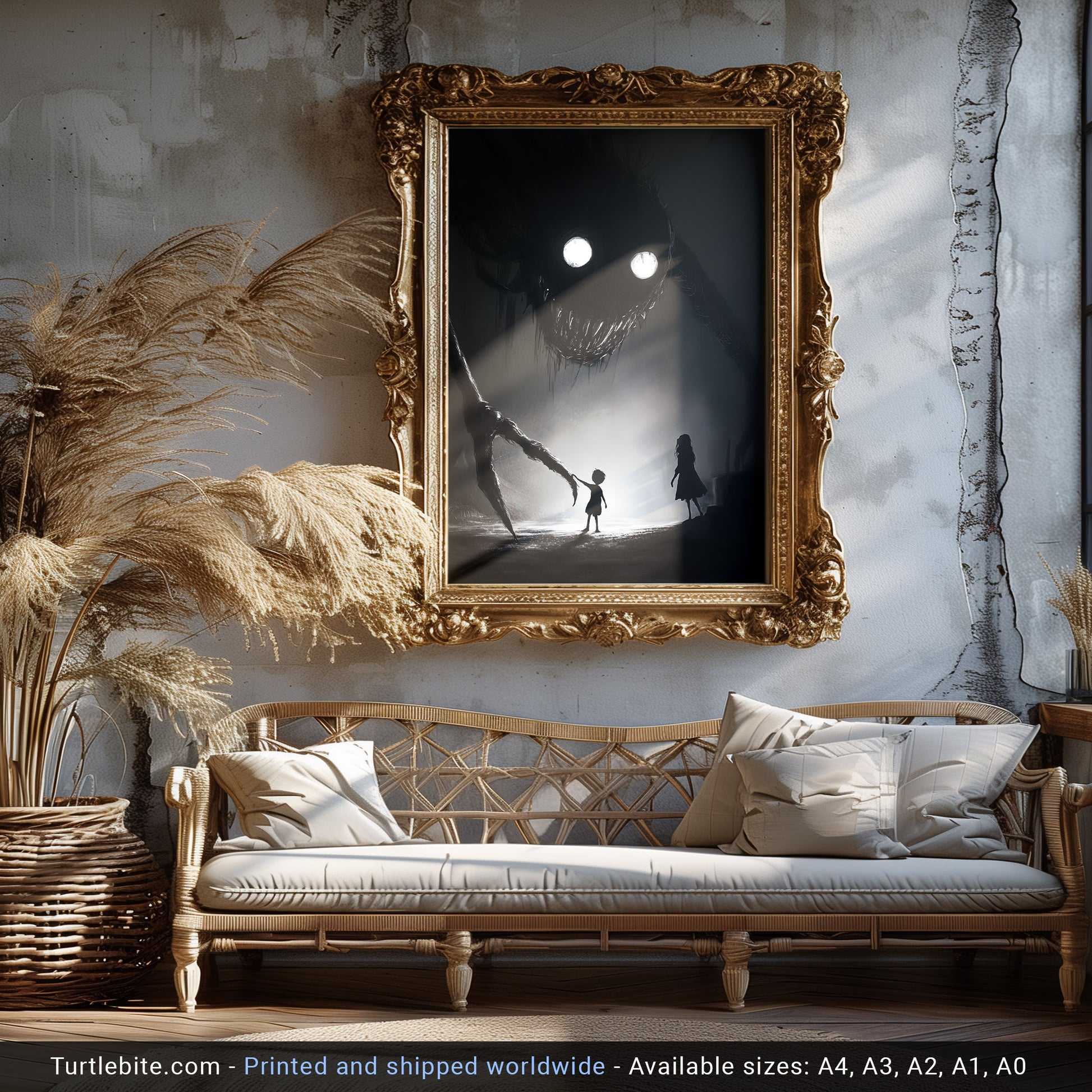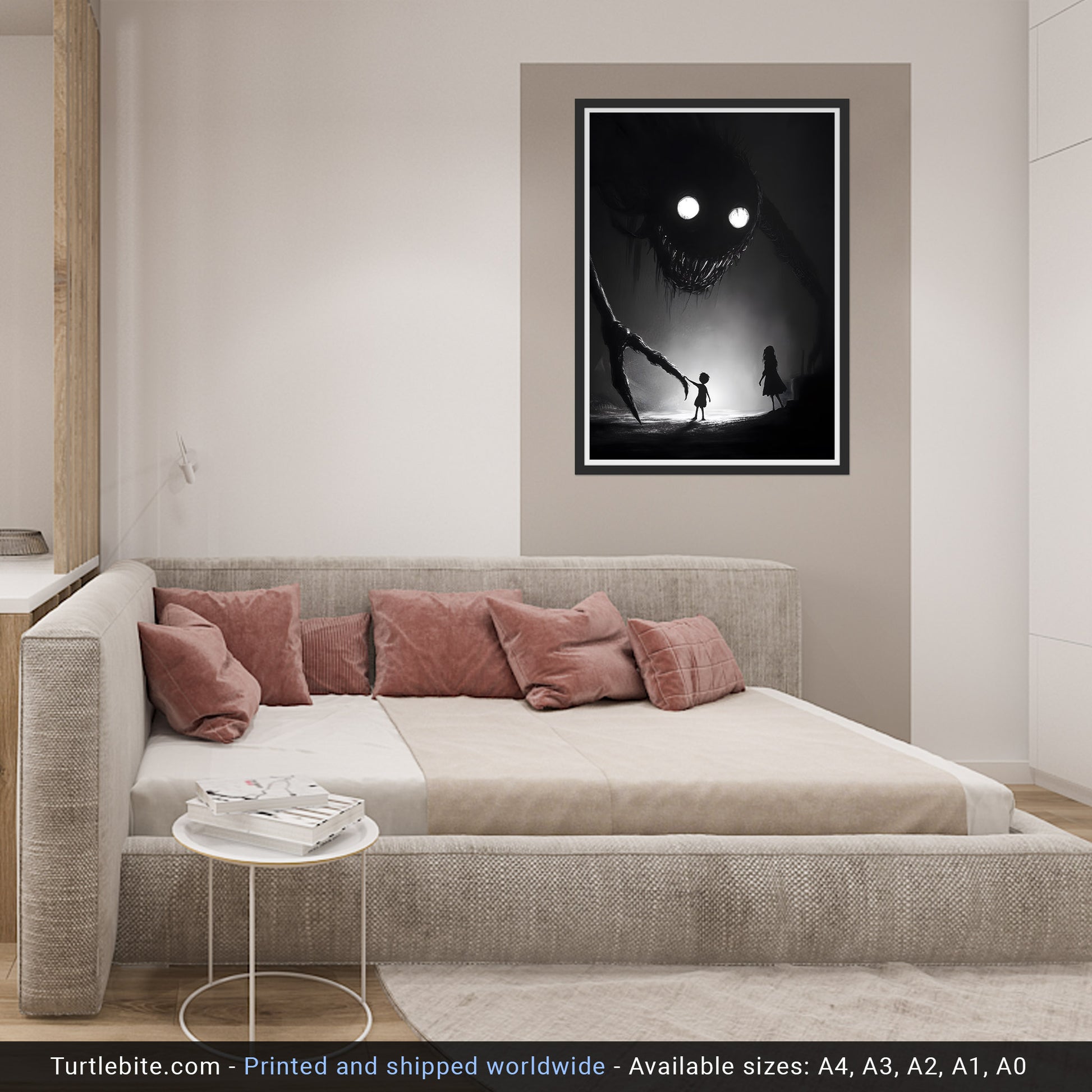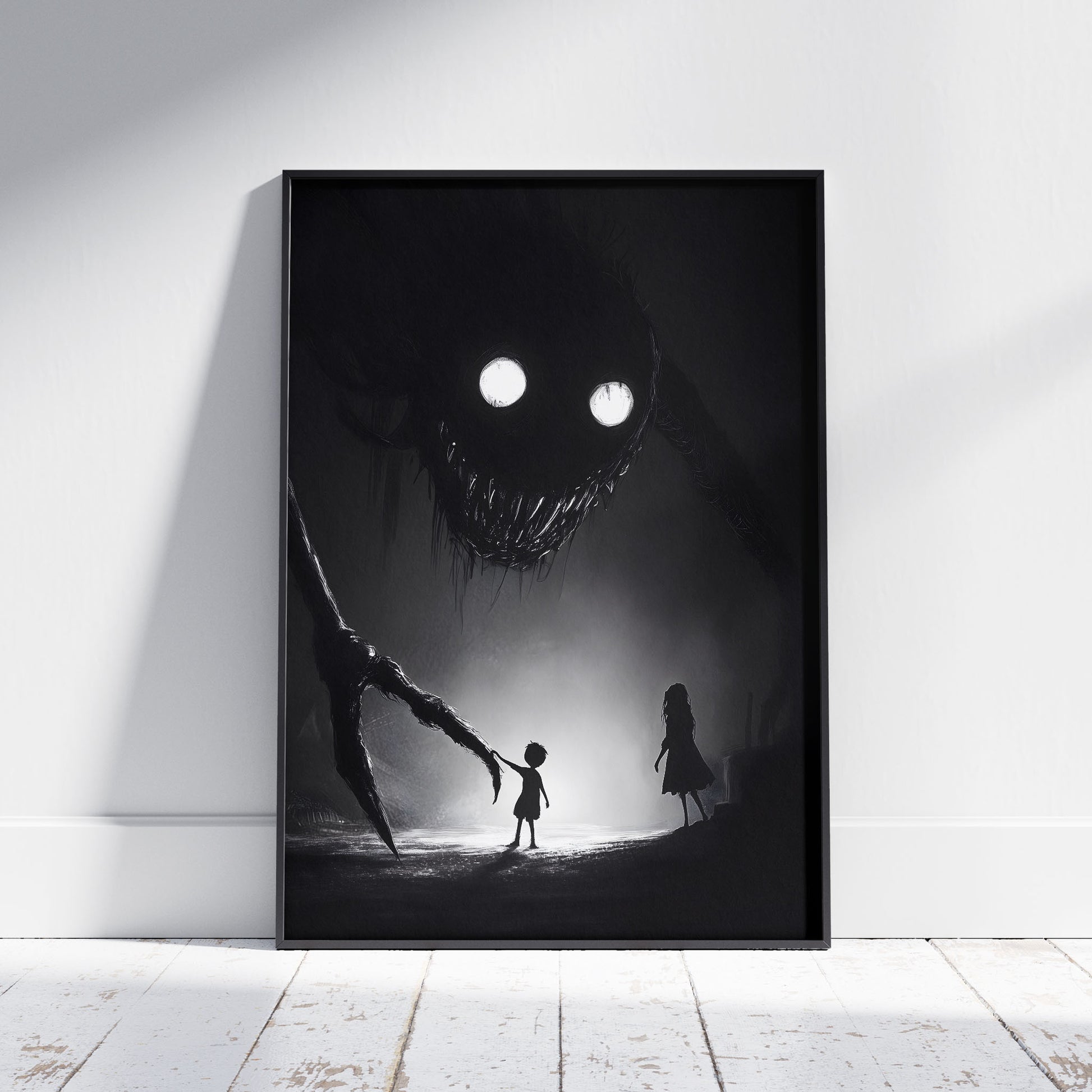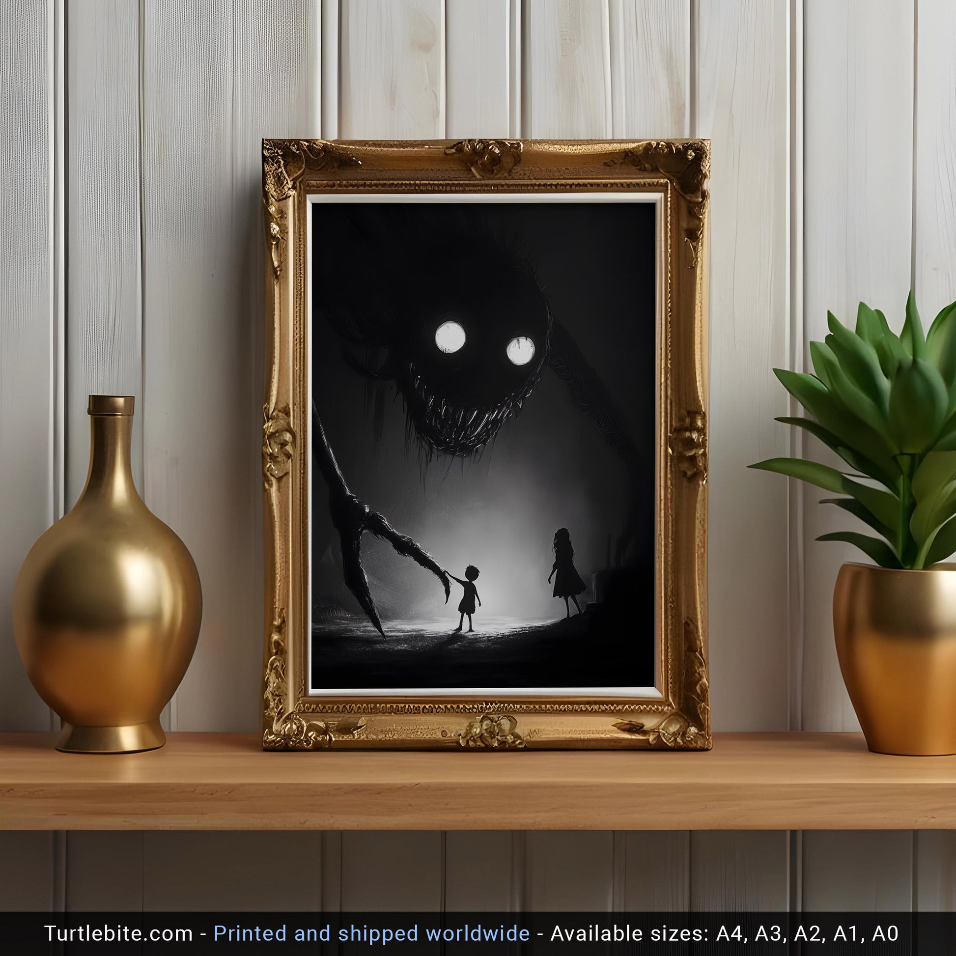 Transform your space with this captivating mysterious kids playing with monster illustration poster. Perfect for lovers of the whimsical and eerie, this nightmare extra large wall art adds a touch of magic and adventure to any room. Ideal for bedrooms, playrooms, or creative spaces, this witchy frightening print sparks imagination and storytelling. Whether it's for Halloween or year-round charm, this unique piece will leave a lasting impression. Embrace the enchantment today!