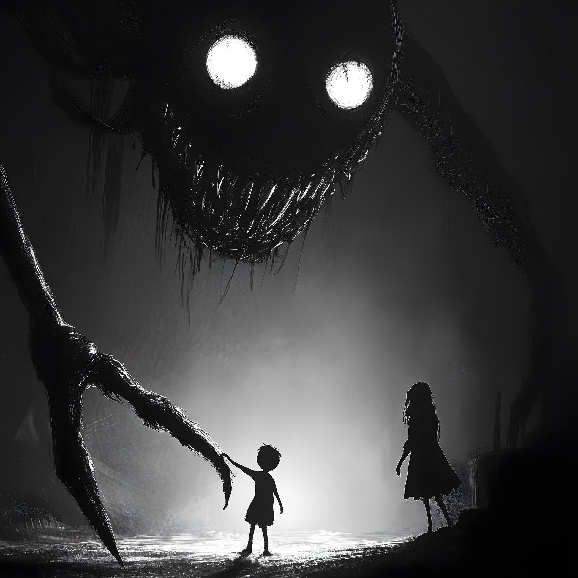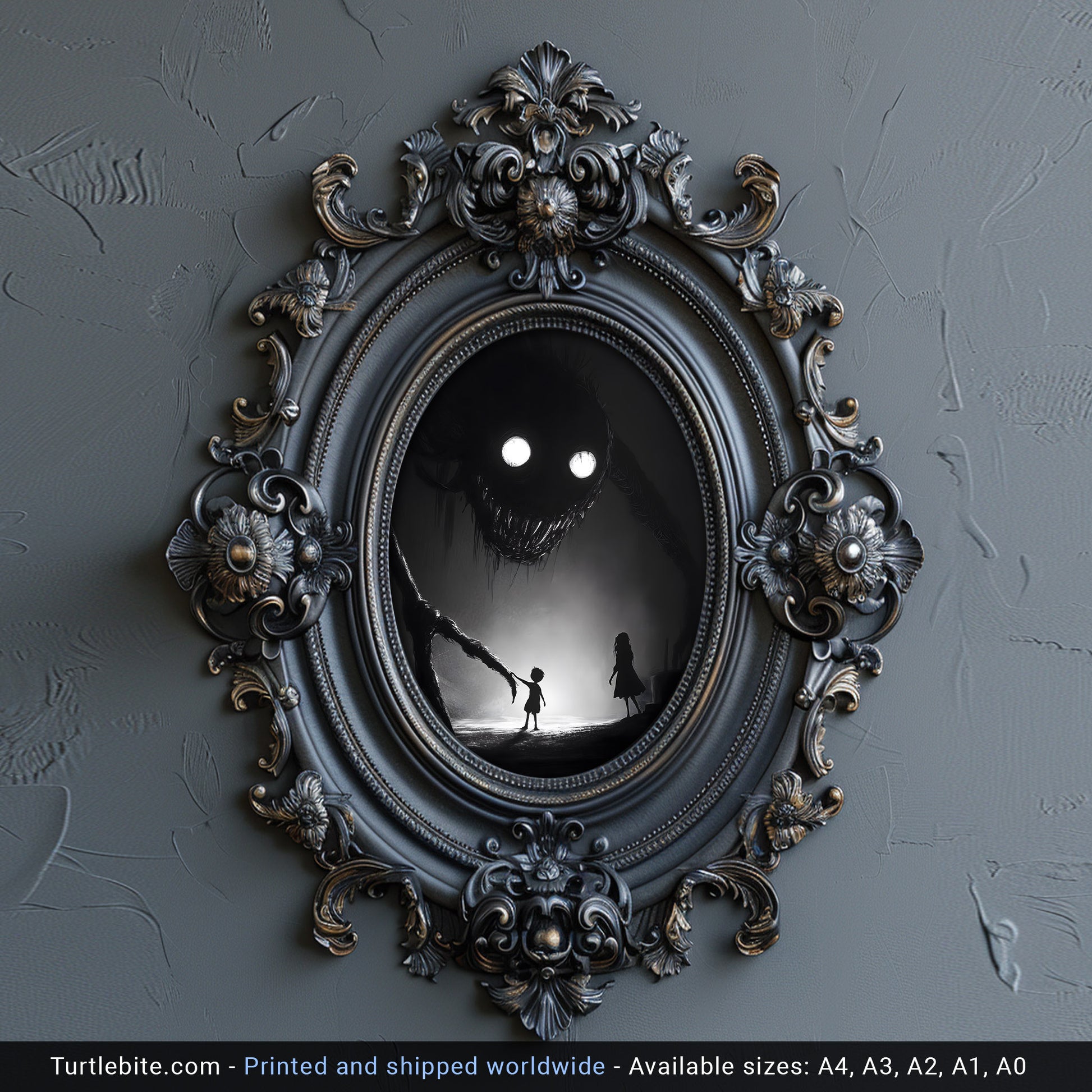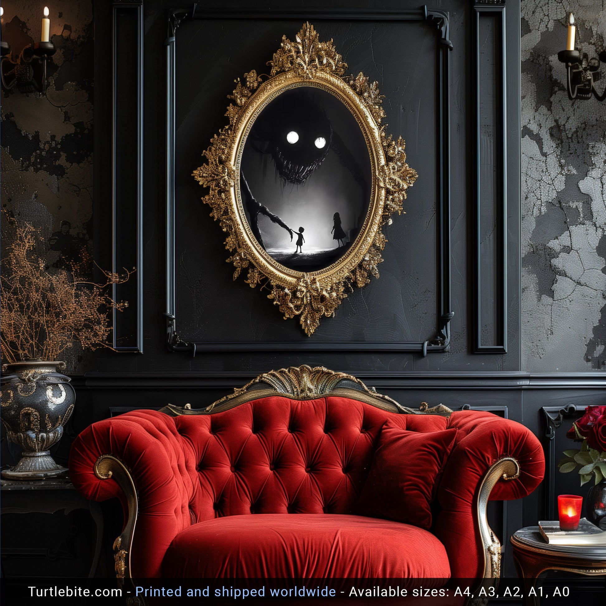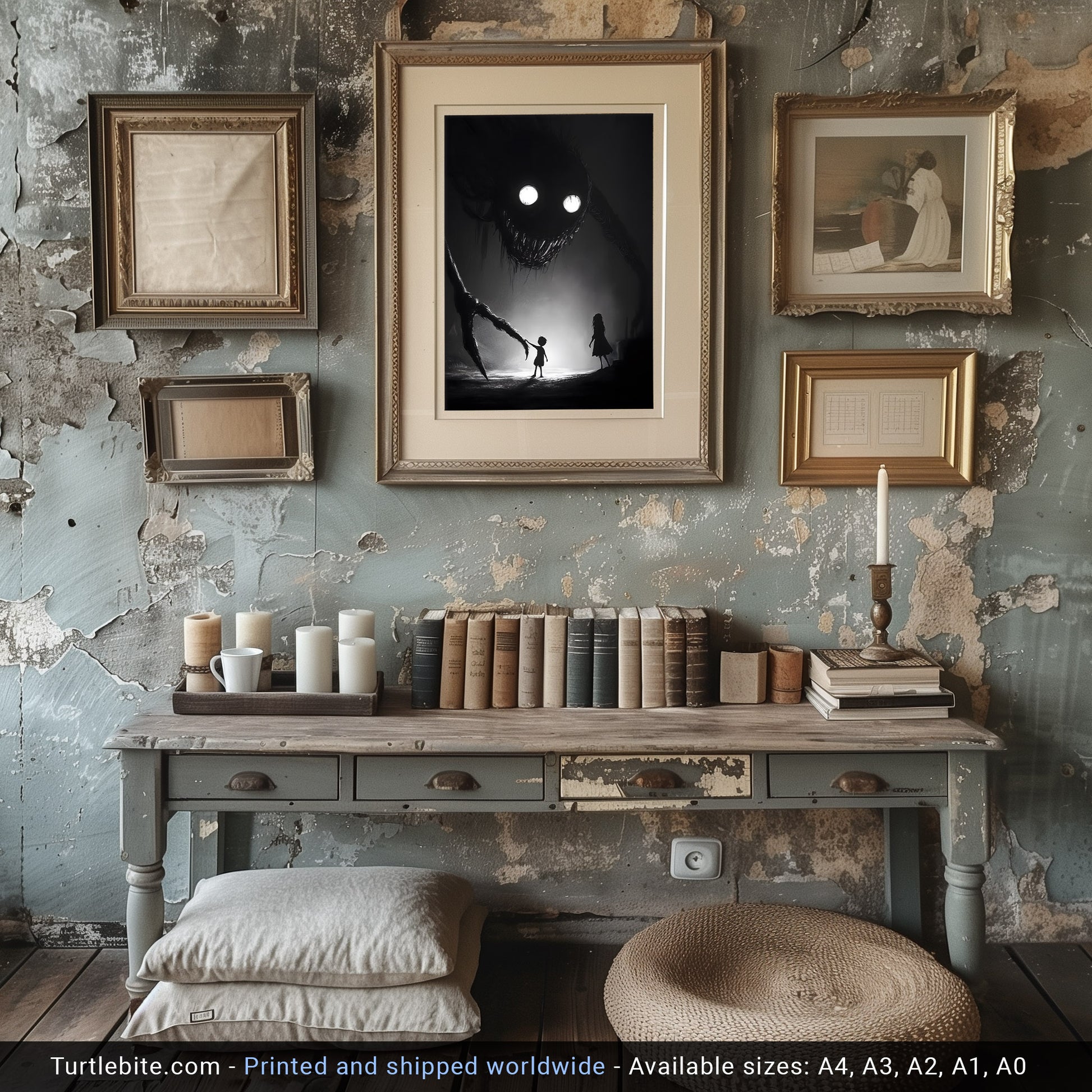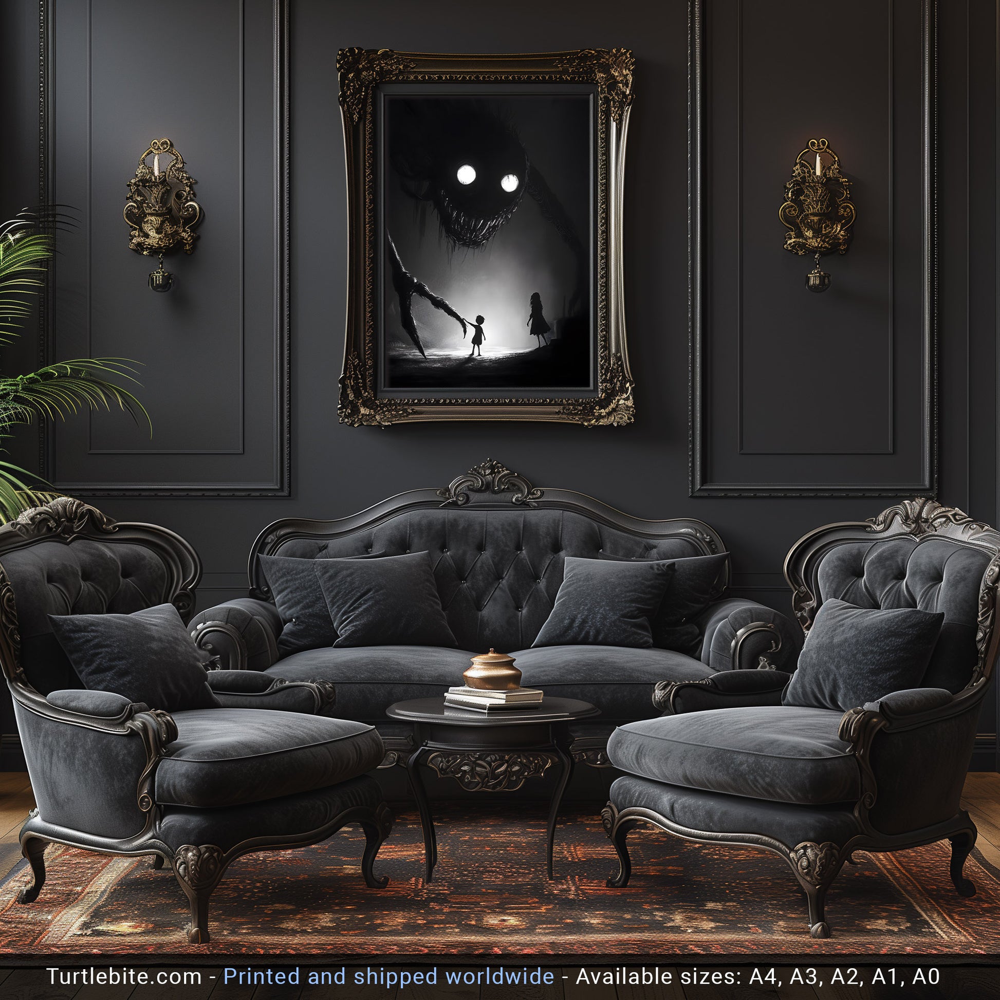 Transform your space with this captivating mysterious kids playing with monster illustration poster. Perfect for lovers of the whimsical and eerie, this nightmare extra large wall art adds a touch of magic and adventure to any room. Ideal for bedrooms, playrooms, or creative spaces, this witchy frightening print sparks imagination and storytelling. Whether it's for Halloween or year-round charm, this unique piece will leave a lasting impression. Embrace the enchantment today!