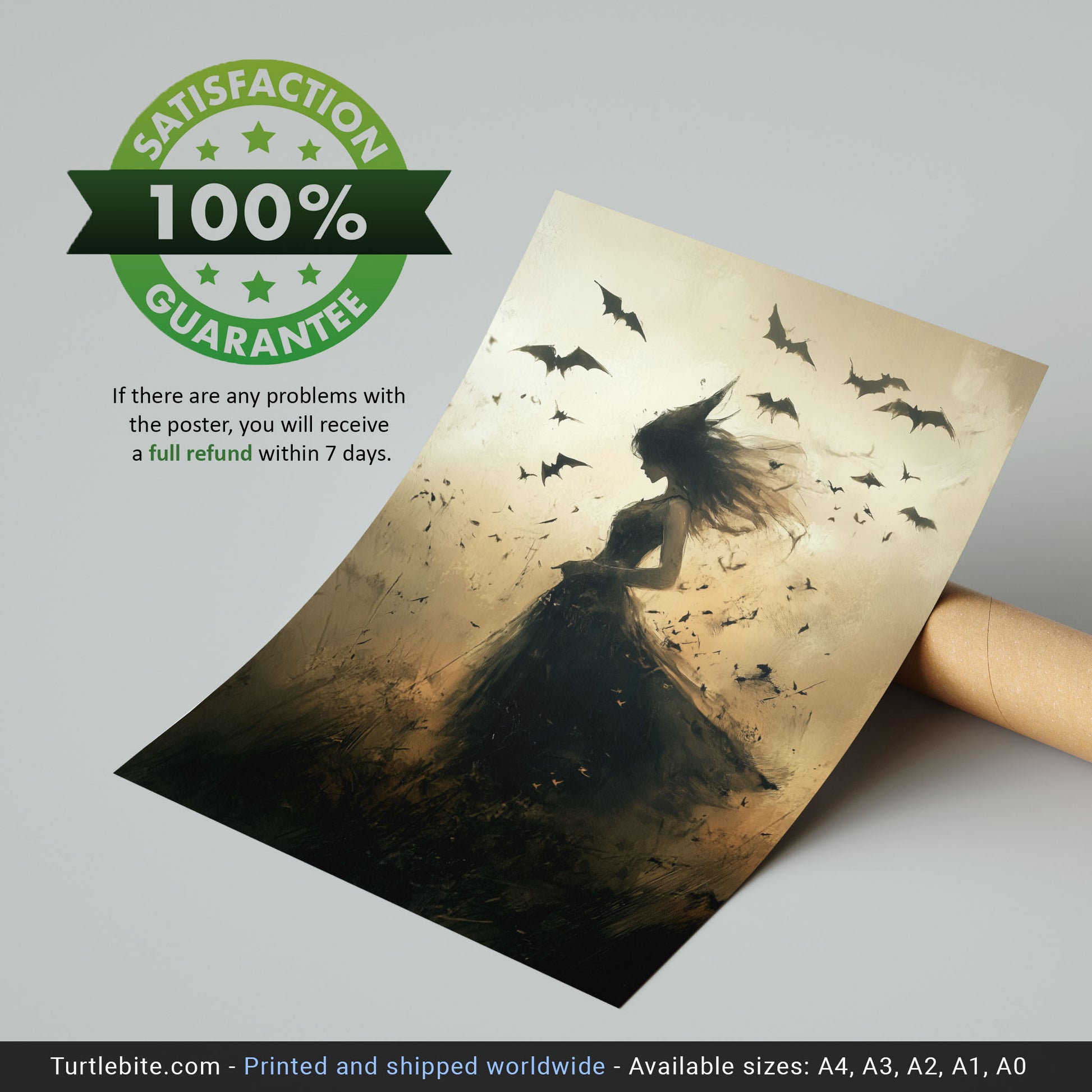 Transform your space with this hauntingly beautiful poster print featuring a mystical young witch surrounded by a swirling flock of bats.