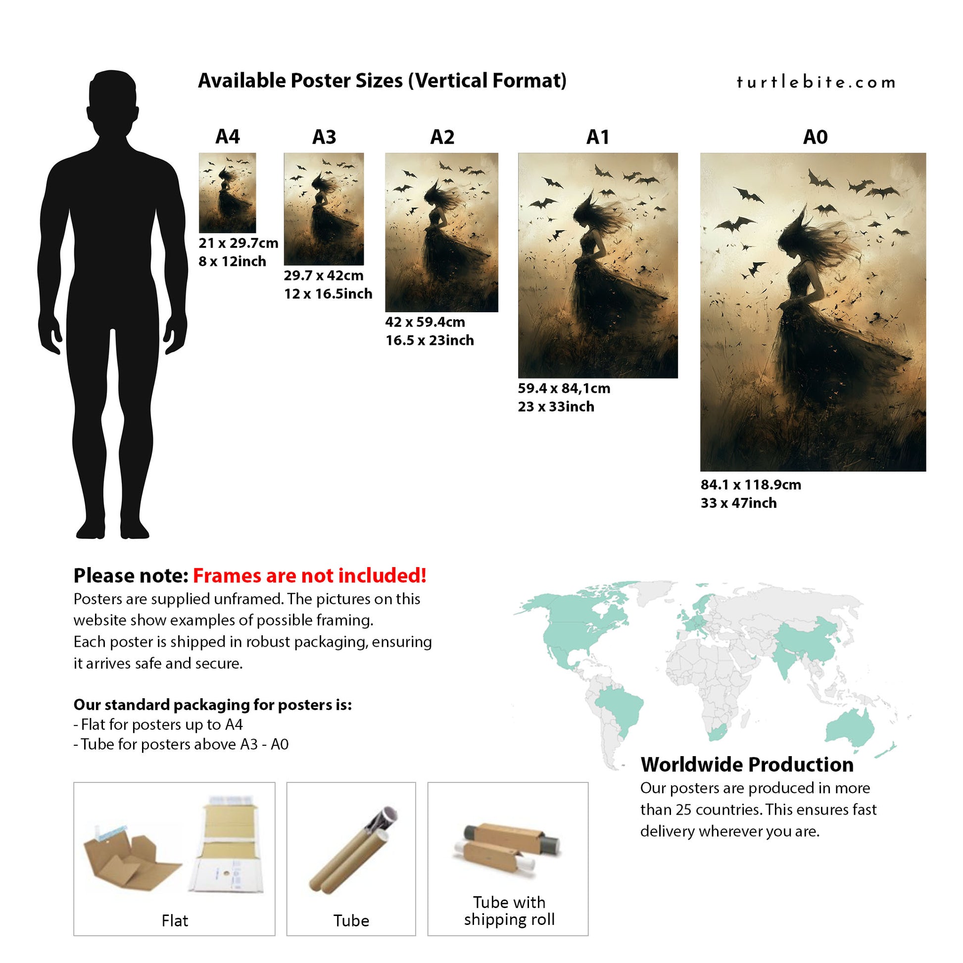 Different packaging depending on the size of the poster as well as the country where the item is produced and shipped to. Larger prints are carefully rolled and shipped in a tube, without framing included. Each of these products is crafted specifically for you upon ordering, so please allow a bit more time for delivery.