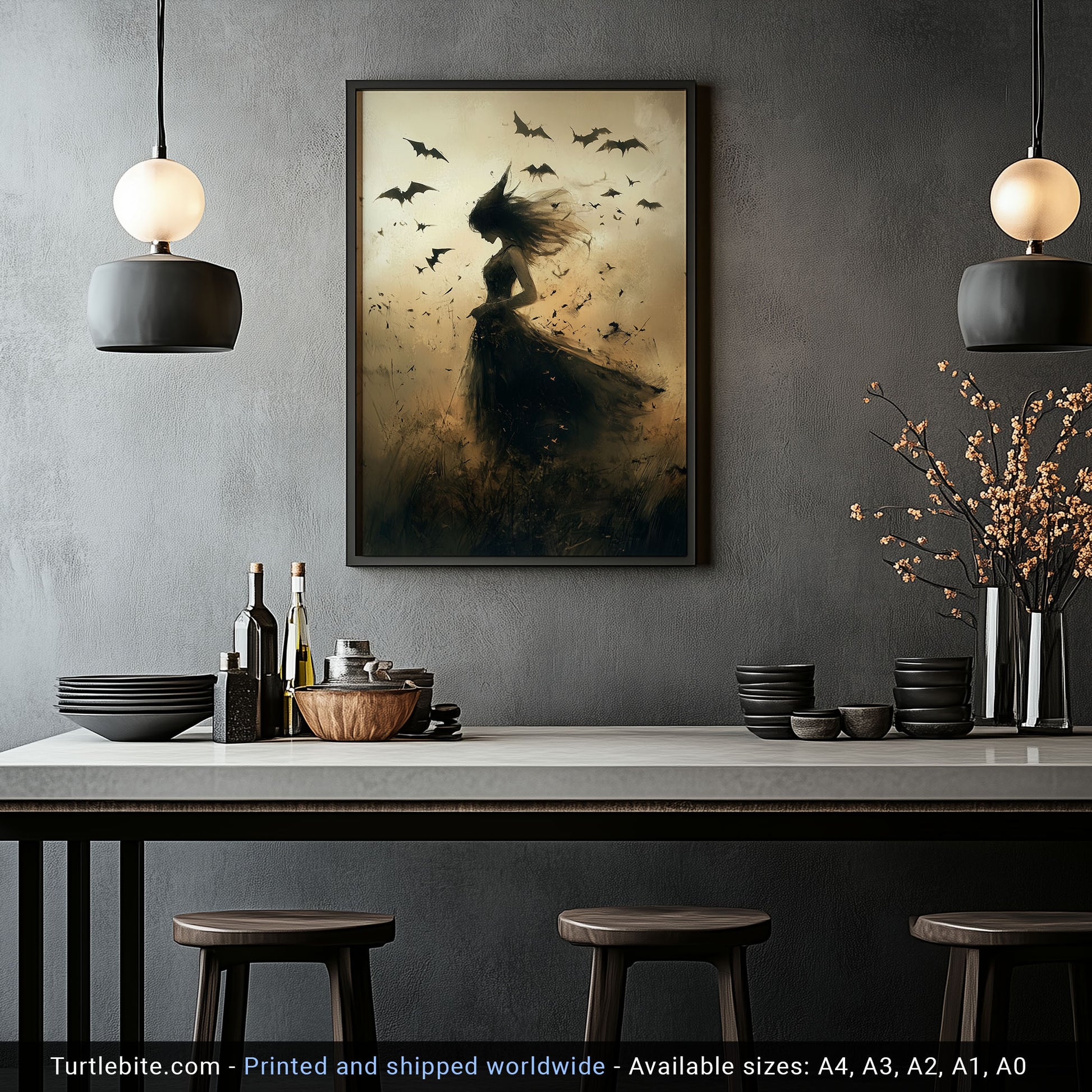 Mystical Witch & Bats Gothic Wall Art, Halloween Witch Poster Print, Dark Fantasy Home Decor