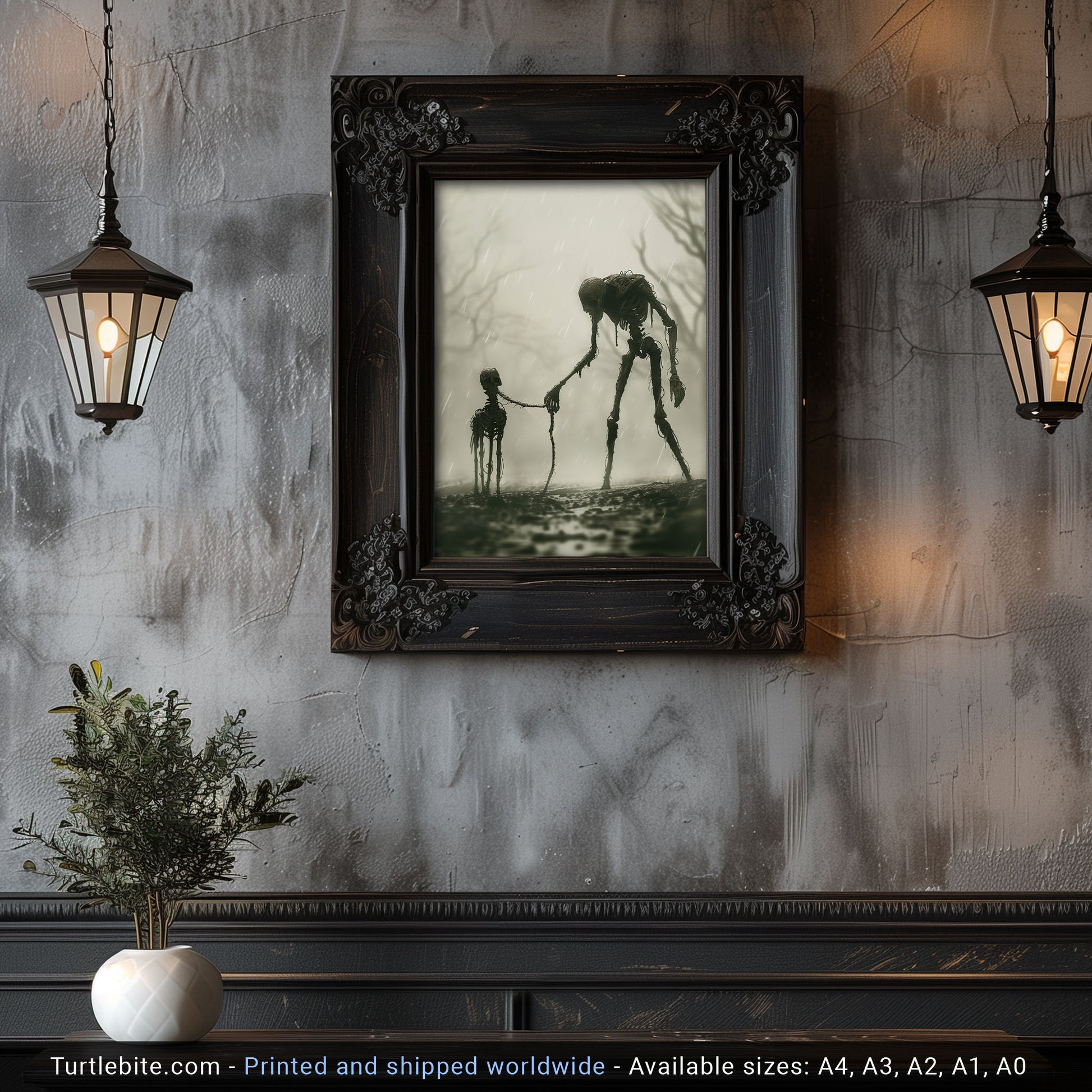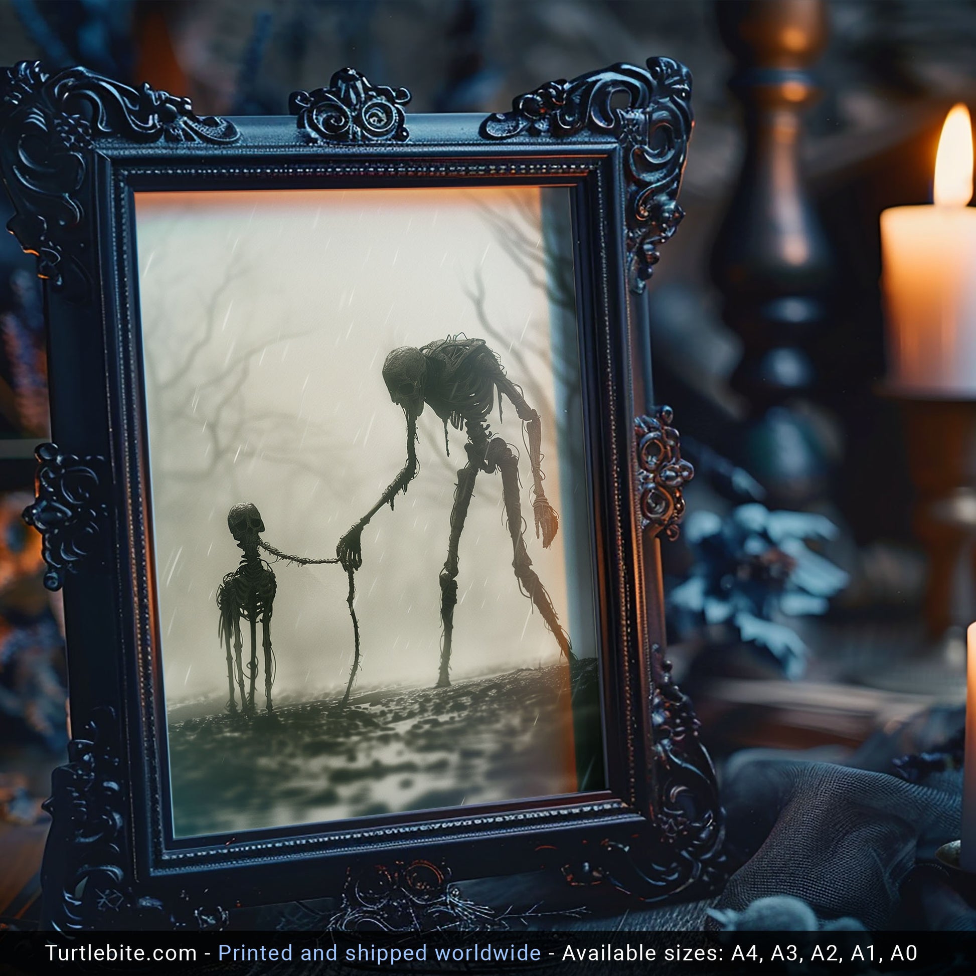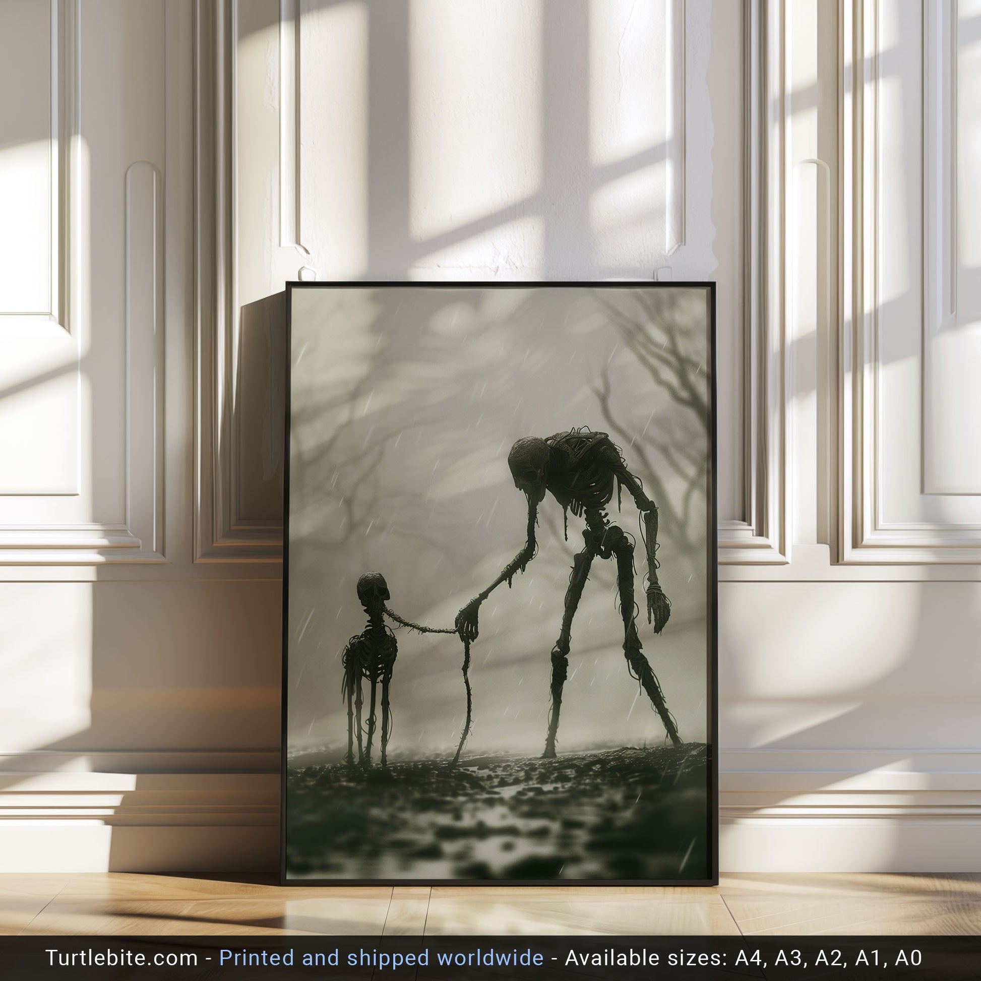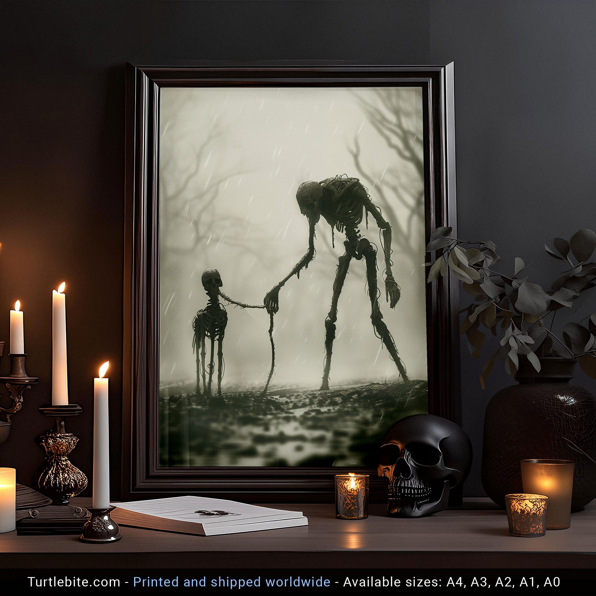 Introducing our Creepy Walking the Dog Poster, the perfect addition to any dark art collection. This unique art print features skeletal dog lovers taking a stroll in the rain, making it a truly eerie and captivating piece of rainy wall art. Whether you're a fan of the macabre or simply looking to add a touch of the unusual to your space, this poster is sure to spark intrigue and conversation. Add a hint of mystery and darkness to your home decor with this one-of-a-kind print.