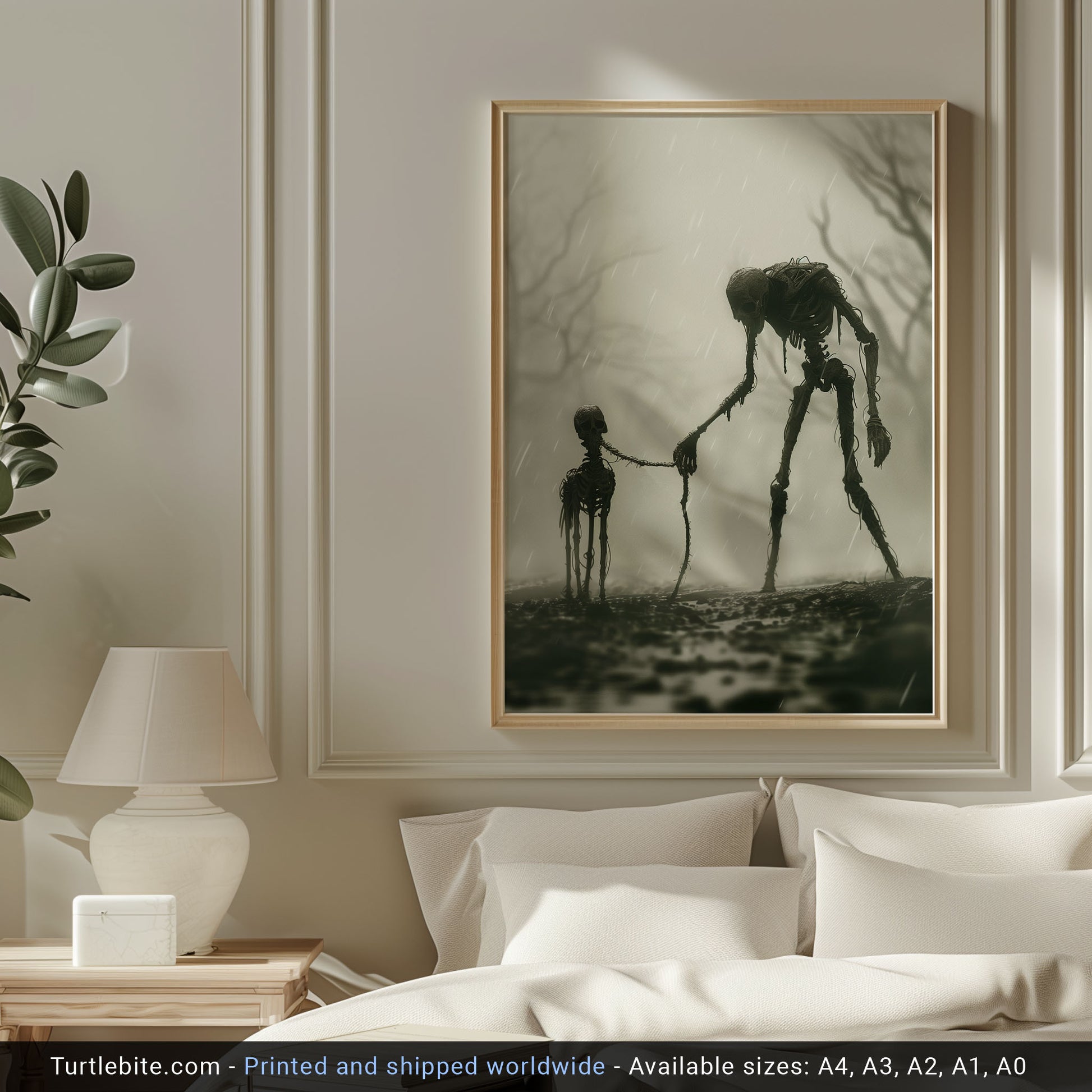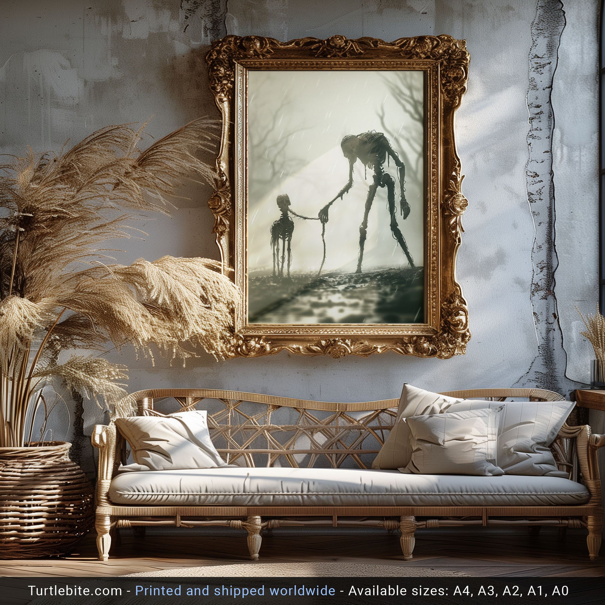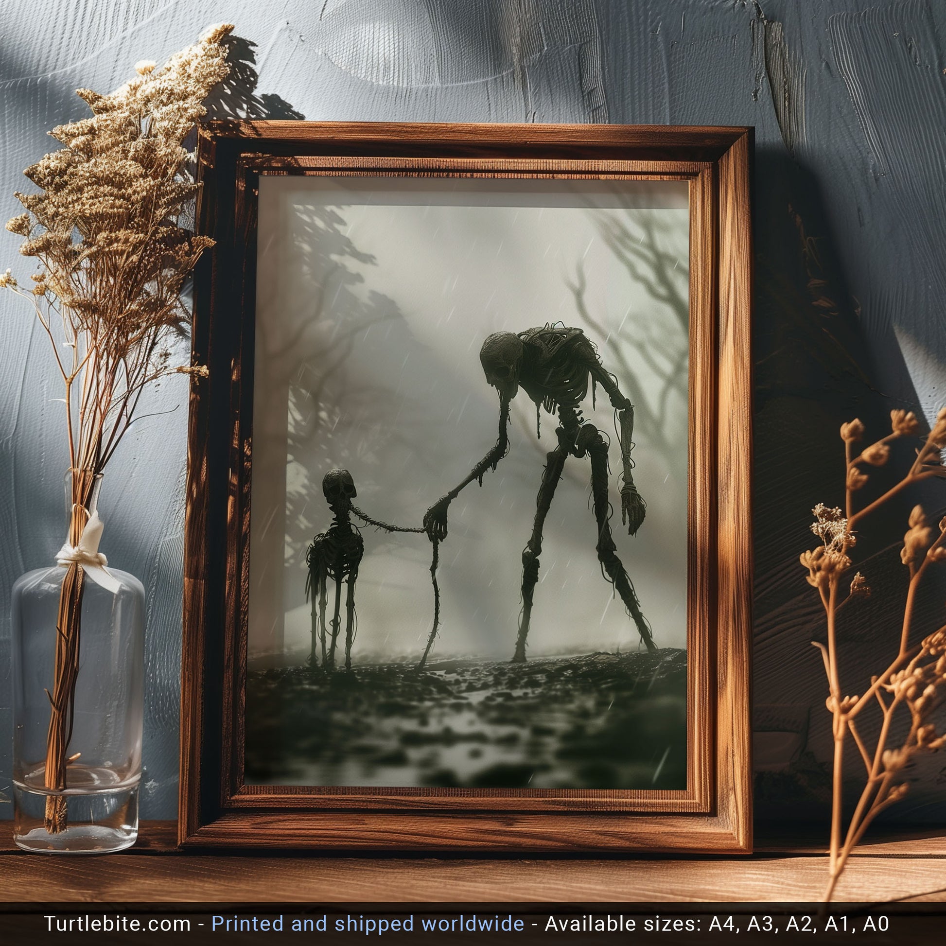 Introducing our Creepy Walking the Dog Poster, the perfect addition to any dark art collection. This unique art print features skeletal dog lovers taking a stroll in the rain, making it a truly eerie and captivating piece of rainy wall art. Whether you're a fan of the macabre or simply looking to add a touch of the unusual to your space, this poster is sure to spark intrigue and conversation. Add a hint of mystery and darkness to your home decor with this one-of-a-kind print.