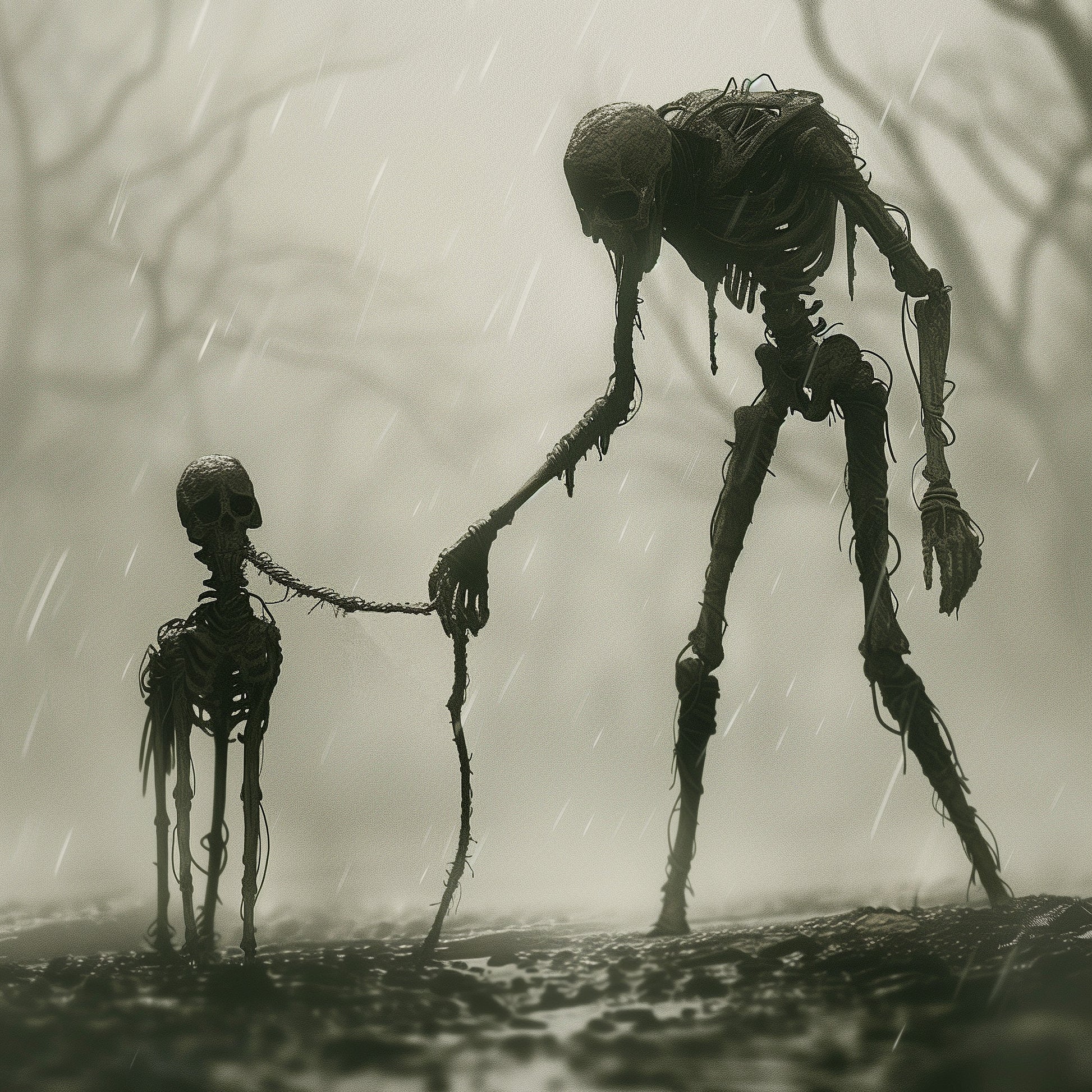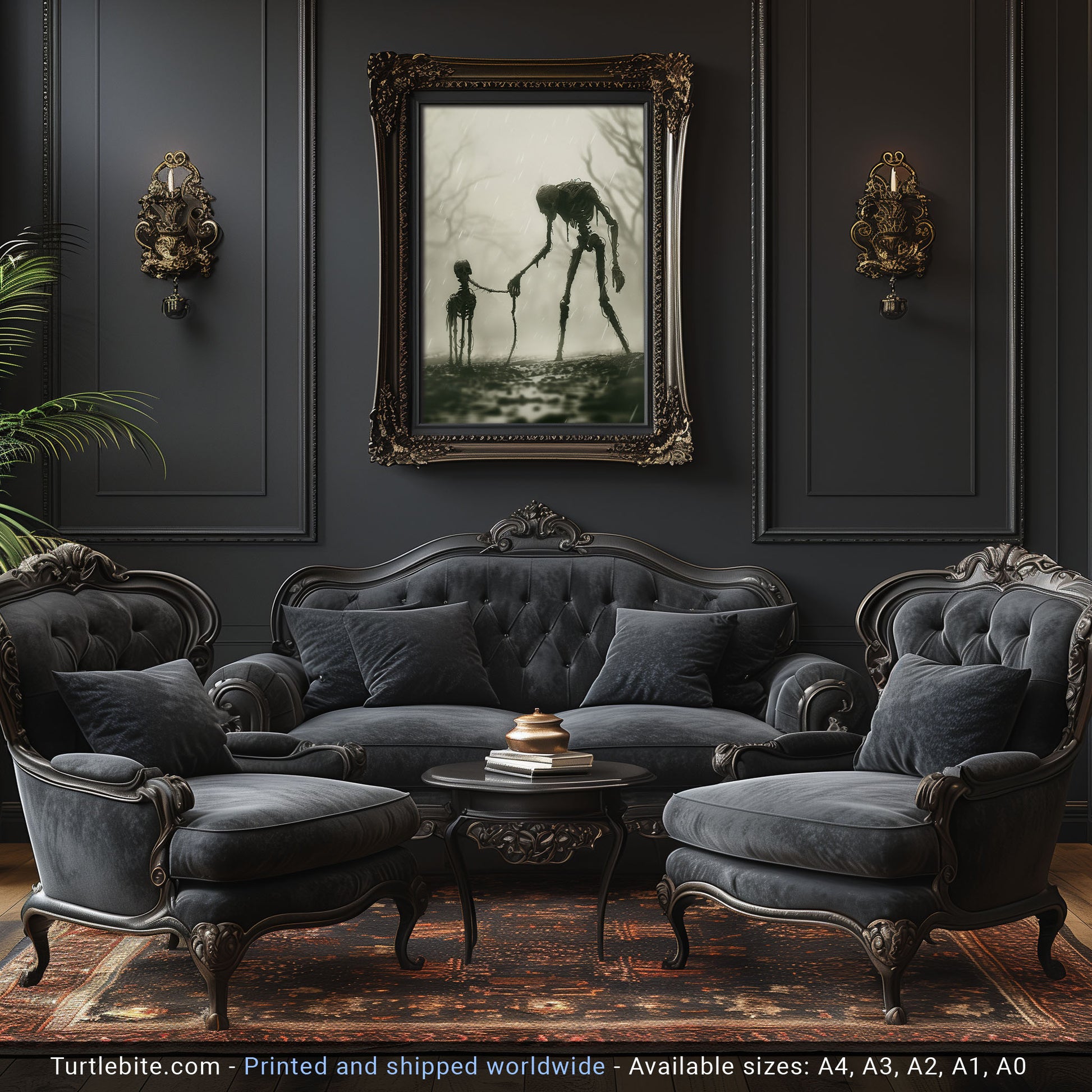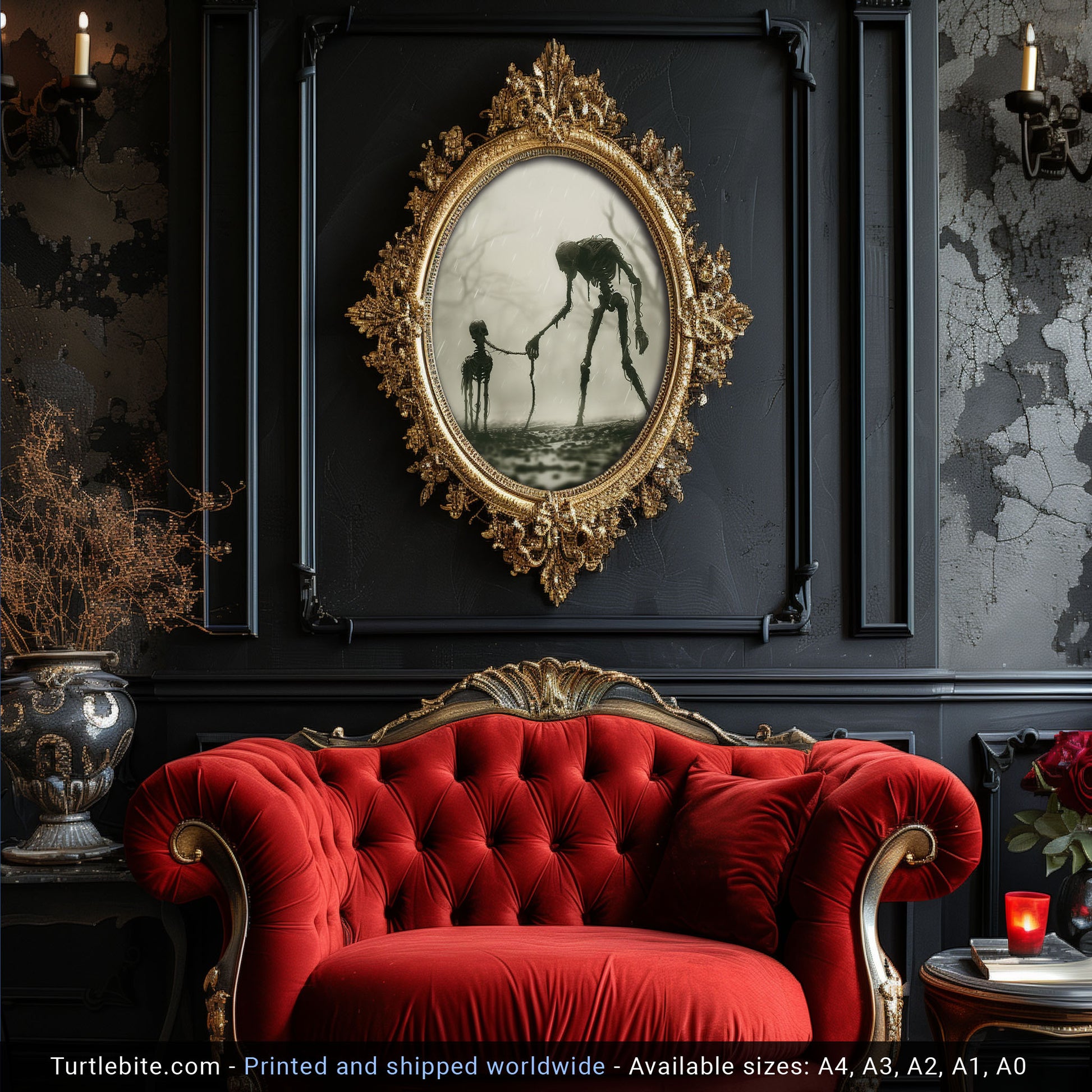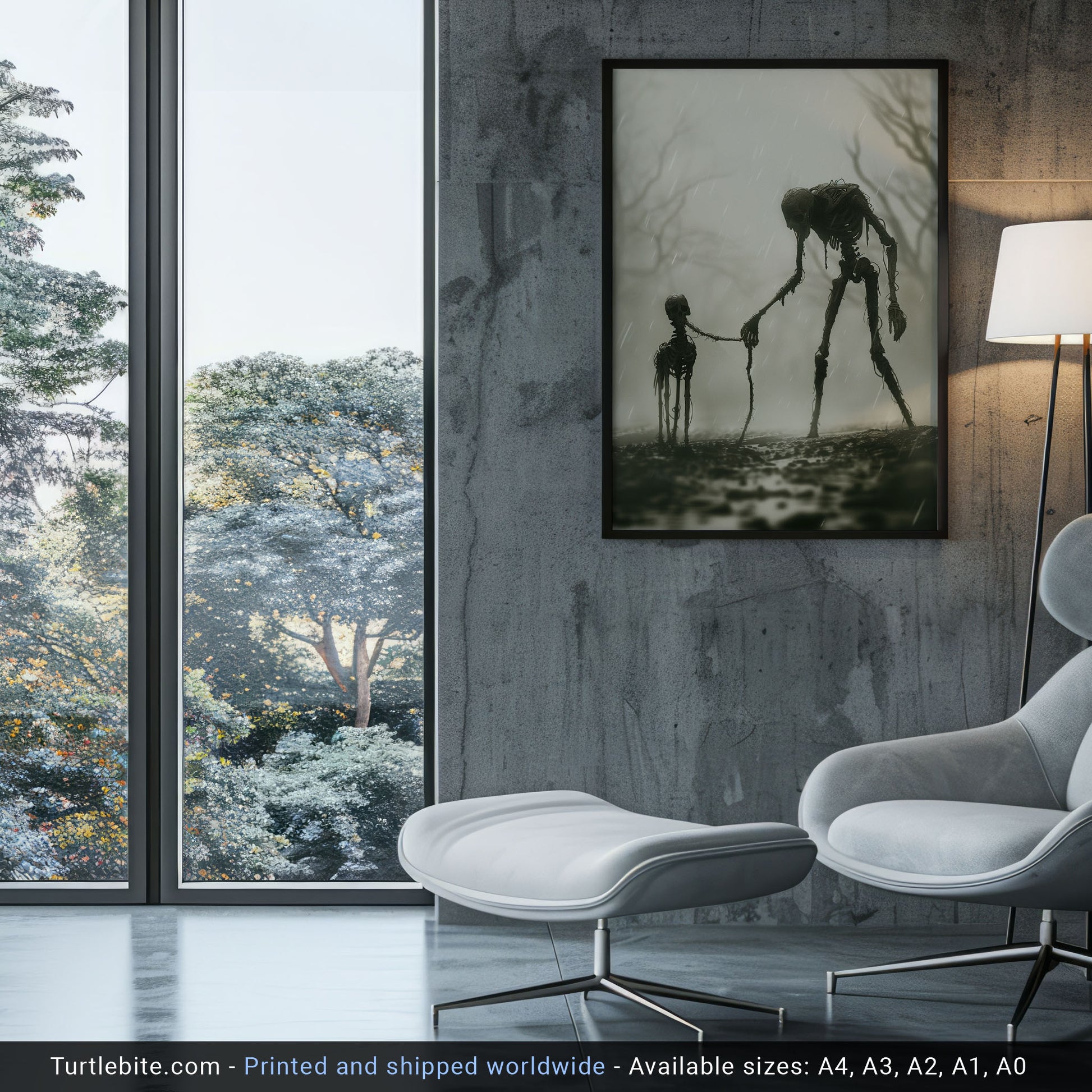 Introducing our Creepy Walking the Dog Poster, the perfect addition to any dark art collection. This unique art print features skeletal dog lovers taking a stroll in the rain, making it a truly eerie and captivating piece of rainy wall art. Whether you're a fan of the macabre or simply looking to add a touch of the unusual to your space, this poster is sure to spark intrigue and conversation. Add a hint of mystery and darkness to your home decor with this one-of-a-kind print.