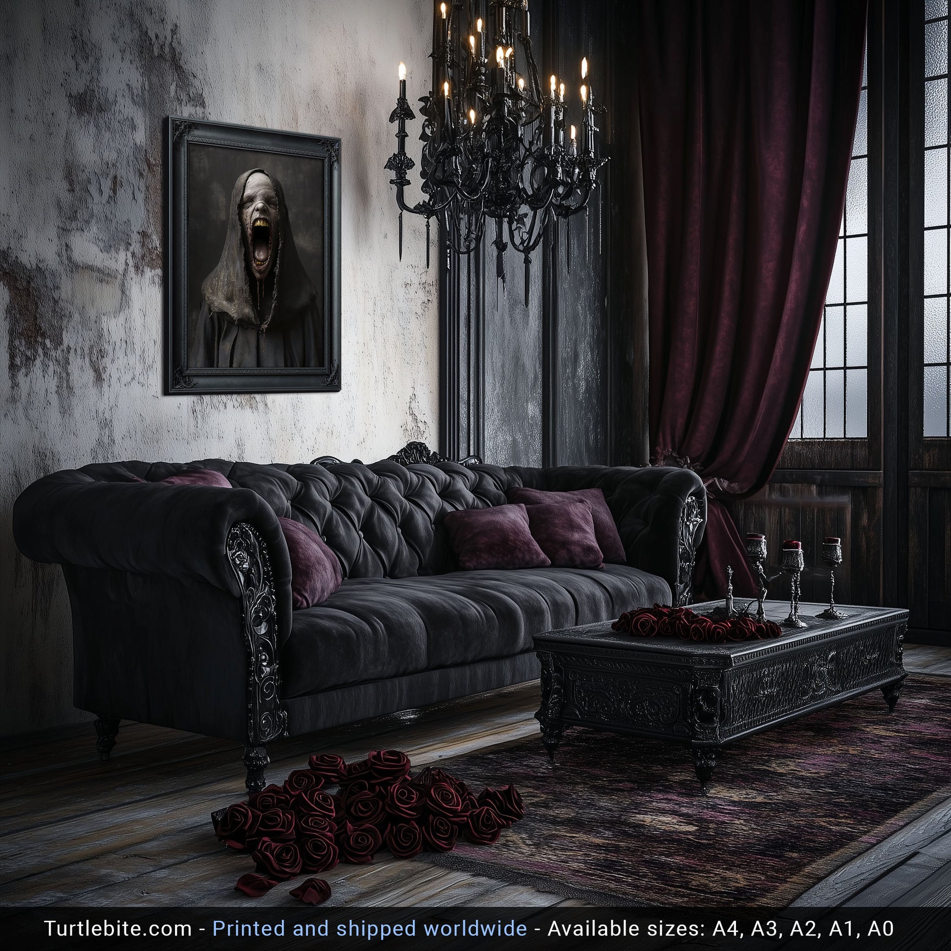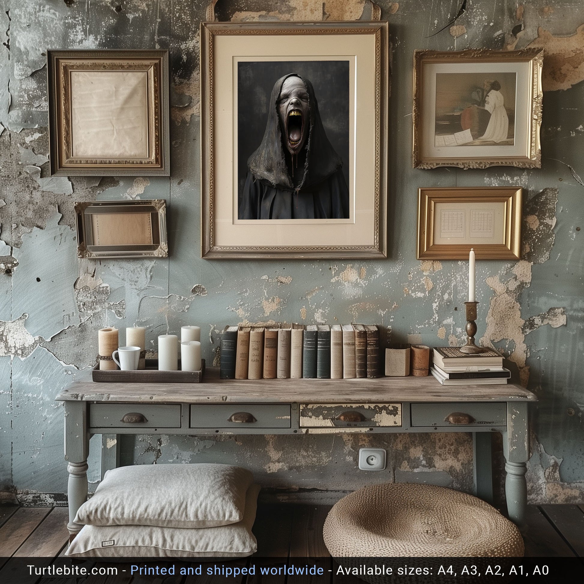 Turn your walls into a medieval screamfest with the 'Screaming Monk' poster—because nothing says 'inner peace' like a monk losing his. This dark, moody art print is bizarre, unsettling, and perfect for anyone who finds horror a little too silent. Hang it up, and let the existential dread do the talking.