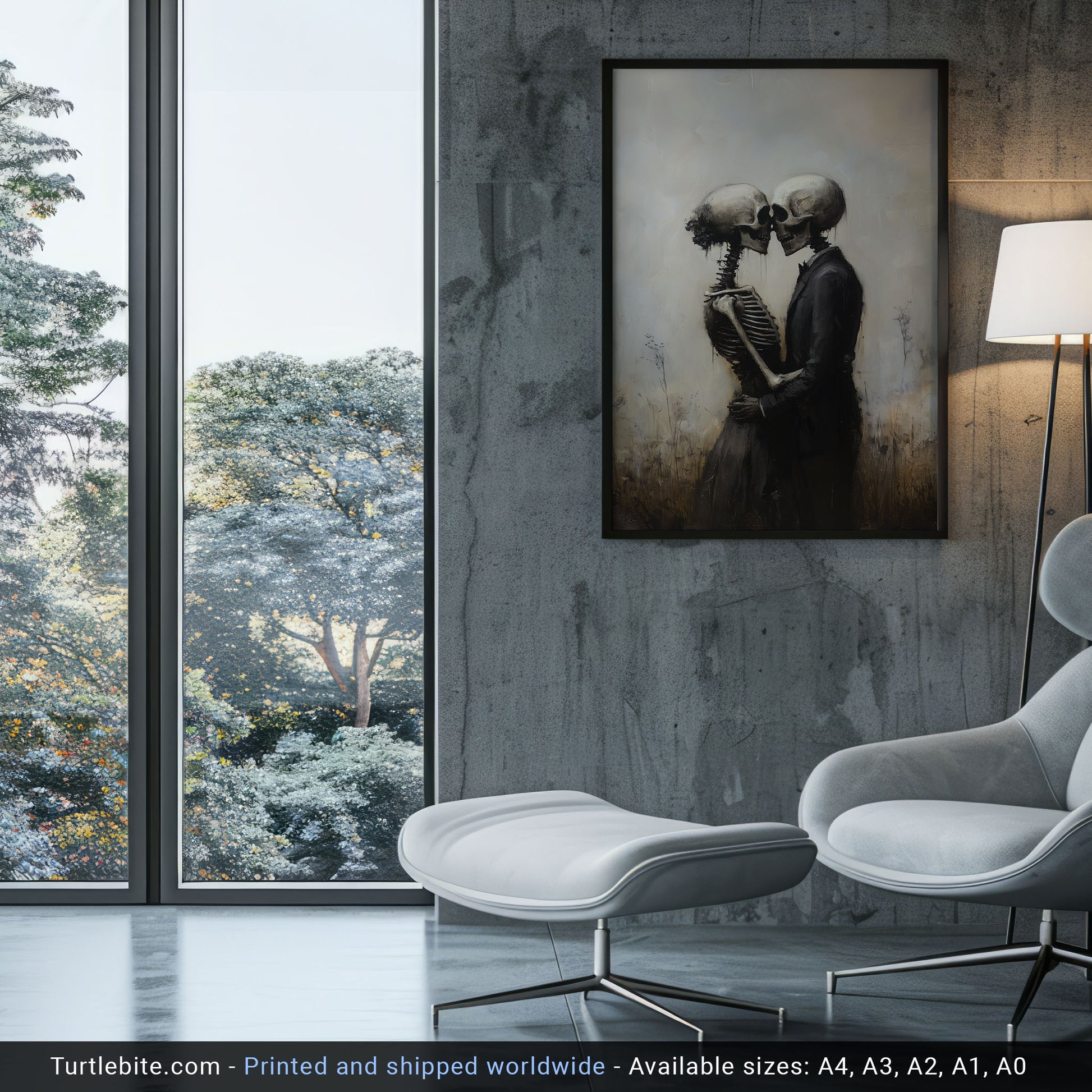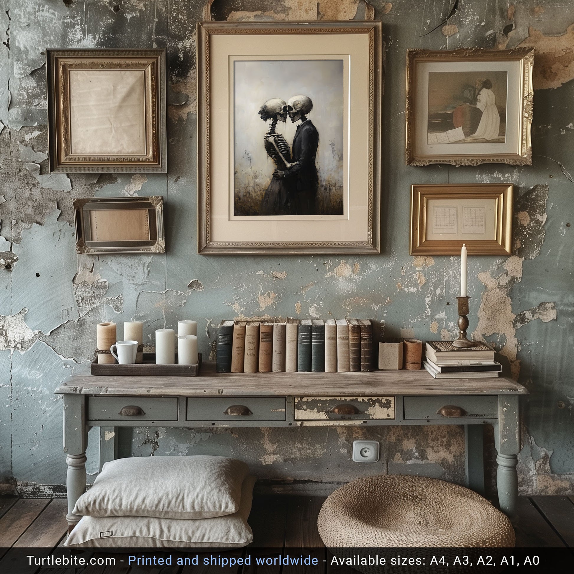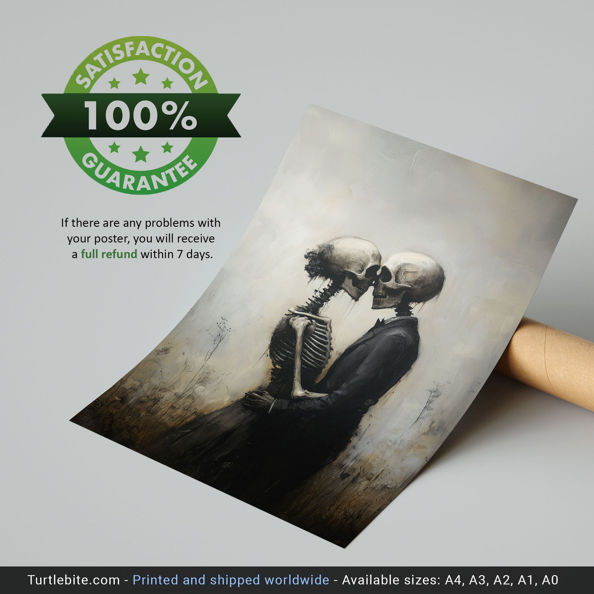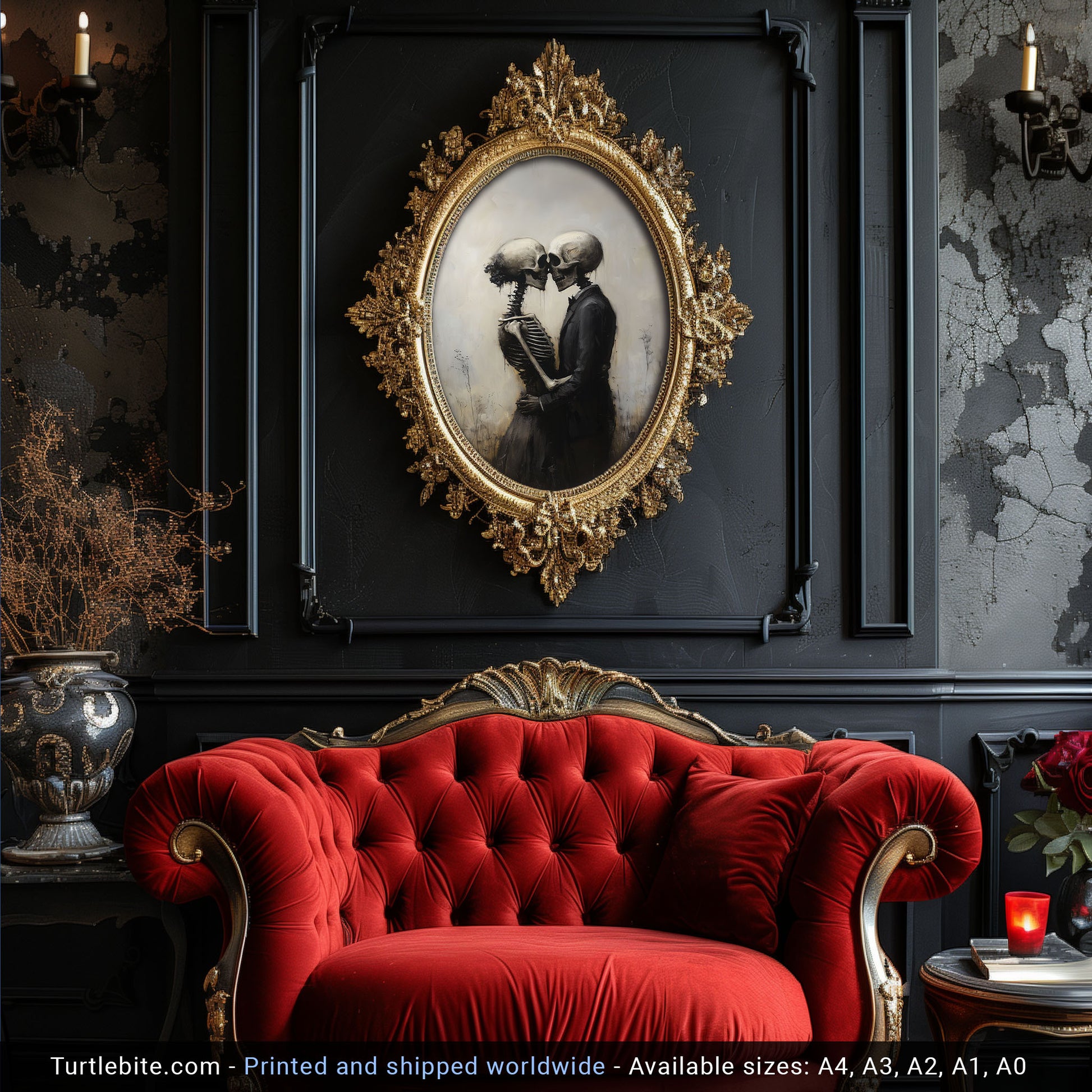 Introducing our captivating Skeletal Romance Painting - a hauntingly beautiful piece that emanates a sense of intrigue and mystery. This Dark Art Vintage Poster features stunning imagery that blends macabre elements with a touch of fine art elegance. Perfect for those with a taste for the unconventional, this unique artwork will add a touch of dark romance to any space. Add a touch of mystery and allure to your home decor with this one-of-a-kind statement piece.
