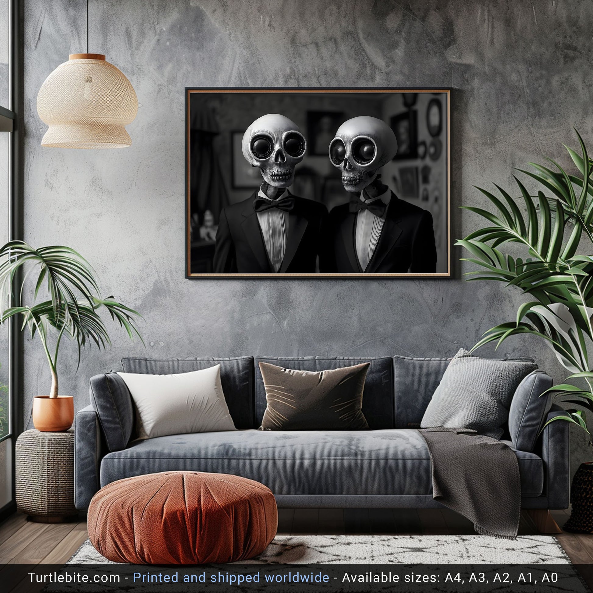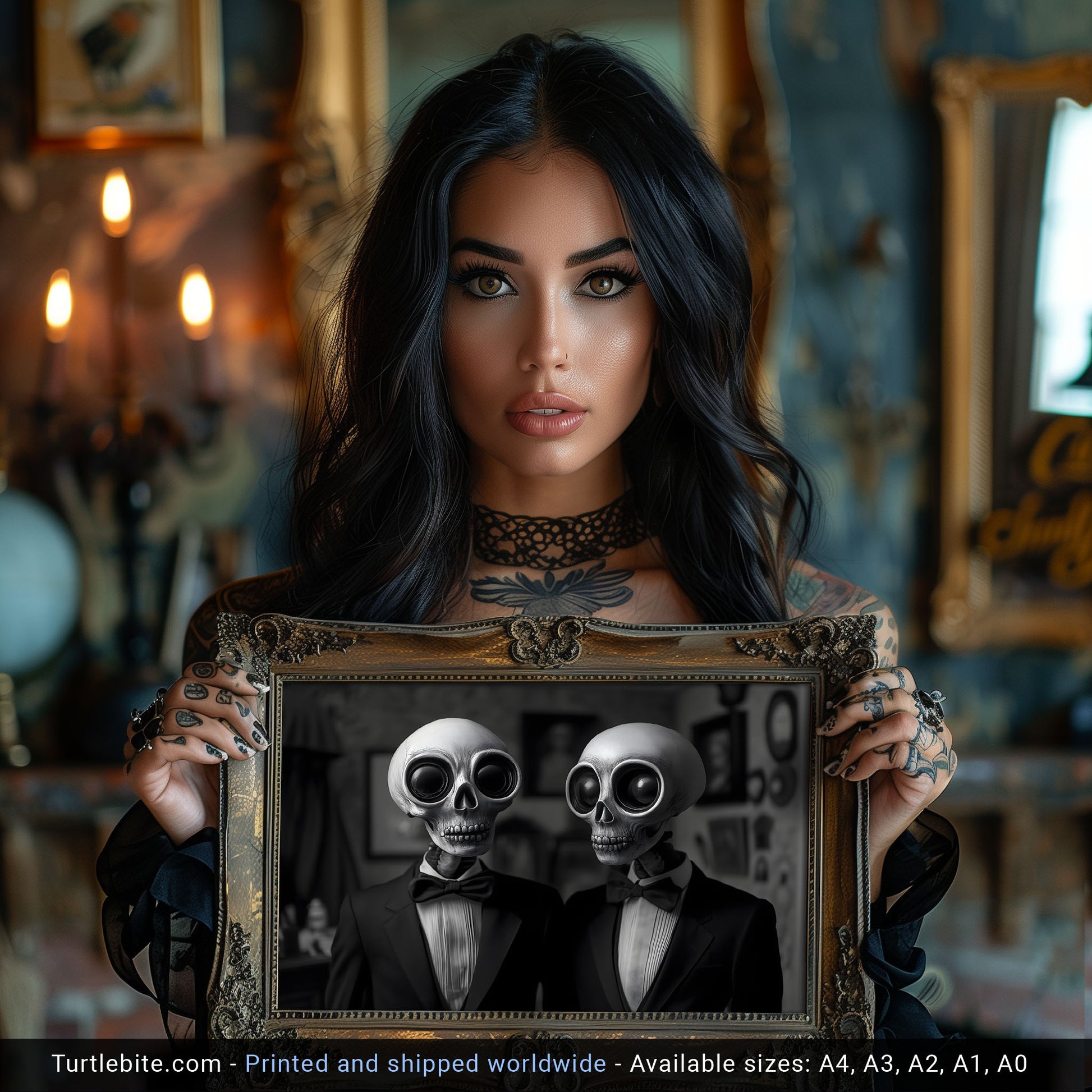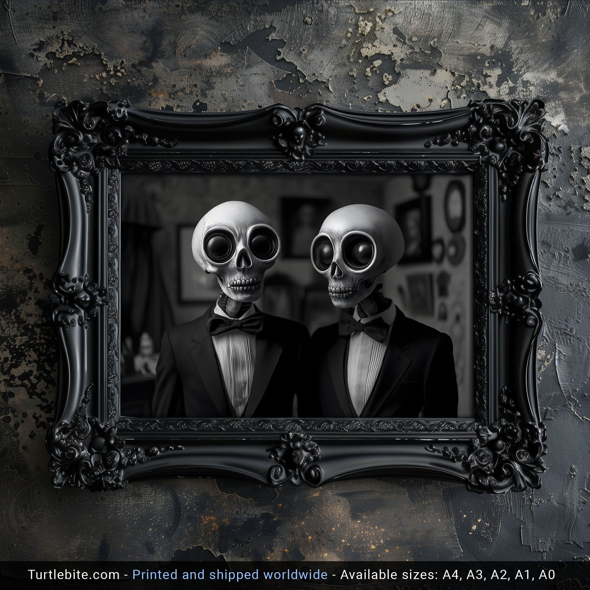 Two big-eyed skull friends venture out for dinner in this dark fine art print that embodies the essence of creepy black and white wall art. The striking contrast and intricate details of this piece create a mesmerizing visual experience that commands attention. Let these haunting characters grace your walls and infuse your space with a touch of the macabre. This poster is the perfect choice for those who appreciate art that challenges conventional norms and explores the darker side of creativity. Transform your room into a gallery of intriguing curiosities with this unique and evocative print that will linger in the minds of your guests. Elevate your decor with a hint of darkness and sophistication by embracing this captivating artwork.