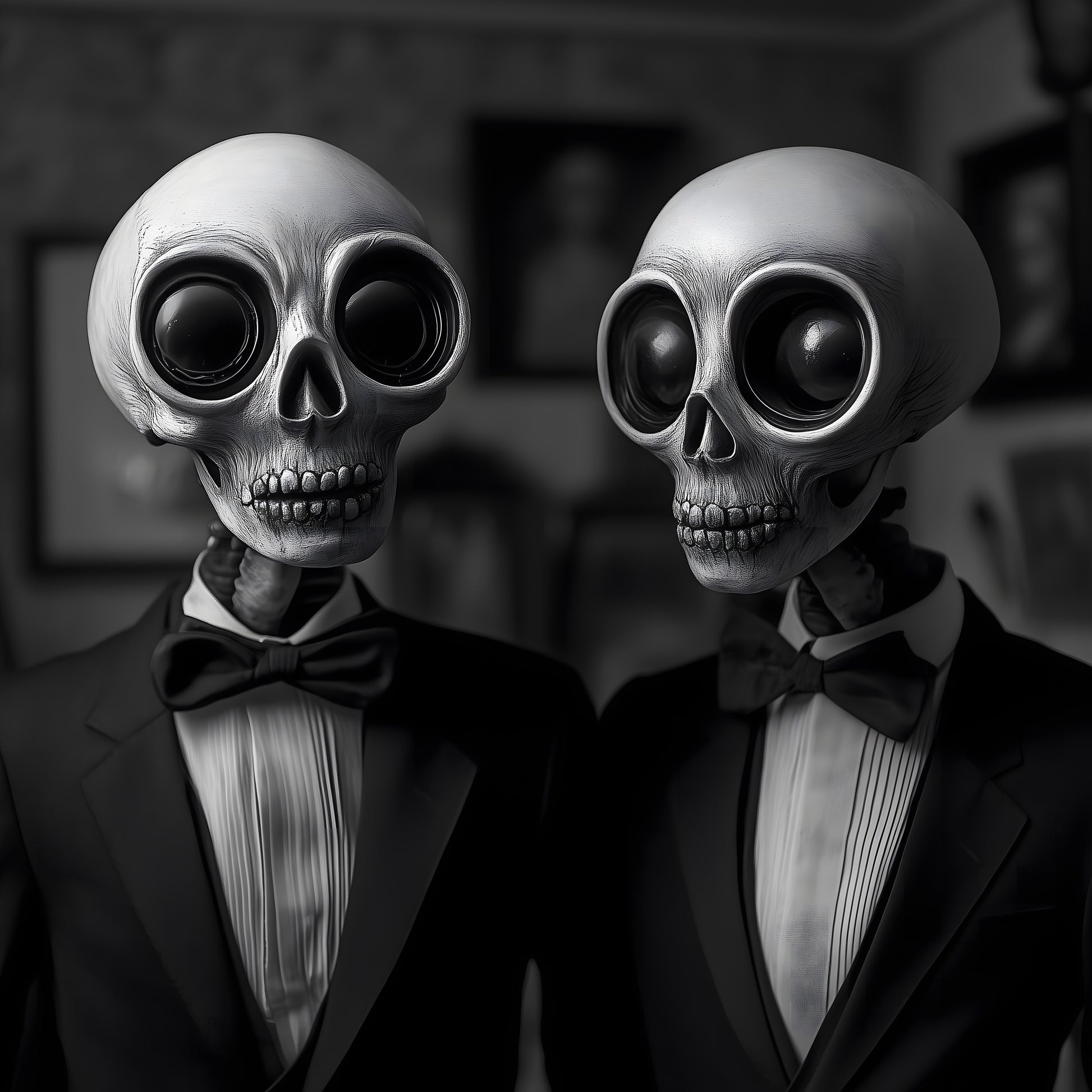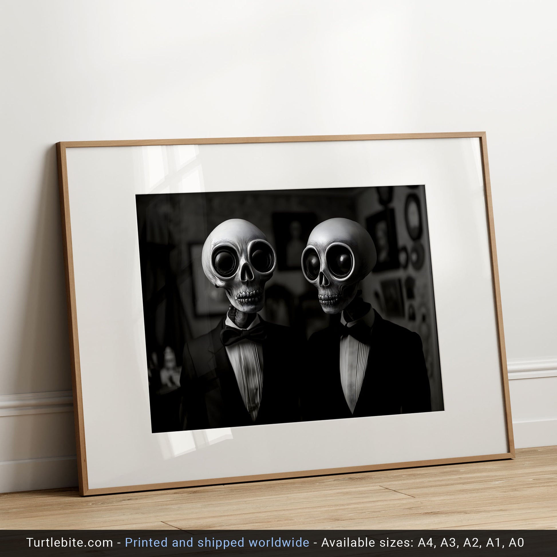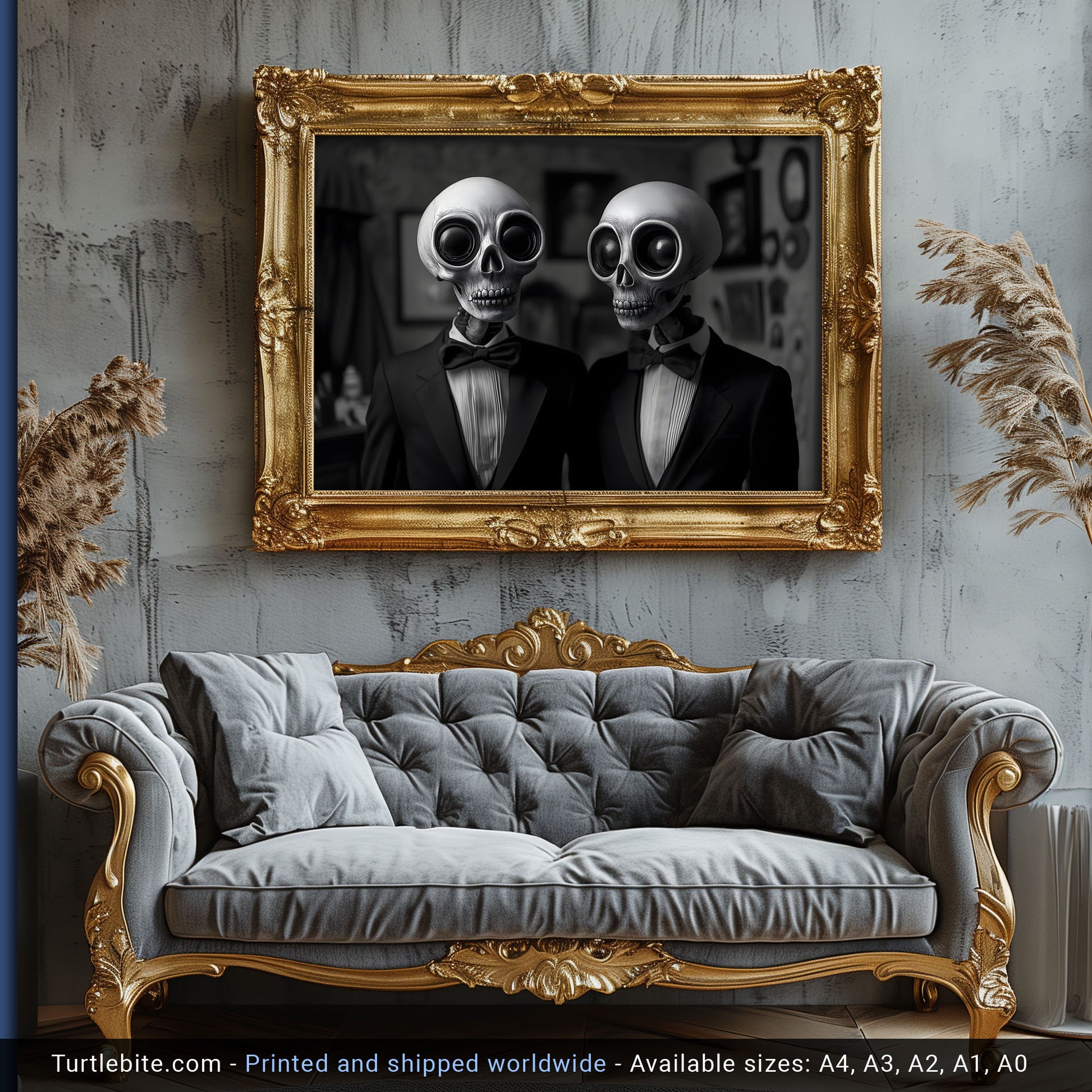 Two big-eyed skull friends venture out for dinner in this dark fine art print that embodies the essence of creepy black and white wall art. The striking contrast and intricate details of this piece create a mesmerizing visual experience that commands attention. Let these haunting characters grace your walls and infuse your space with a touch of the macabre. This poster is the perfect choice for those who appreciate art that challenges conventional norms and explores the darker side of creativity. Transform your room into a gallery of intriguing curiosities with this unique and evocative print that will linger in the minds of your guests. Elevate your decor with a hint of darkness and sophistication by embracing this captivating artwork.