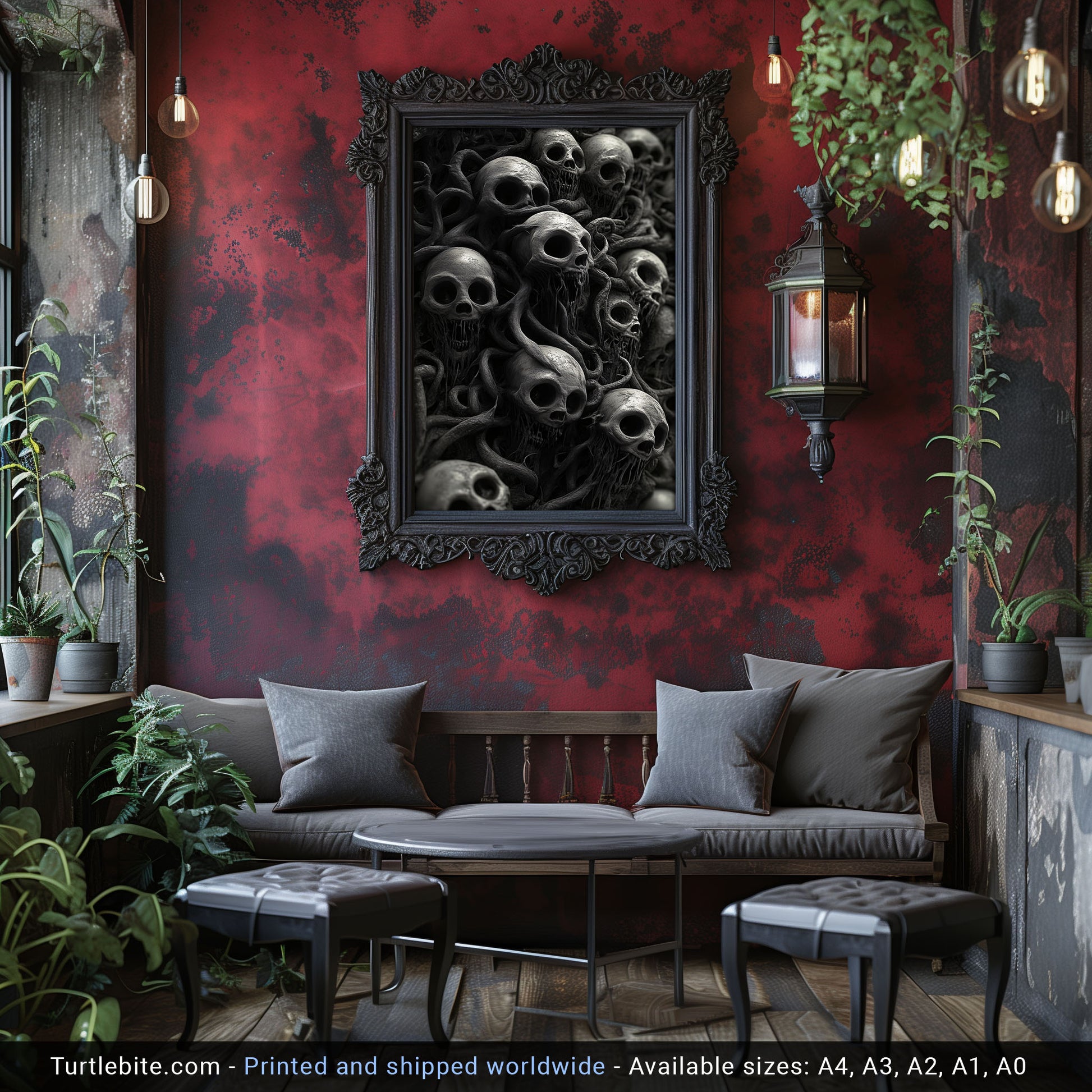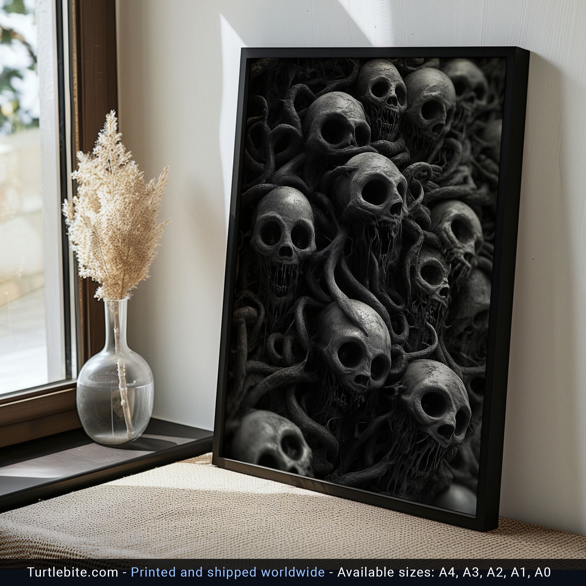 This Skull Wall Art is not your average spooky print. It’s a full-on visual descent into a gothic fever dream. A snarled mass of skulls, hollow eyes staring into the void, bound together by sinewy, almost organic tendrils. It’s beautiful, haunting, and weirdly hypnotic – perfect for anyone who’s ever wanted to hang a little existential dread in their living room.